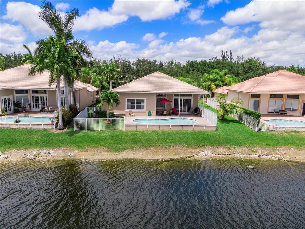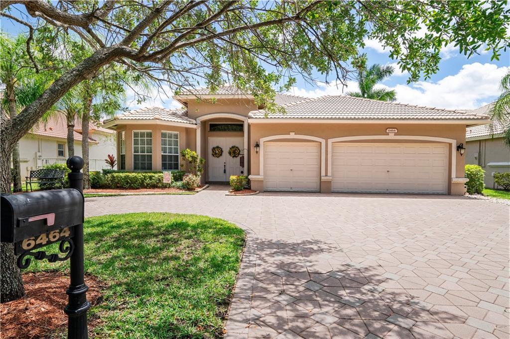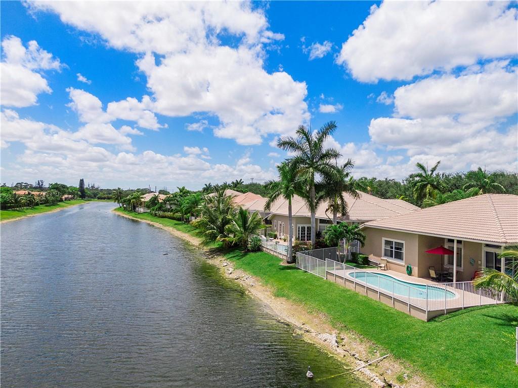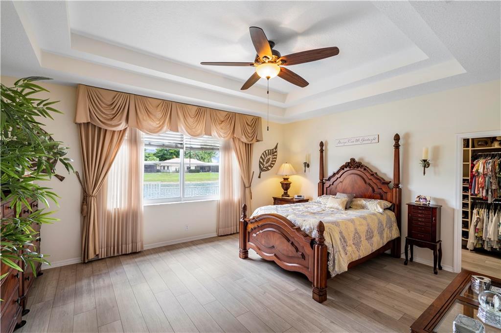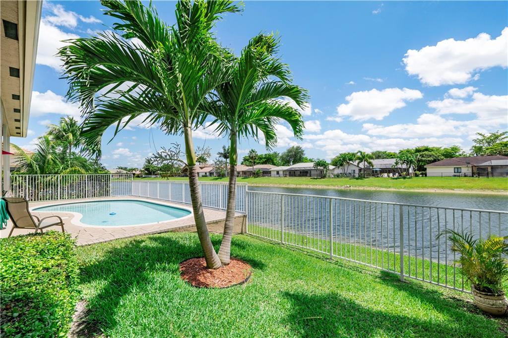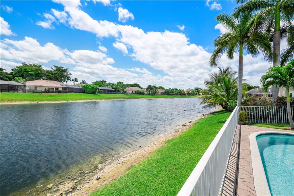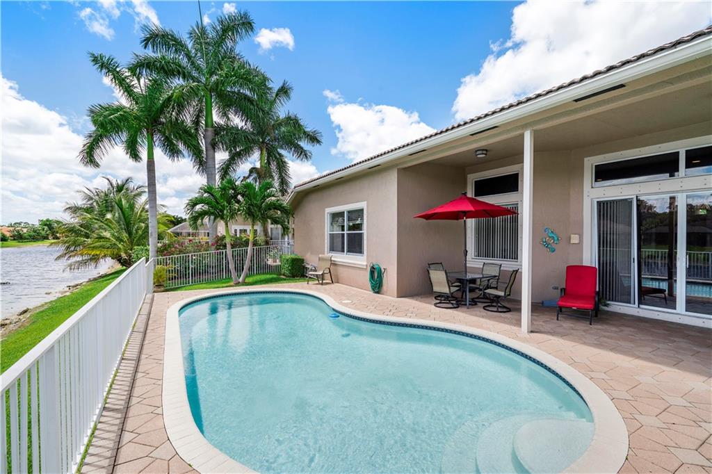 Beautiful and meticulously maintained home in Prestigious Grand Reserve on a waterfront lot. This home could easily be a 4 bdrm, converting the large den w/bay windows which makes it a triple split floor plan...brand new laminate wood floors in all bdrms, 3 full baths, open living area & spacious ,w/volume ceilings, kitchen has granite, double oven and overlooks peaceful pool area & lake, patio is shaded, fenced backyard, sprinklers pull from the lake, circular driveway, plenty of rm in the 3 car gar., can even fit a boat! hurr shutters, Resort style comm w/guard gate, clubhouse, pool, and centrally located.