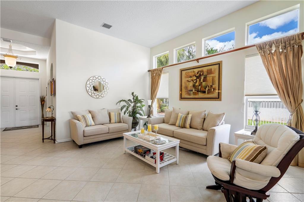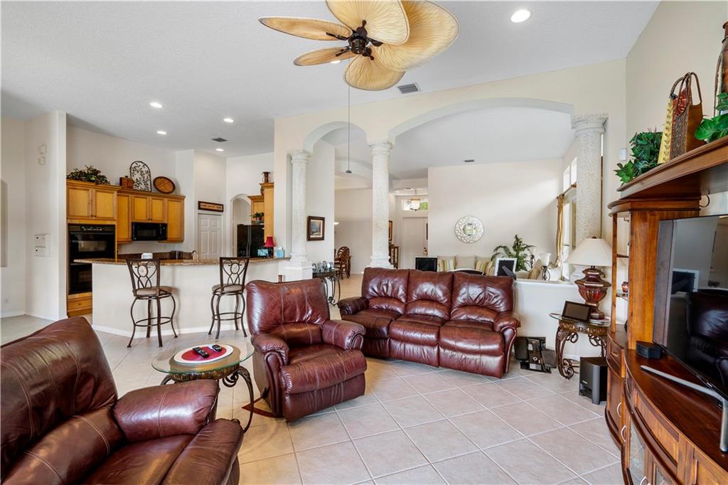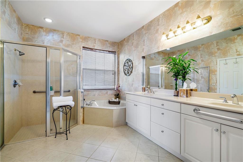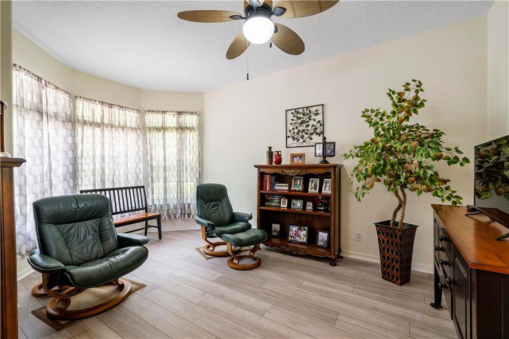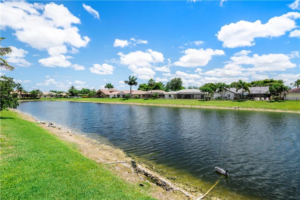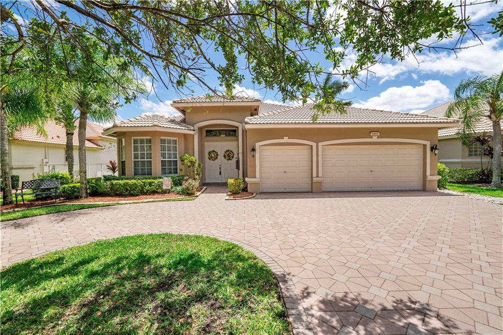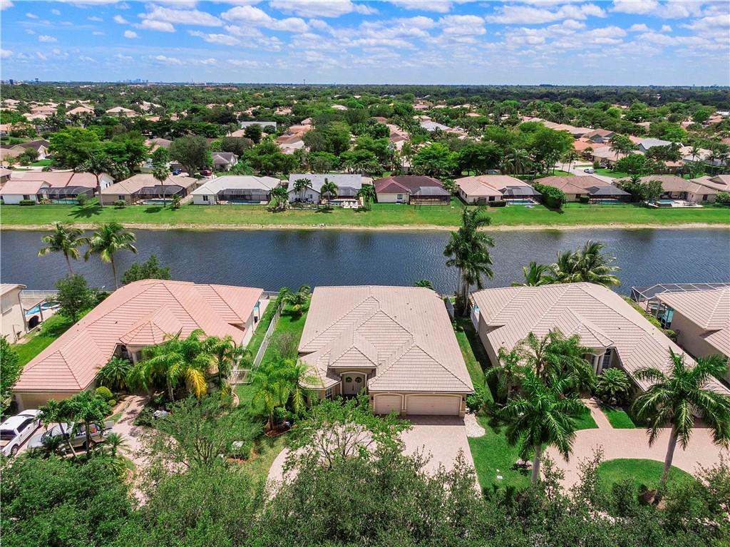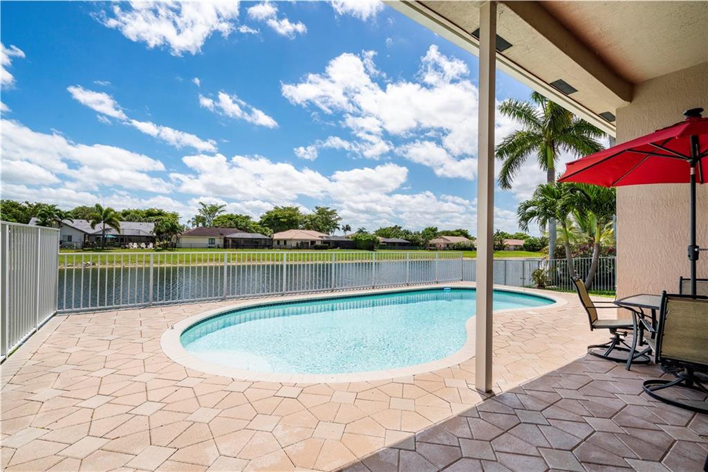 Beautiful and meticulously maintained home in Prestigious Grand Reserve on a waterfront lot. This home could easily be a 4 bdrm, converting the large den w/bay windows which makes it a triple split floor plan...brand new laminate wood floors in all bdrms, 3 full baths, open living area & spacious ,w/volume ceilings, kitchen has granite, double oven and overlooks peaceful pool area & lake, patio is shaded, fenced backyard, sprinklers pull from the lake, circular driveway, plenty of rm in the 3 car gar., can even fit a boat! hurr shutters, Resort style comm w/guard gate, clubhouse, pool, and centrally located.