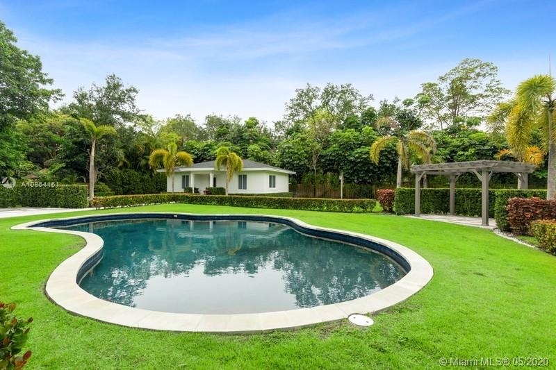 Stunning rebuilt & remodeled 2020 Pinecrest Home w/ FULL GUEST HOUSE on 1 acre. New roof, plumbing, electric, & impact windows/doors. Top of the line finishes & quality. Main residence boasts 4 bedrooms, den, & 4.5 bathrooms. Spanish porcelain floors flow throughout open floor plan. Kitchen has 3 ovens, sub zeros, island, & sitting area. Guest house features 1 bedroom, 1 bathroom, walk-in closet, kitchen, laundry & living area. Homes are surrounded by salt water resort style pool, expansive covered outdoor area for outdoor entertaining, & large back yard with enough room to install a tennis court. Family neighborhood on desirable low traffic street with mature trees perfect for close walks to the park and bike rides. Exterior features 3 electric gates & circular driveway.