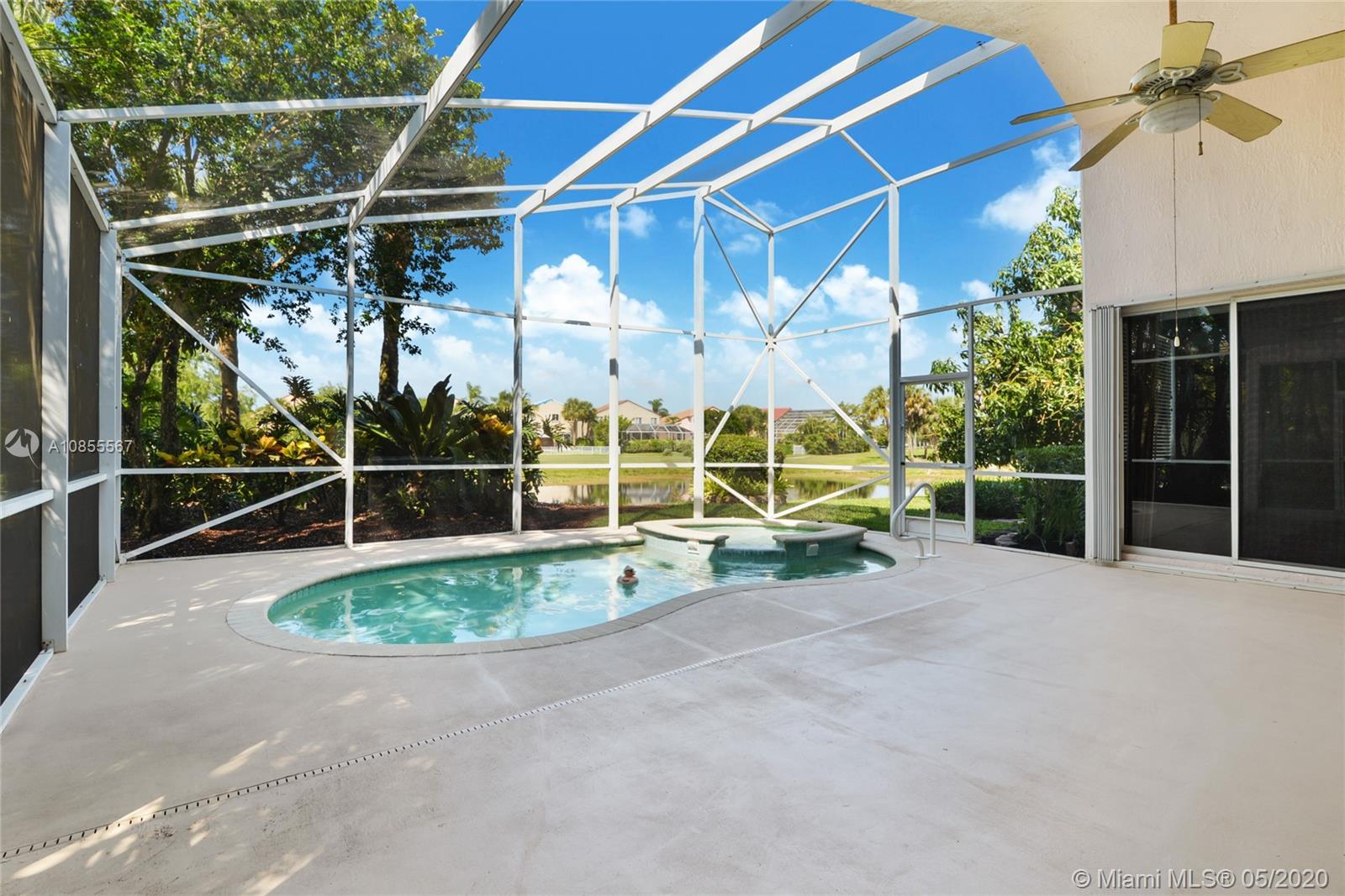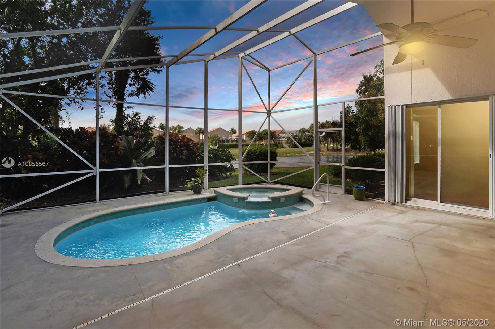 Beautiful home in prestigious Grand Palms community featuring lush landscaping, jogging paths, child playground. Gorgeous views with Mediterranean designed residences and resort style Golf and Country Club.Triple view of pool, lake and golf course. Open layout, vaulted ceilings. 3 bedrooms plus den/office. Tiled and carpeted bedrooms.Granite counter tops in kitchen. BRAND NEW ROOF! Enclosed patio and pool. Accordion shutters. Mandatory HOA covers; house paint every 5 years, 24 hr guarded gated community and security patrol, landscape maintenance exterior pest control and basic cable. On Supra