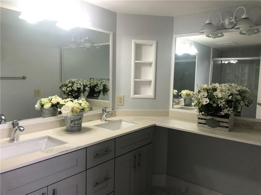 Move-in ready, 3 bed/3.5 bath Townhouse in popular Boca Gardens. Each bedroom has an en-suite bathroom. Two bedrooms downstairs, including master. Master bathroom beautifully remodeled. New kitchen features stainless steel appliances, granite counters, new cabinetry & hi-hat lighting. Private bedroom upstairs with great views of the lake. One car garage with washer, dryer & storage. Huge screened patio with storage area & room for a pool.