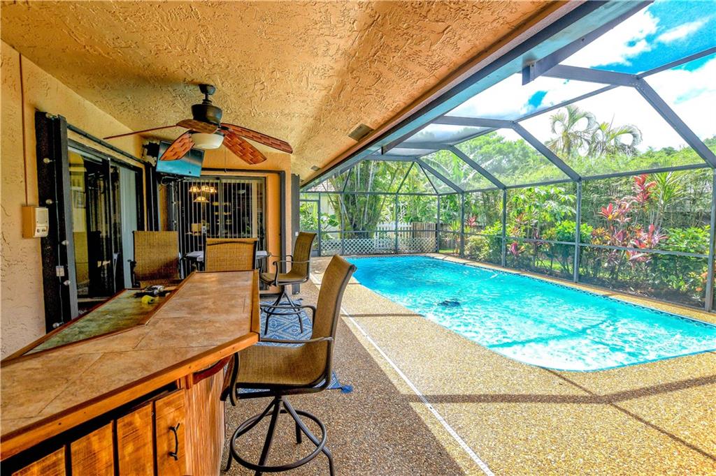 Imagine yourself here! Open floor plan perfect for entertaining while still providing privacy. Enjoy views of the backyard oasis from the kitchen, family room & living room. Spacious kitchen features upgraded wood cabinets, granite, stainless appliances, island plus breakfast area. Holiday gatherings will be a breeze! All bedrooms are generously sized. Plantation shutters stay. Updated bathrooms! Master bathroom has a cabana door to the tropical pool area. Relaxation is a step away as the bar and TVs stay! All windows have accordion shutters; garage door is Miami-Dade approved. Updated electrical panel. This beautifully maintained home is situated on a cul-de-sac close to shopping and highways for easy commuting. Fern Glen Park is a short walk, as are the schools. It's a winning decision!