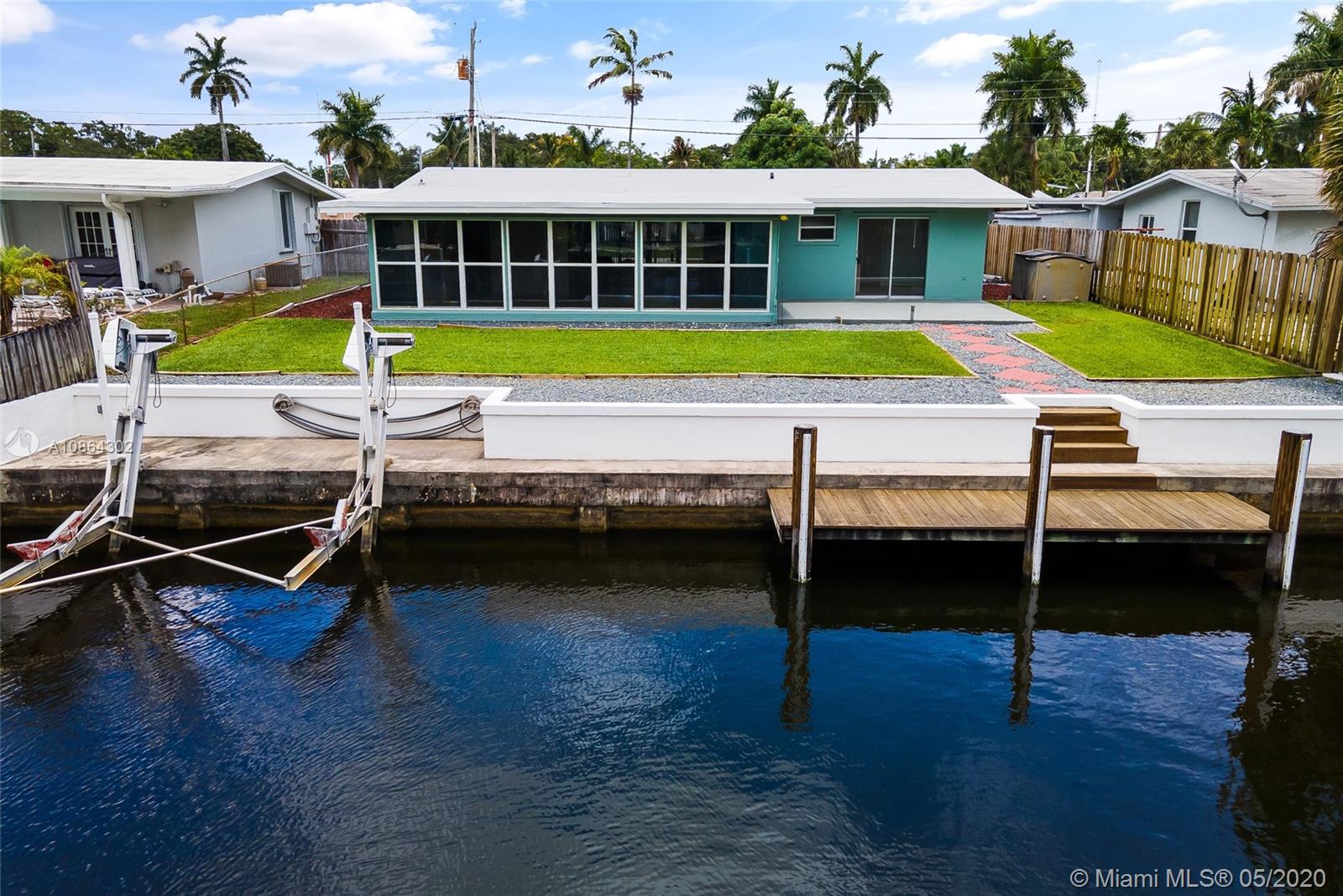 Spacious waterfront home with ocean access in Lauderdale Isles (Riverland) features 3 bedrooms, 2 bathrooms, 1-car garage, new roof (2019), 2 A/C units (2020 and 2013), built-up seawall w/ footers & tiebacks, updated wood dock w/ 3 pilings, 10,000lb boat lift w/ access to electric & plumbing, laundry room w/ storage, soaring vaulted wood ceilings, tile flooring throughout, newly painted interior and exterior, lots of natural lighting, updated windows and hurricane shutters, updated electrical, 65ft waterfront footage, 60ft canal width, and the only fixed bridge is I-95 (just over 50ft). Prime location on a dead-end street, minutes from highway, downtown and the beaches, and less than a mile away from public boat ramp. Check out the Virtual Tour (Matterport) for an exclusive online tour.
