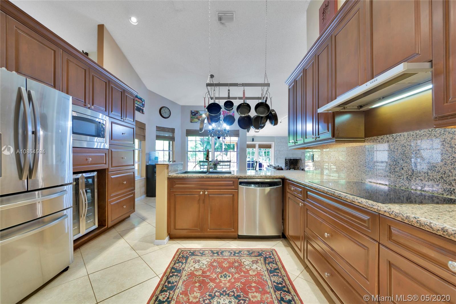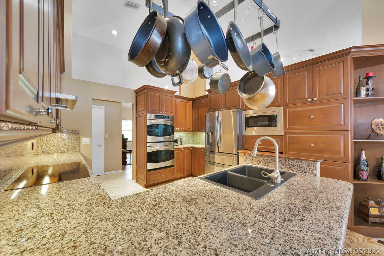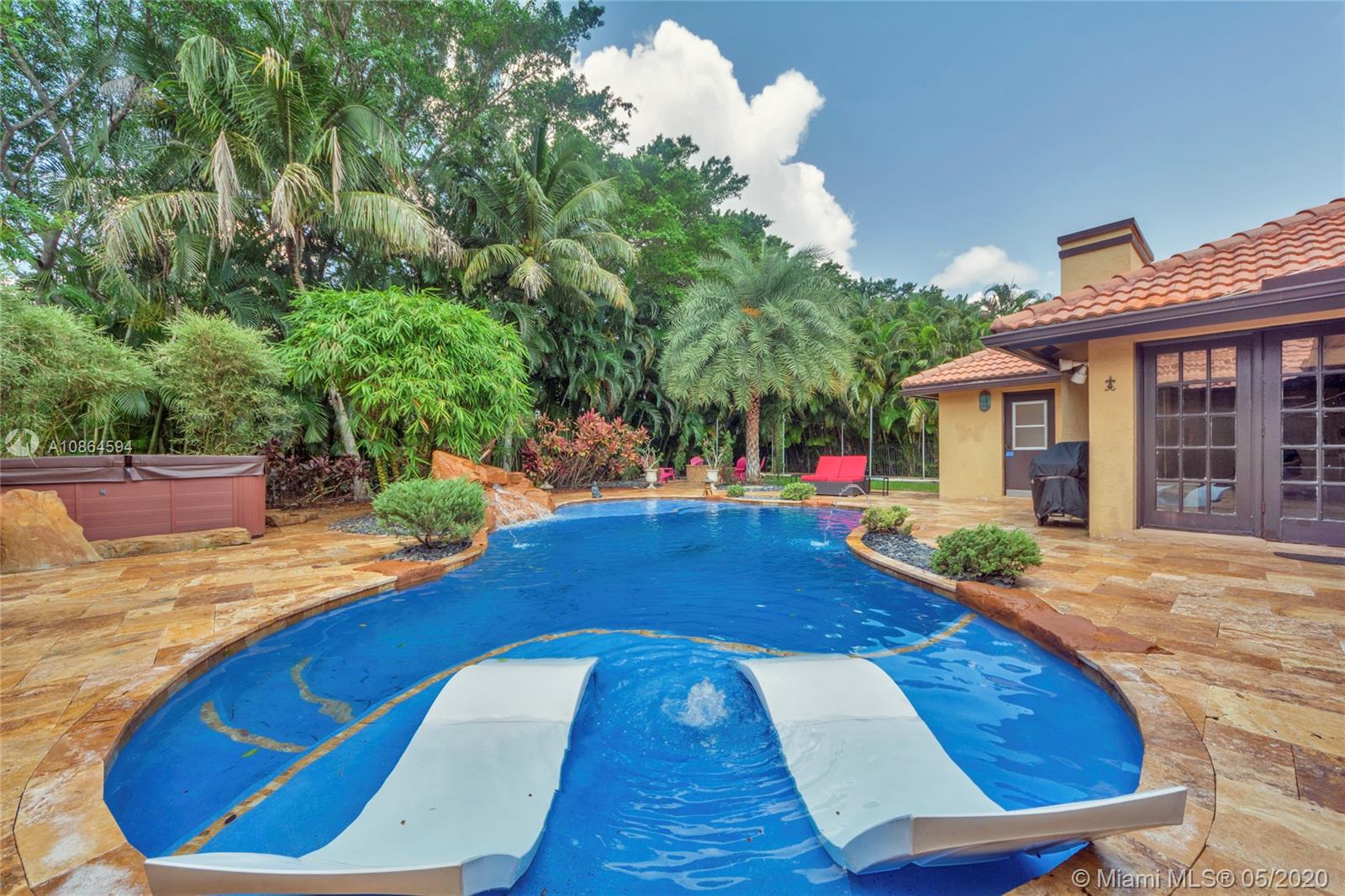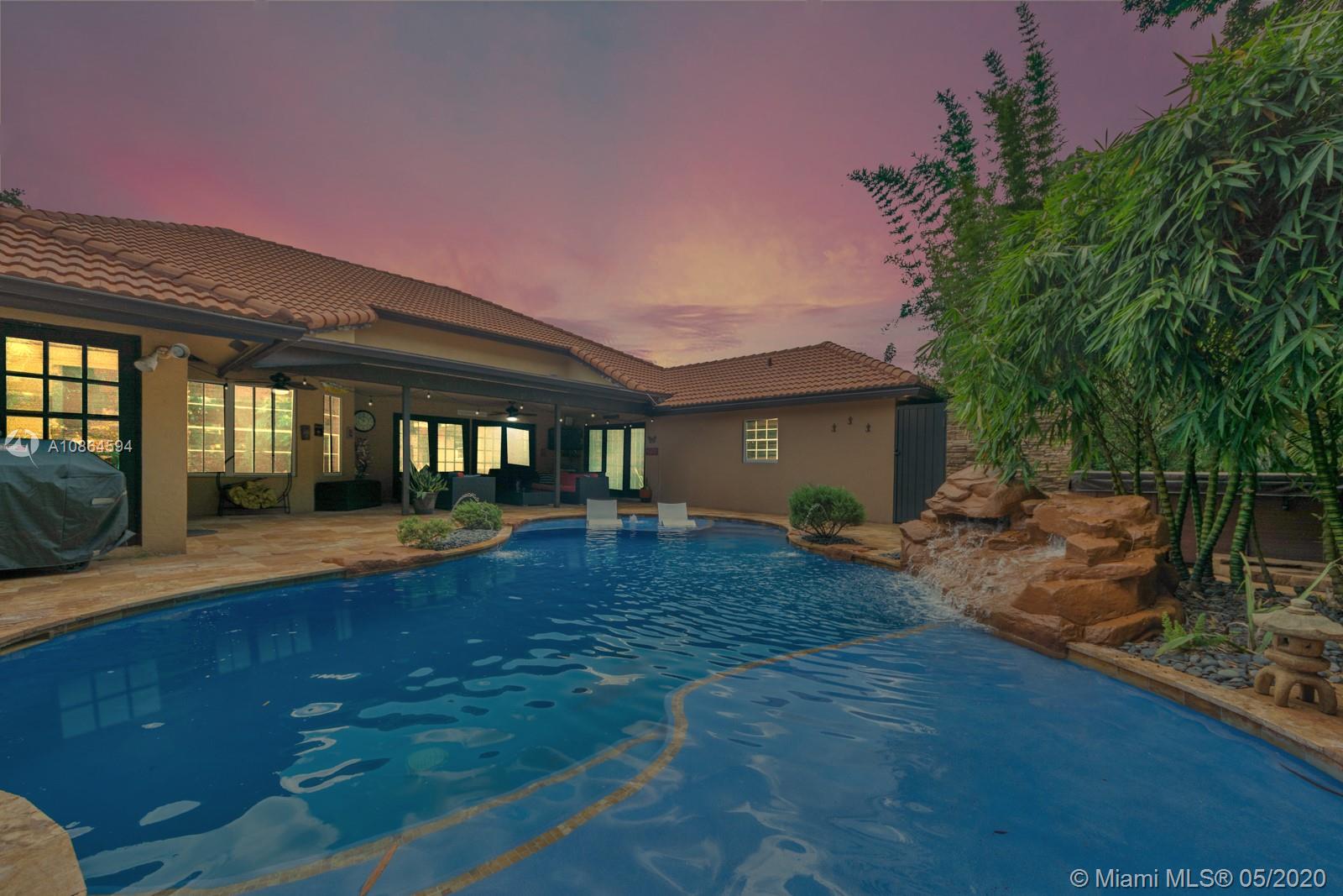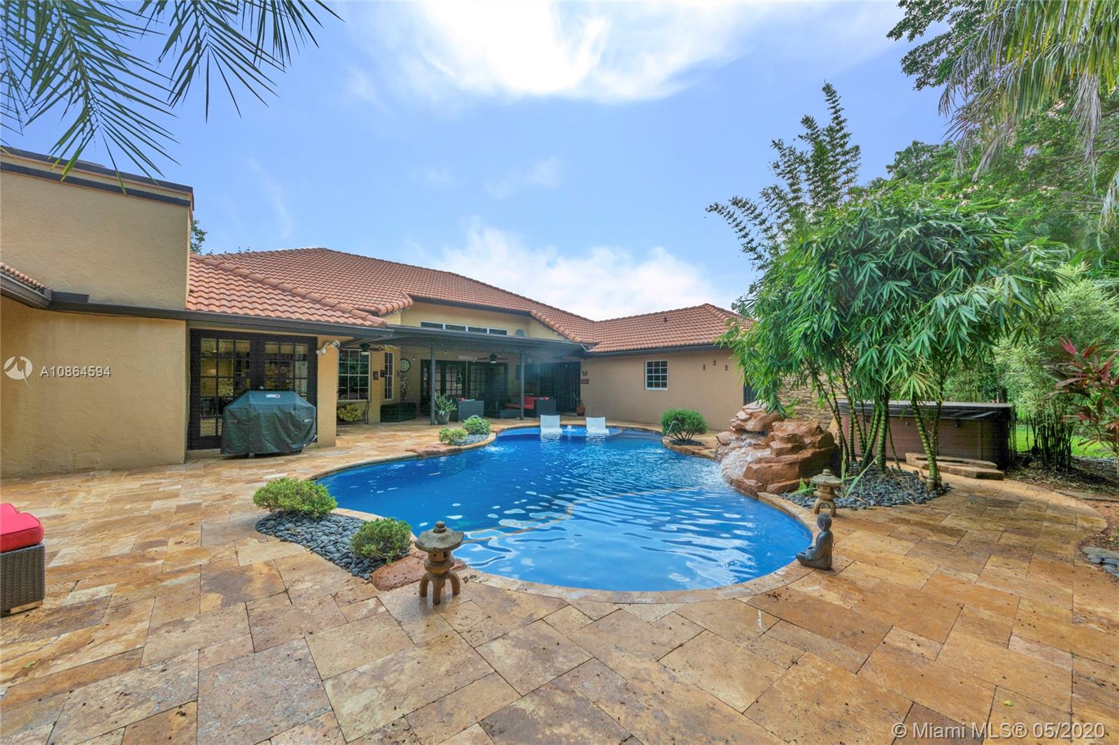 This exceptional 5 bedroom 4 bathroom residence is set on a lushly landscaped 1/3 acre private berm lot in charming tree-lined neighborhood. Enter foyer and be greeted by spacious living room and dining room with volume ceilings and French doors opening to tropical backyard paradise. The outside is an alluring resort-style oasis with free-form heated salt pool w/waterfall and beach entry, stunning marble patio, hot tub, fire pit and Bocce court. Interior features custom chef's kitchen with double ovens, cook top/hood, pot rack and wine cooler which overlooks the breakfast area and family room with fireplace , spa-like Zen master bathroom, completely remodeled with custom cabinets, marble counters, his and her toilets, luxurious tub and inside/outside shower. Steps to park and playground.