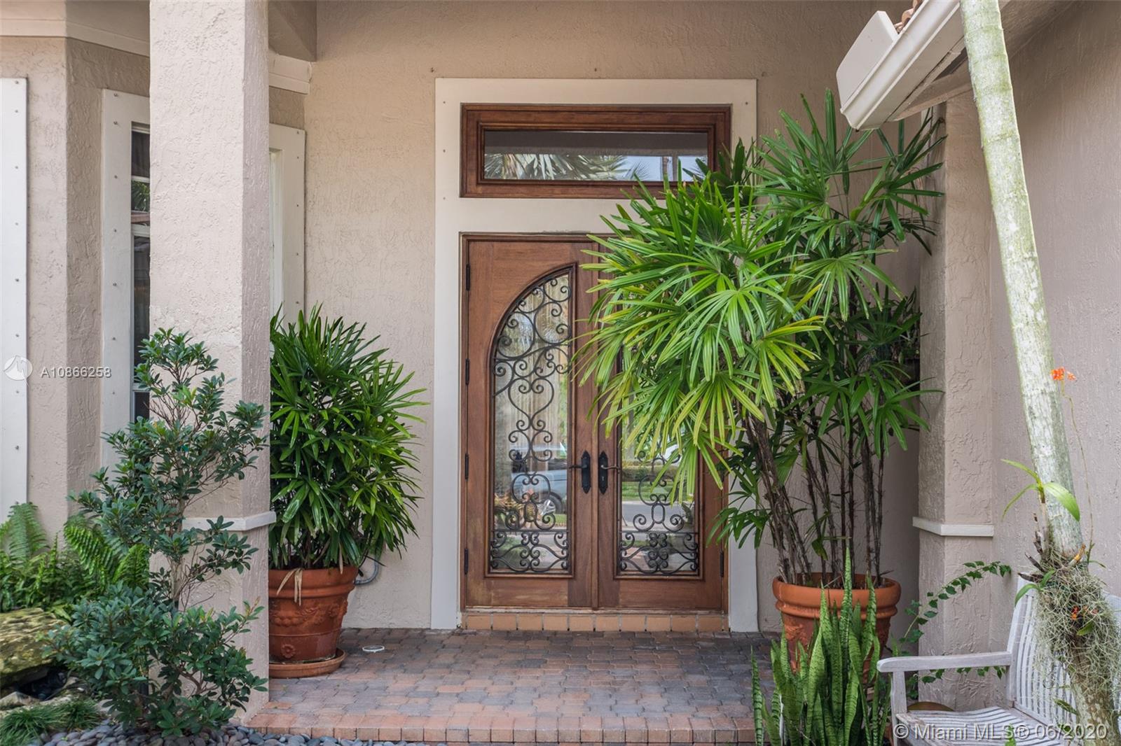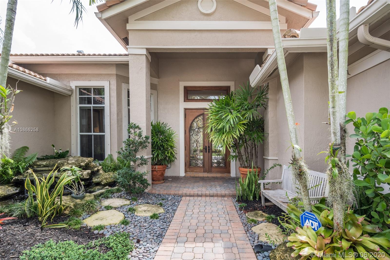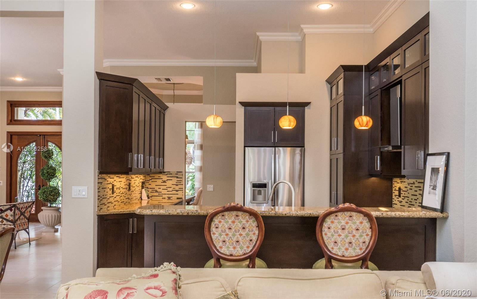 Custom home tucked on a royal palm tree-lined street with a circular paver driveway. Popular triple split floorplan Shows like a decorator model. New Kitchen with top of the line Stainless Steel appliances, granite countertops. Neutral stone tile throughout living areas. Extensive crown moldings, coffered ceilings, stunning custom window treatments, and drapes. All bathrooms renovated. Private fenced yard with a resort-style freeform pool and paver patio. Lush tropical landscaping. Walk to community park. Hurricane protection. Front door impact from Honduras.