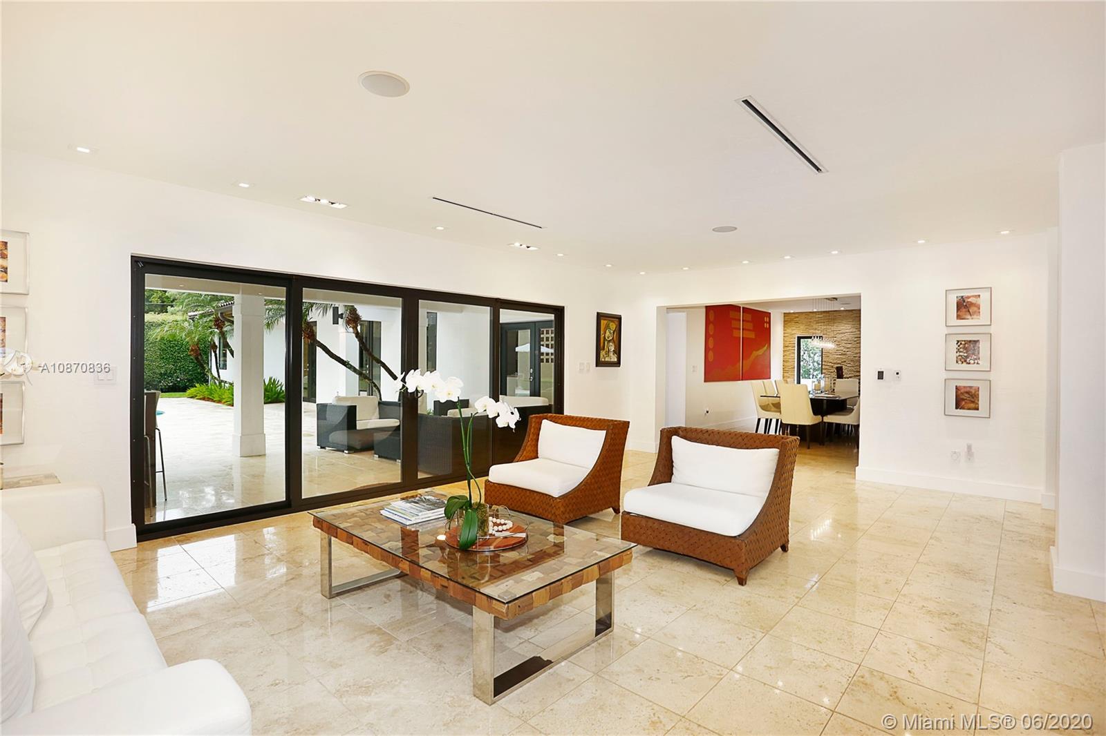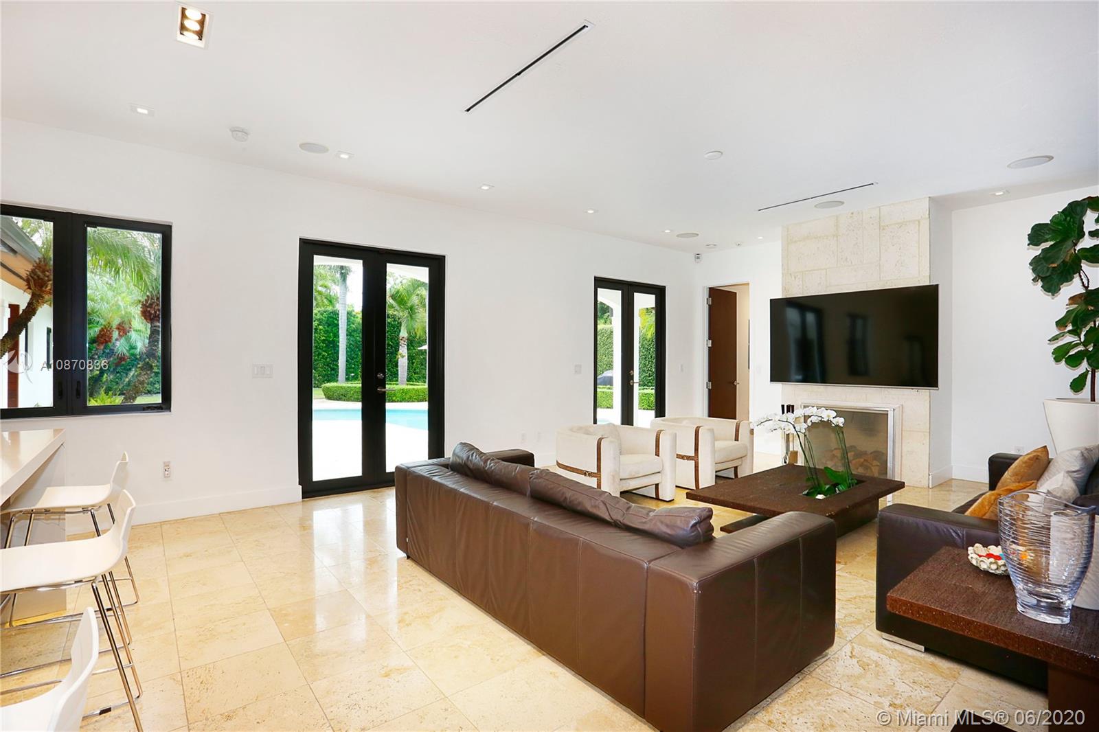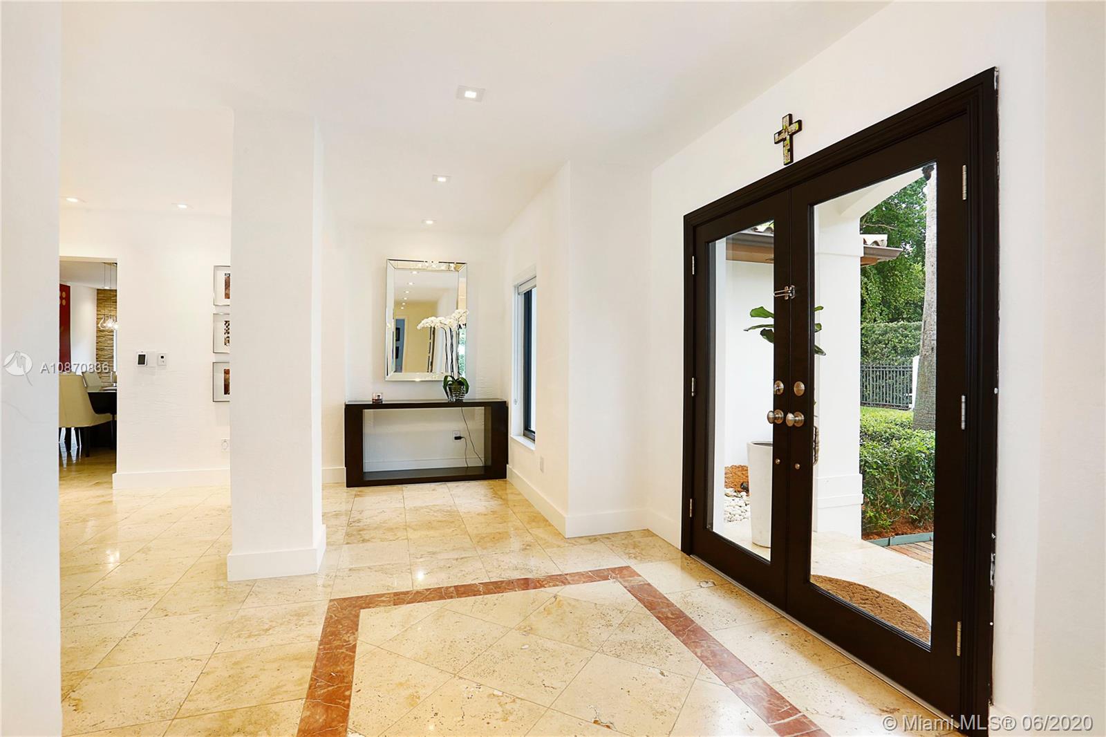 This magnificent 5 beds/4.5 baths gated smart home with pool is nestled on a 19,215 sq ft lot in the desirable Ponce-Davis Platinum Triangle of Coral Gables. Updated beautifully with lots of custom amenities will captivate you from its oversized circular driveway to its gorgeous backyard surrounded by lush tall privacy hedges! Features: 2-car garage, new impact windows & glass doors & shades, custom-built sleek kitchen with wood European cabinetry, quartz counter-tops, Viking appliances, high ceilings, working fireplace. Lots of techy systems: cameras, wireless alarm, intercom, smart control app. The Master suite has 2 custom-built walk-in closets, dual sinks, whirlpool tub & separate shower. Others: laundry room, linear air vents, partial generator, salt-water heated pool.