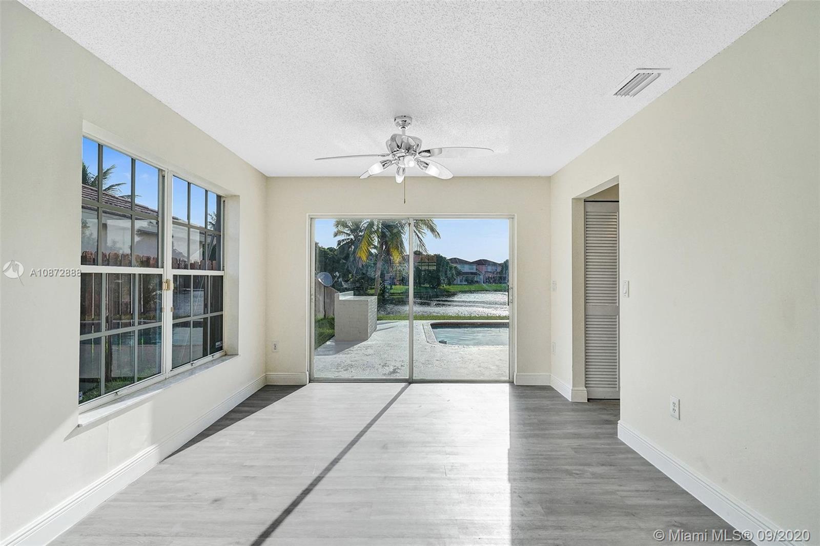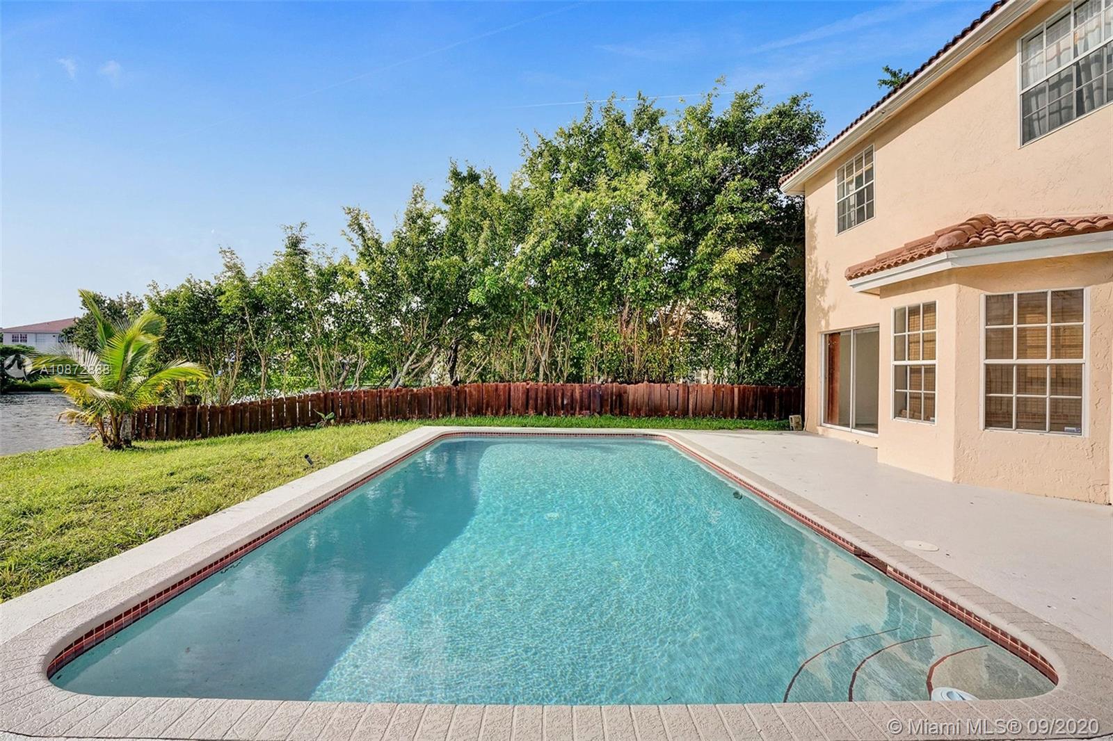 Single-family LAKEFRONT home, 4 bedrooms, 2.5 baths, a 2 car garage, and a SWIMMING POOL. The first floor features a spacious living room, dining room, family room & kitchen with new waterproof hardwood floors throughout and plenty of windows allowing for ample natural light. The eat-in kitchen includes updated cabinets, quartz countertops, and sliding doors leading to the backyard. In addition to this level is a powder room and laundry room. The second floor offers 4 generously sized, light and airy bedrooms, updated master bathrooms, updated shower, and vanities. "A" rated elementary school nearby and great location, easy access to Sawgrass Expressway, Ikea, 595, I-75, and close to Sawgrass Mall.