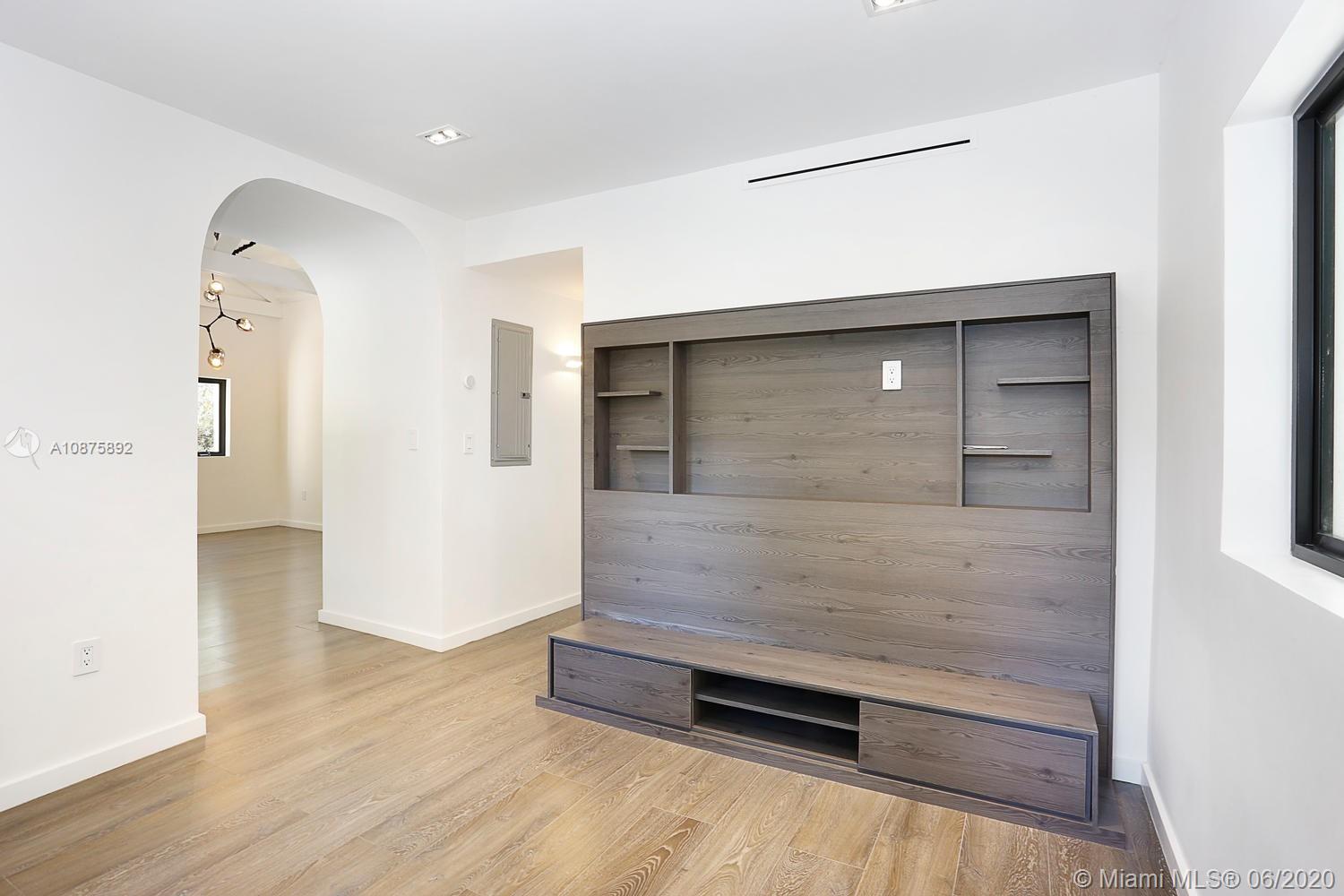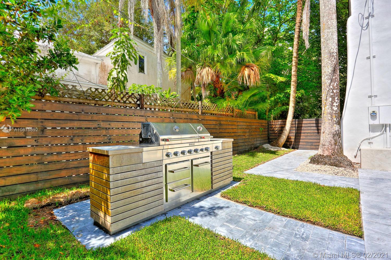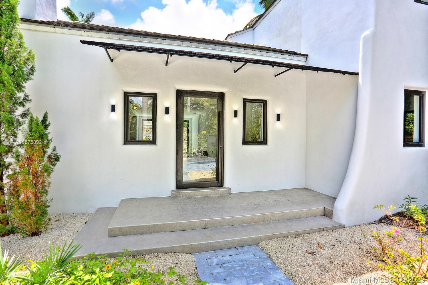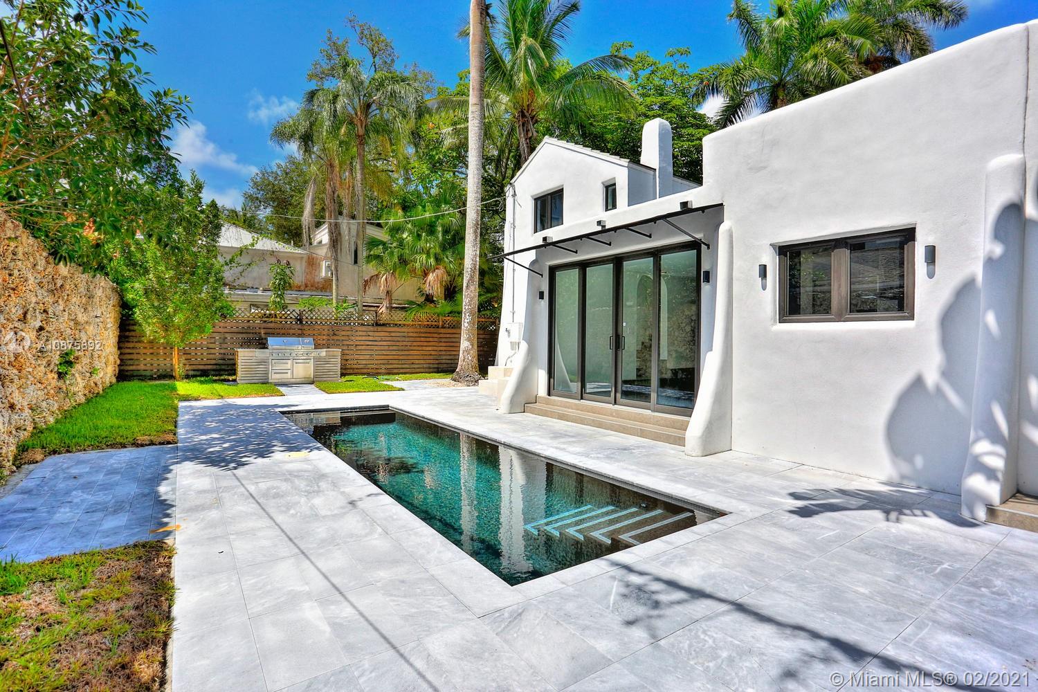 Ultra-private & architecturally unique home set behind a tall coral rock wall. Total renovation by interior architect Piret Johanson - creates a seamless blending of the home’s original character with a minimalist vibe. Light-filled living spaces feature beamed ceilings, fireplace & laminate wood flooring. Ideal open layout offers living/dining + media/family room. Main level master with en-suite bath + second level –2BR/1BA. (Pre-approved plans to add 4th BR). European-style kitchen features stone countertops, high-end appliances & cooking island. Large laundry room w/storage. Enjoy outdoor living & entertaining around the tranquil pool and lounging deck w/ built-in grill + cabana bath. Not in a flood zone. Walk to the Grove village.
