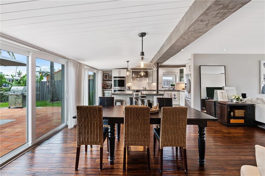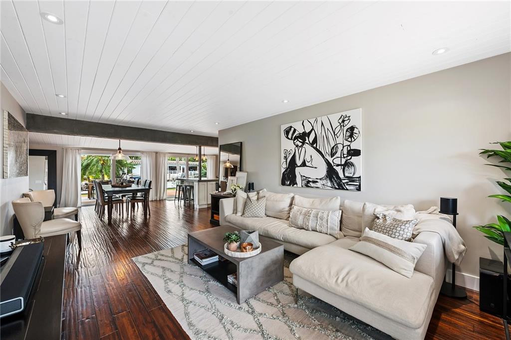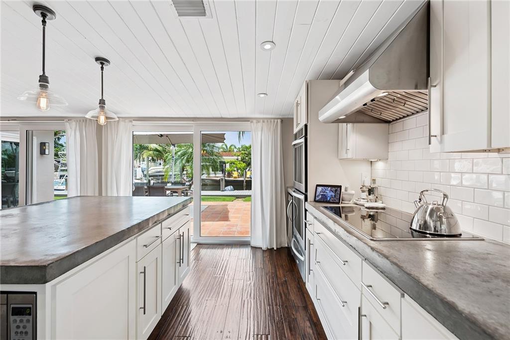 Absolutely stunning 3 bedroom 2 bath home with southern exposure on 70 feet of ocean access water frontage in the highly desirable neighborhood of Citrus Isles. This home is completely redone and has every feature you can imagine: open floor plan with wood flooring (laminate in office/3rd bedroom), exposed concrete beams with tongue and groove ceilings, and impact windows and doors. Gourmet kitchen features concrete countertops, stainless steel Kitchenaid appliances, double oven, warming drawer and wine cooler. All baths have been completely redone with marble flooring and quartz countertops. 2018 3.5 ton AC unit, new Trex dock, sea wall sealed and pilings replaced. Beautiful outdoor living with tons of green space with plenty of room for a pool!