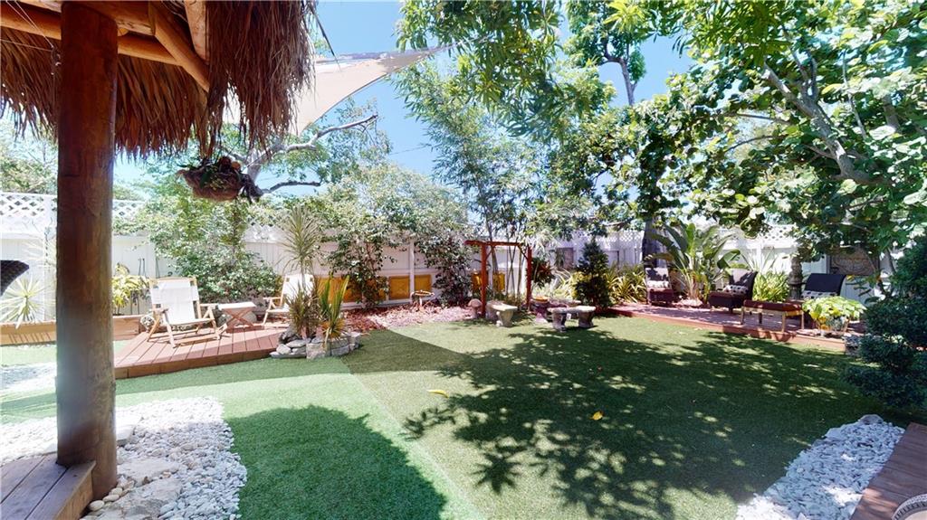 This large corner lot 2 bedroom 1 bathroom home boasts circular driveway, tile flooring, open renovated kitchen, updated bathroom. French doors lead you to your private oasis underneath an authentic Indian built 16' x 20' tiki hut. This private extra large backyard is beautifully landscaped and offers fruit trees yielding mangoes and avocados. The yard offers plenty of space for entertaining, space for a pool, and has artificial turf for easy maintenance. The carport has been enclosed for your indoor yoga session or at home workout, and can be easily converted back to a open carport. This fantastic home is move in ready and furniture can be negotiated with your contract. Please use this link for a virtual tour. https://my.matterport.com/show/?m=MCp23KcU7Pp&brand=0