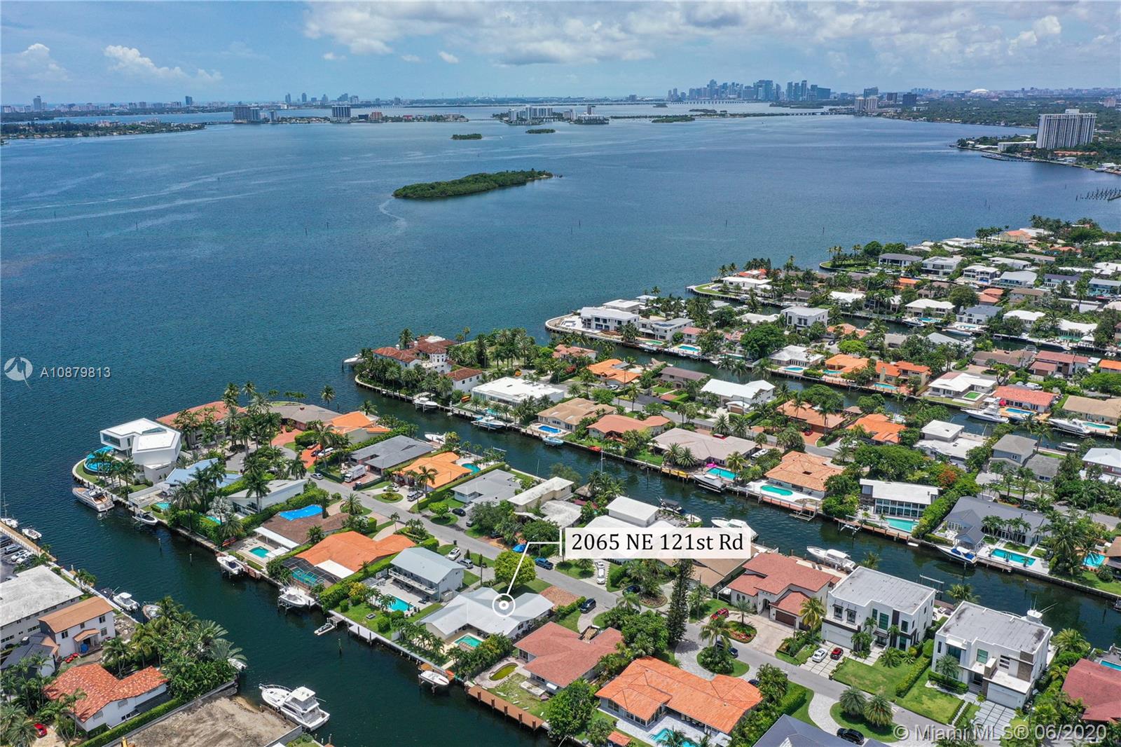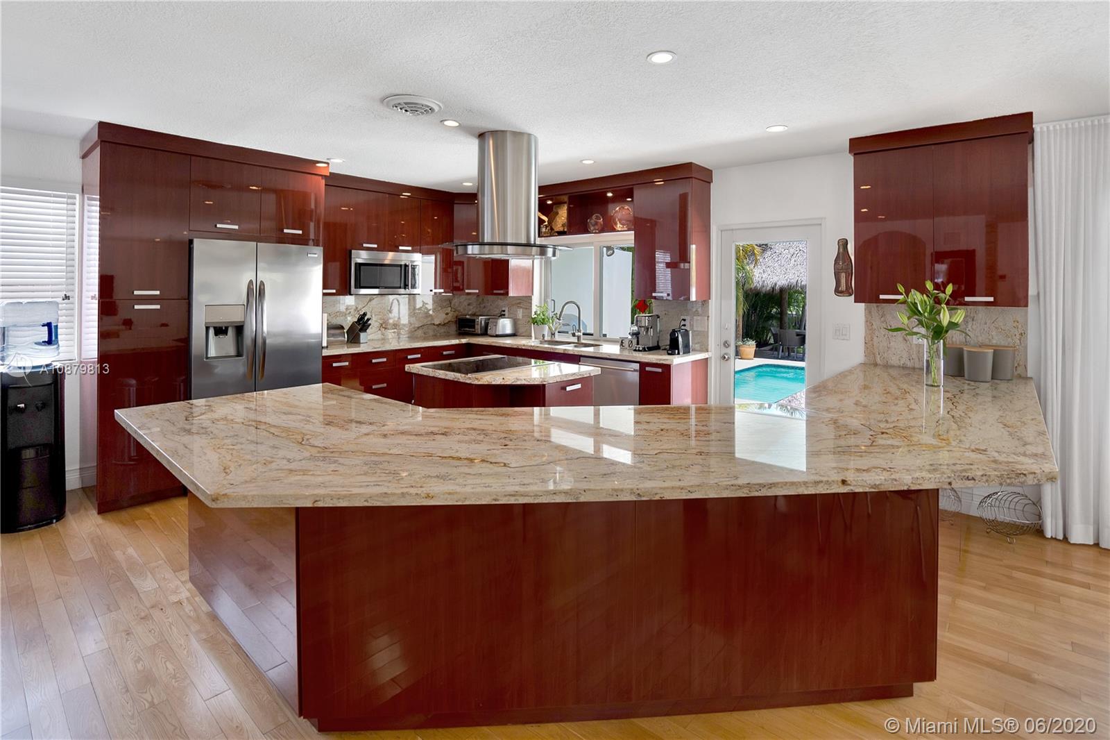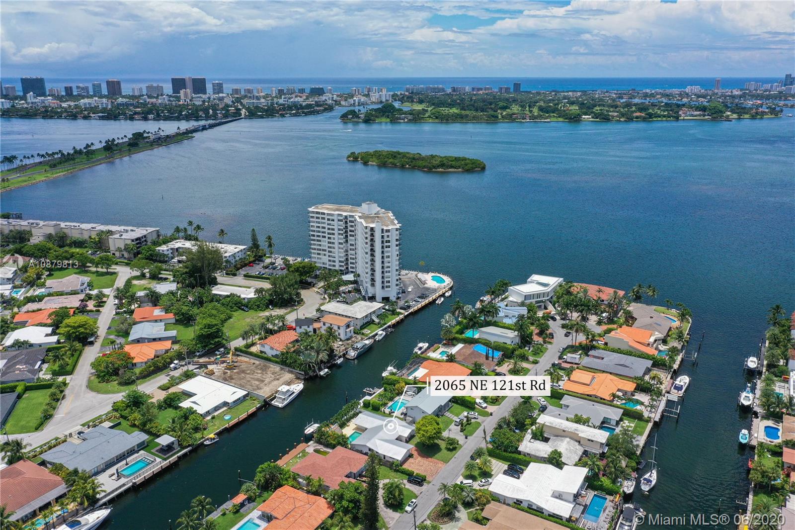 Sans Souci Estates, Waterfront just 6 houses from direct bay. Deep canal, no bridges. Bring up to a 75ft boat, or smaller boat and use the 16,000 lb elevator boat lift ready to go. All hurricane impact windows and doors. Open Kitchen concept is done right with lots of space to entertain. 3 bathrooms and 3 large bedrooms. Nice primary bedroom measures 18’x14’, plus huge walk-in closet & 11’x11’ bath features dual sinks and massive shower. 2 car garage. 2015 New Metal Roof. Relax and enjoy Miami Florida living under the tiki hut by the sparkling pool and ocean access water. 24hr Police Gated Community located walking distance to area restaurants, LA Fitness & Whole Foods Market. Minutes to Bal Harbor & Beaches. "A" Rated Schools.