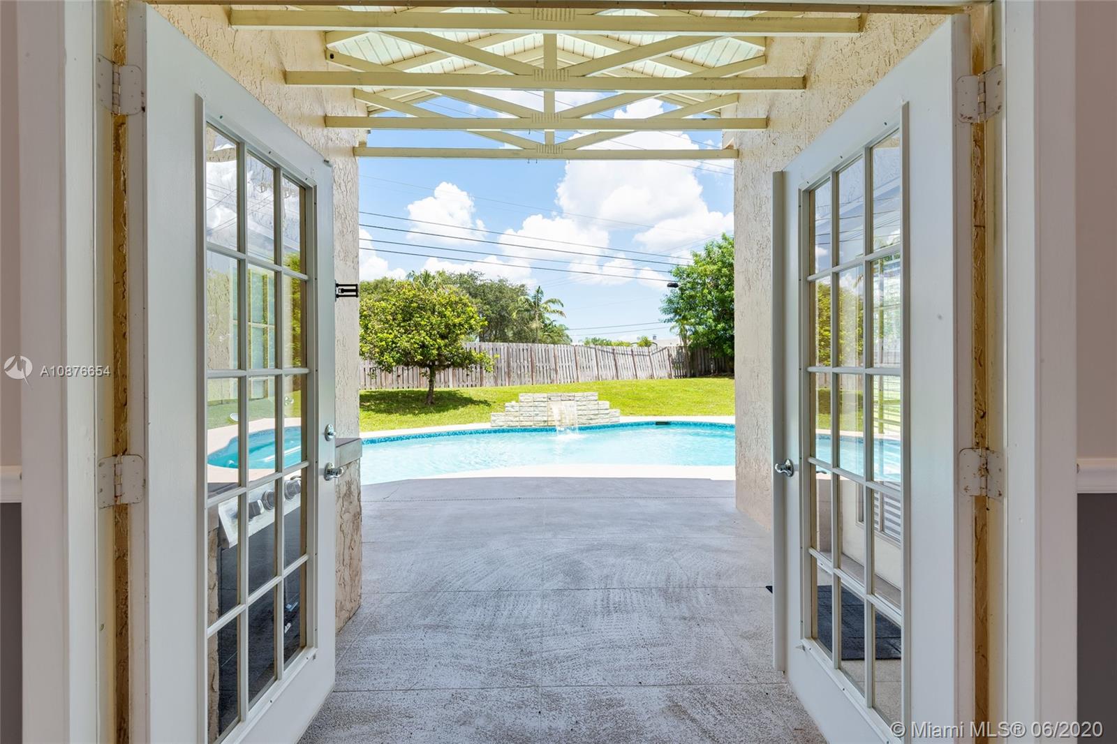 Lovely updated home on one of the largest lots in Springtree Lakes, 10000+sf of fully fenced yard + fruit trees. Pretty shaped salt water pool with cascading fountain. Covered patio with built in BBQ area. Storage shed on side. Interior living areas have been freshly painted. Updated kitchen with SS Appliances. Both baths updated – master has Jacuzzi tub & enhanced lighting. Bedrooms 2 & 3 can be opened up or kept as individual rooms. Spacious living areas with high ceilings & french doors. Home Warranty to buyer for one year at closing. Hurricane panels.
