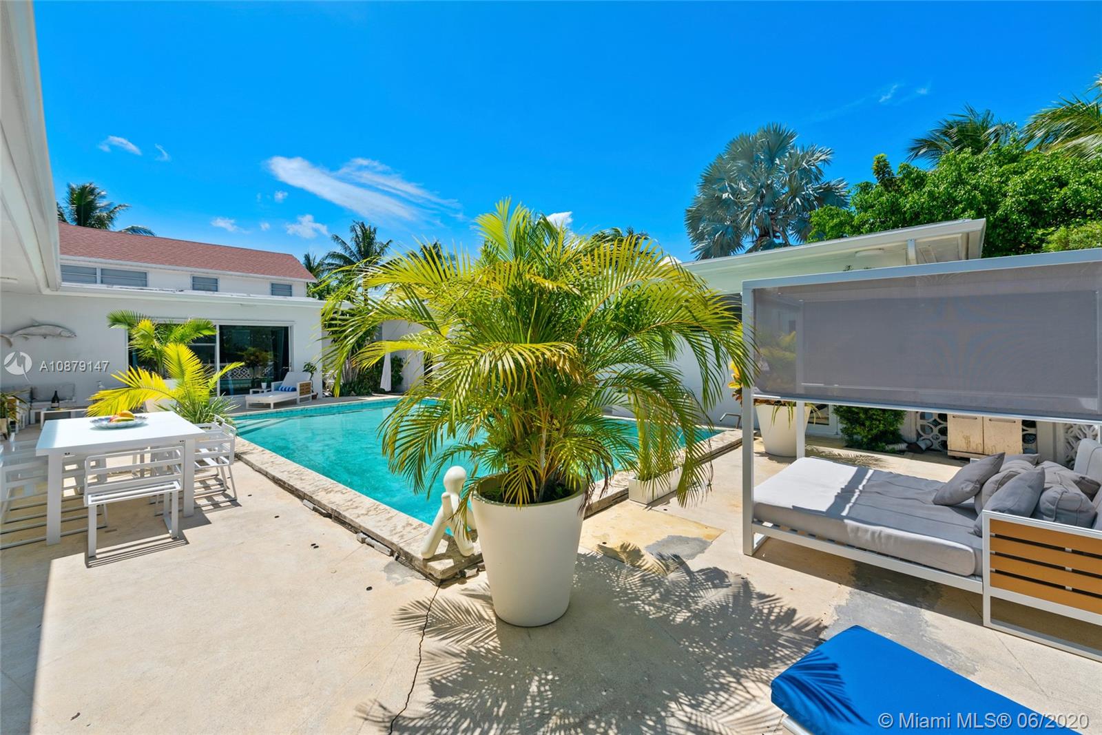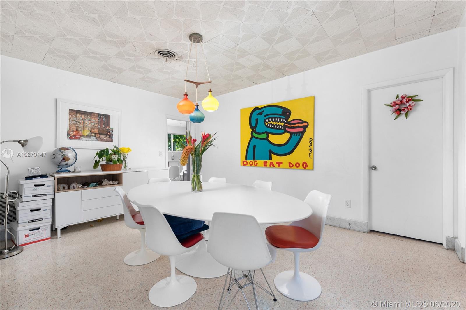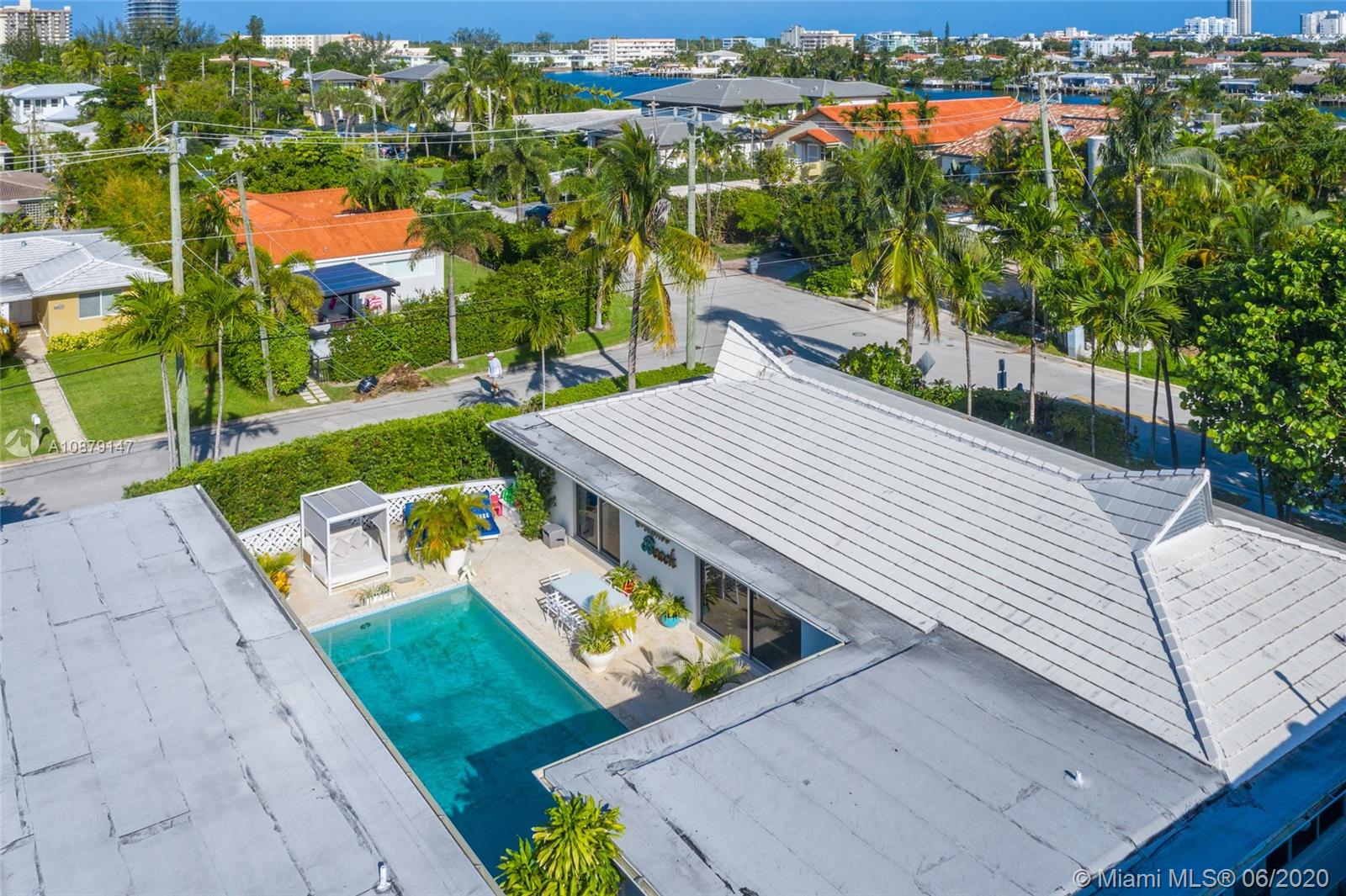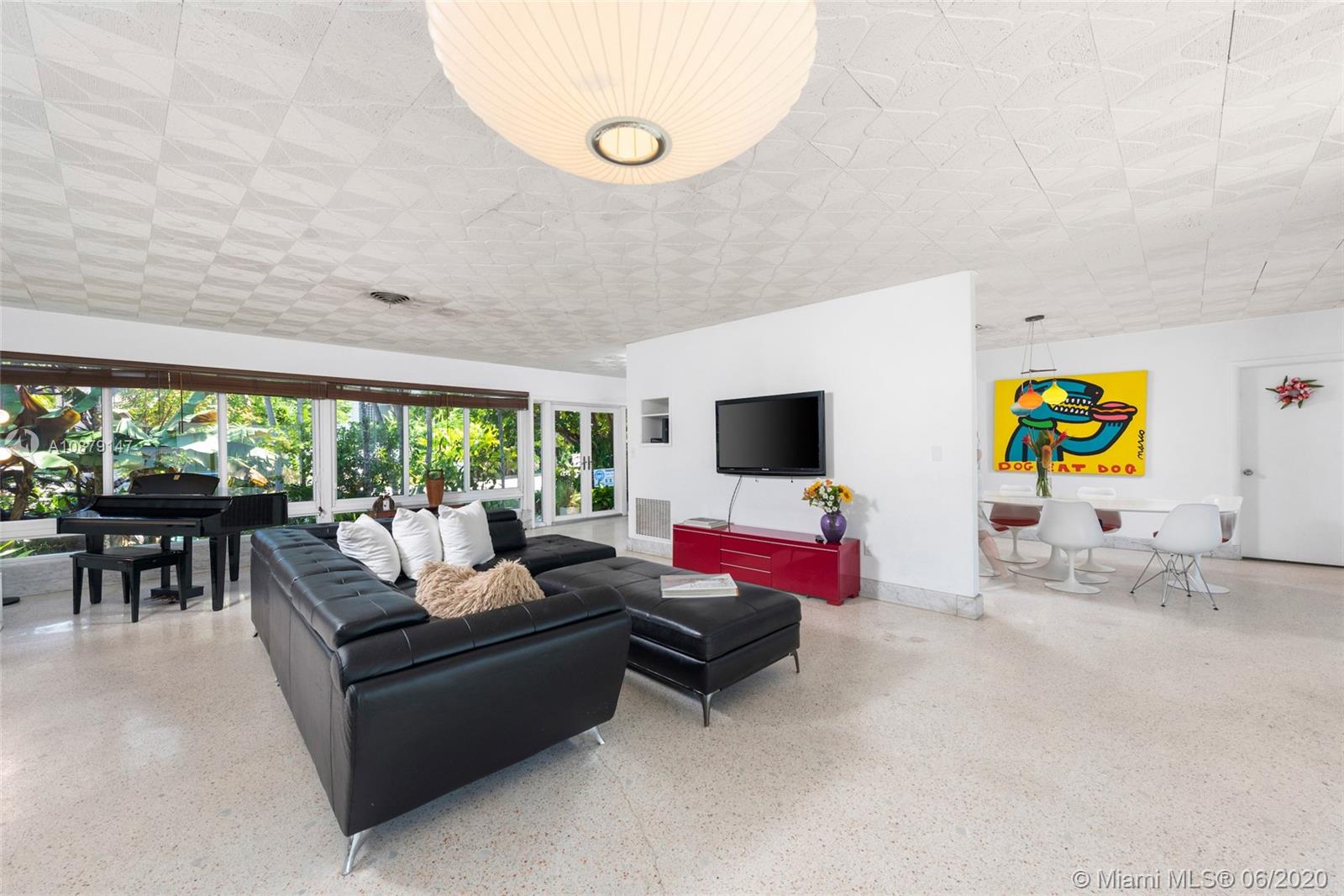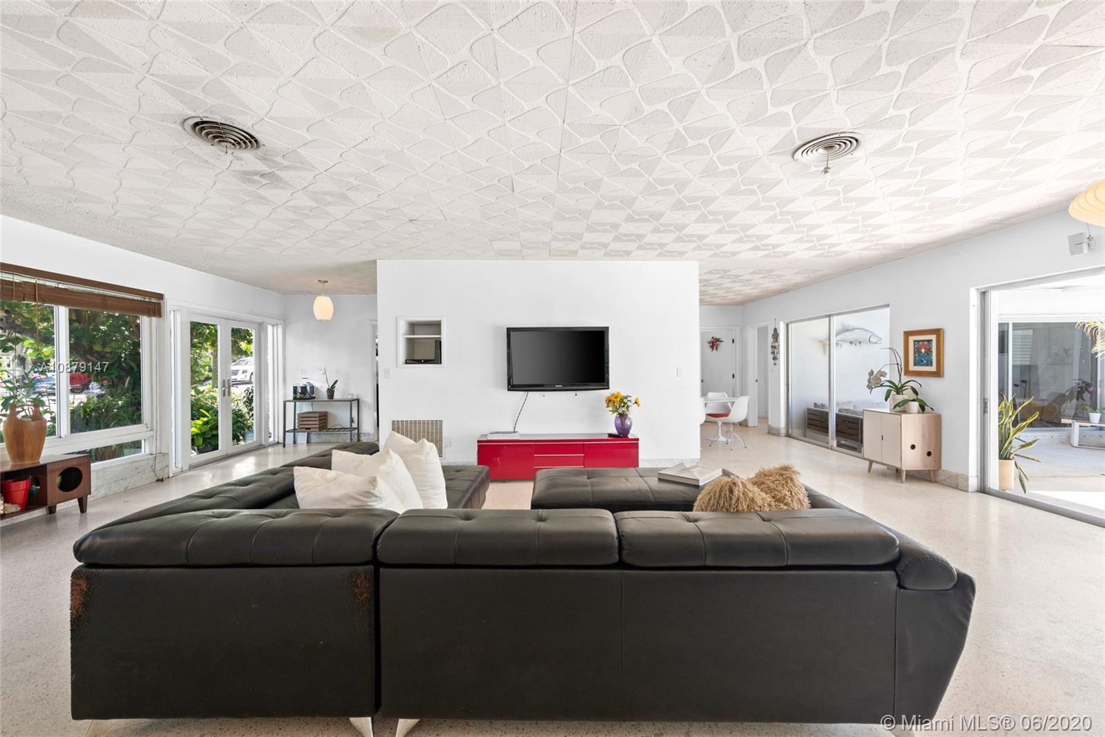 Restored & updated for modern living, this spacious mid-century gem was built to commercial standards in 1959 by a prominent developer as his personal home w/ an excellent 4bd/4ba split floorplan all on one story. Family room opens up to one of the largest courtyard pools in all of Surfside through ingenious sliding glass pocket doors that completely disappear seamlessly merging indoor & outdoor spaces. High end features include Nolte kitchen, Duravit bathrooms, custom terrazzo floors & new enormous detached converted activity center w/ guest quarters, laundry & can be used as a garage/gym/cabana. Situated on a corner lot, this already fantastic home has tremendous potential for future expansion. Partial impact windows & doors. 3D INTERACTIVE TOUR @ my.matterport.com/show/?m=1Hv84z5jVVd