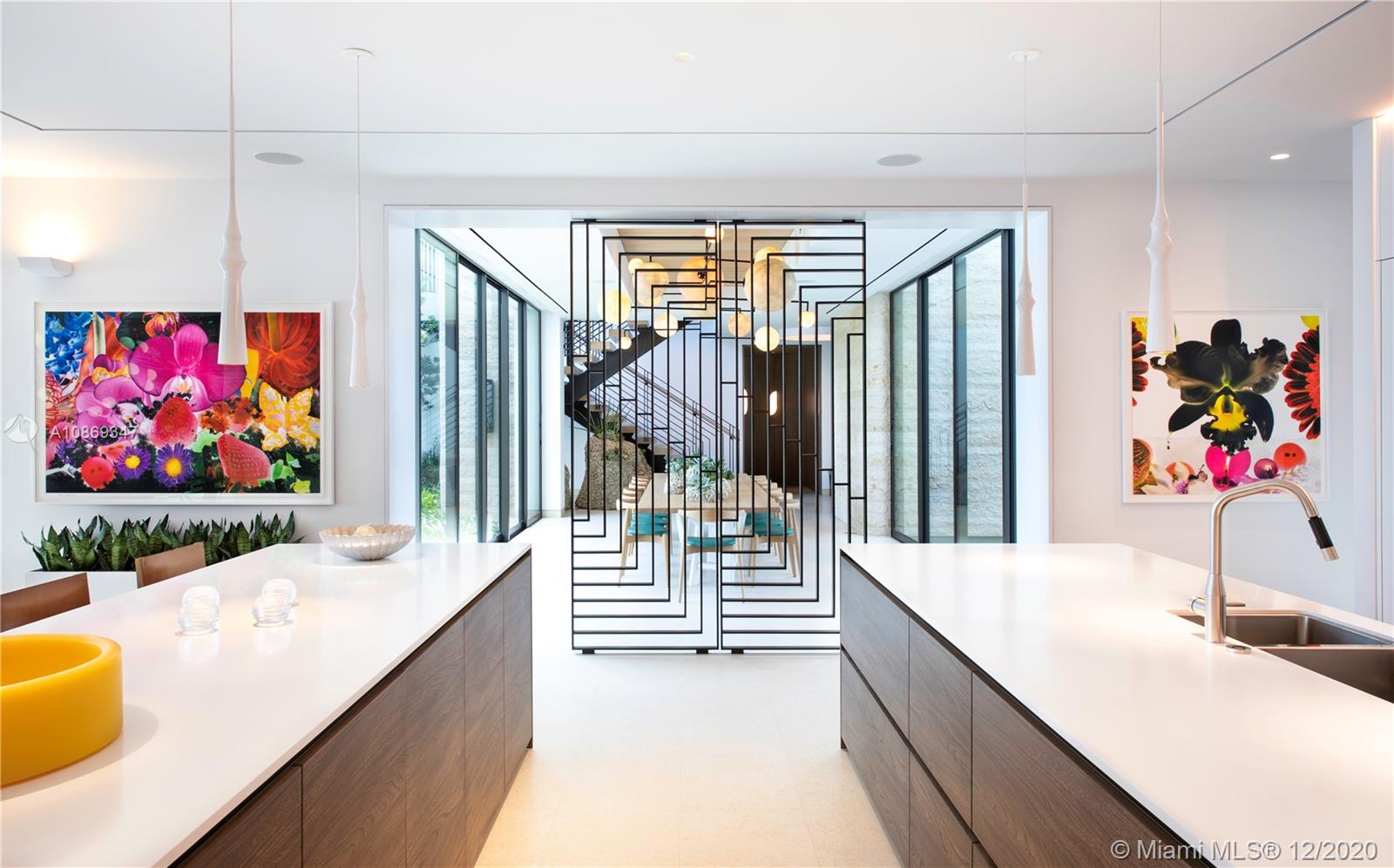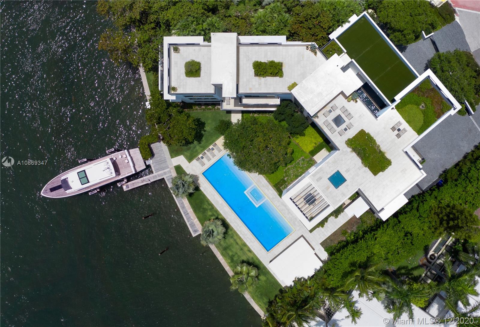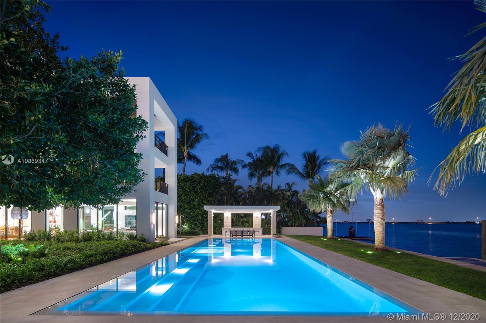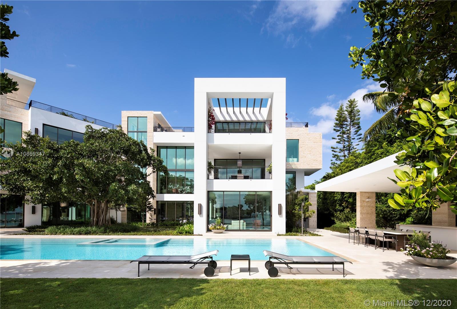 Completed in 2020. Positioned on a 26,500 sf lot spanning 208 ft of waterfront. 22,034 sf total area – total 15,560 sf under air with 6,474 sf of balconies and terraces. Spectacular roof top terrace with spa and wet bar offering 360-degree views of the bay and city skyline. Dufner Heighes provided both exterior and interior design integrating NY and Miami sensibilities. Dufner Heighes has successfully designed numerous projects throughout the Country and thoughtfully created a unique home on the Venetian Islands. Modern and understated furnishings surround unique features which create a panoramic, serene and exciting place to enjoy life.