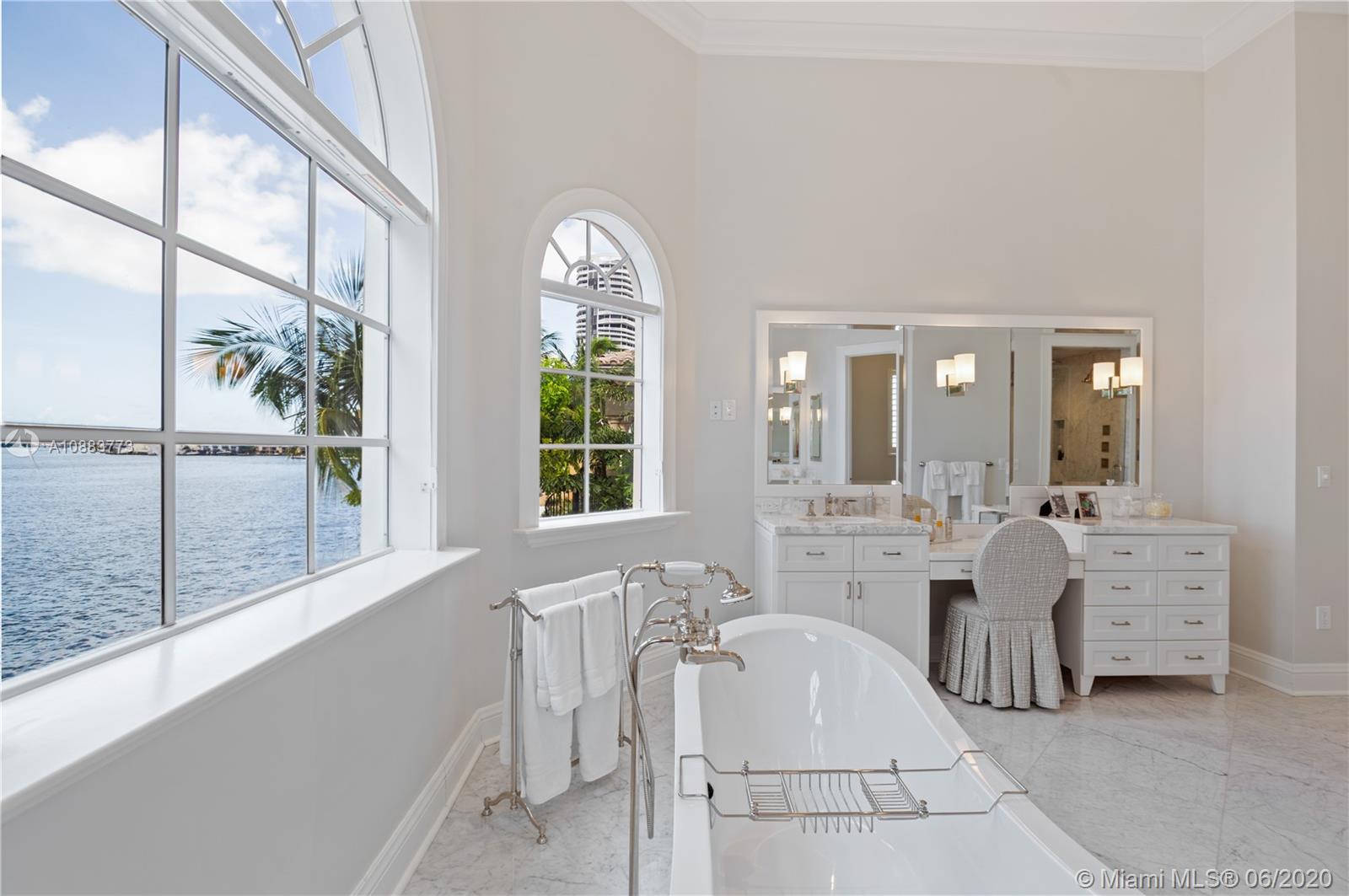 Island Estates-Modern Mansion has 6 Bds, 6.5 Bths 6200+ SQFT,PLUS a 3 car garage, soaring ceilings & vast balconies bringing the home to 7200 SQFT! INCLUDES A 50' ASSIGNED yacht slip!Great for entertaining w/ the formal bar/wine area, vaulted ceilings, wood floors throughout,coiffured ceilings,custom built-ins & open floor plan. Two first floor guest rms w/ full bathrms, LG formal dining rm w/ a custom atrium & fountain, formal living rm, wood burning fire place, separate den, chef's gourmet eat-in kitchen, cabana bath & full laundry facilities on both floors. The grand staircase or elevator will take you to the 2nd fl w/ 2 XL guest bedrms & bathrooms & the vast mstr bedrm & bathrm, custom walk-in closets,HUGE balcony & calming water views. Come experience the home!