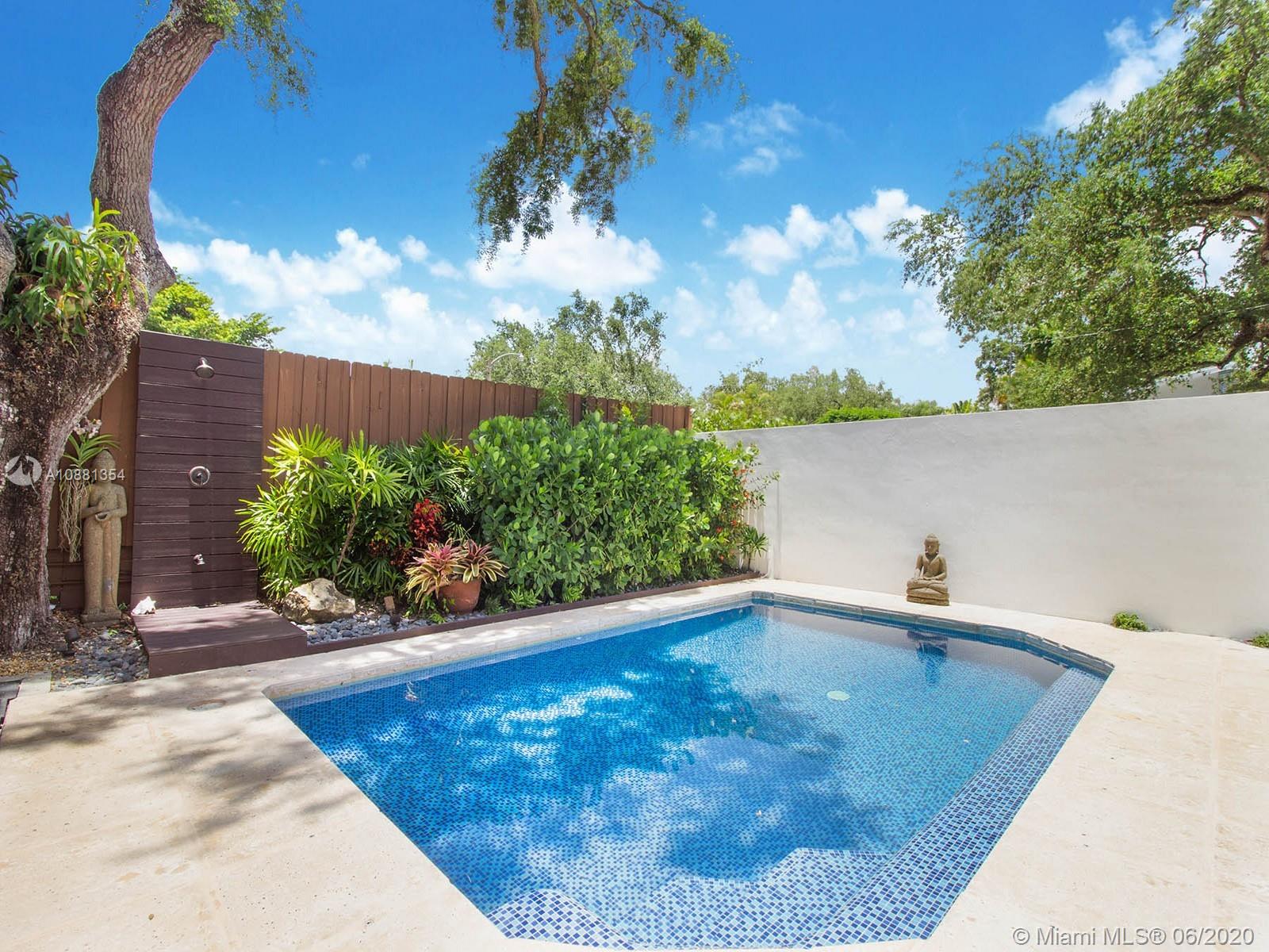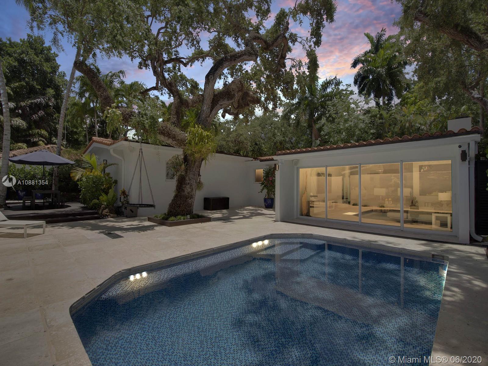 Tucked behind a private gated entrance this North Coconut Grove renovated residence graces a cul de sac with the best urban access in Miami. Stunning banks of impact glass sliders open to the newly refinished pool area and multiple exterior living areas. Handcrafted imported eat-in Italian kitchen is outfitted with Wolf and SubZero appliances, 180 bottle wine cooler and organized built-ins. Vaulted ceilings and upgraded lighting systems encompass the newly redesigned modern masterpiece filled with custom finishes and contemporary features. White Iceberg 48x48 marble and hardwood flooring flow throughout the spacious one-story home with a flexible floor plan. Main house 3/3.5. Separate 1/1 guest casita. Stroll or bike to the Village. Best walkability to schools, hip cafes and the Bay.