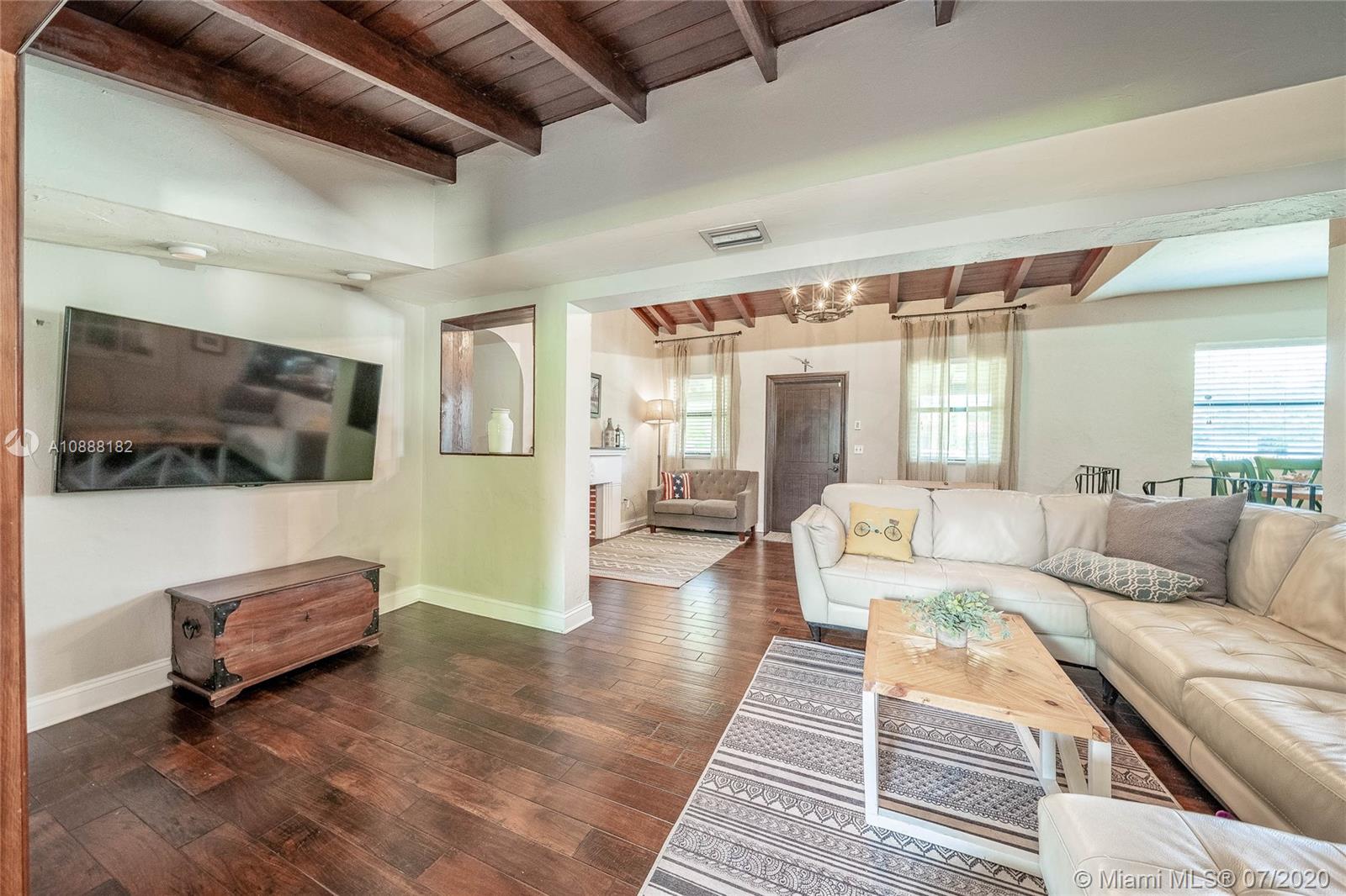 Charming 2 bdrm/ 2 bath, plus office, home perfectly situated in Little Gables. Impact windows and doors, PVC plumbing, newer roof and many other recent upgrades. Delightful living room with fireplace, exposed wood beam, vaulted ceilings. Kitchen opens to dining area and access to the office/playroom/den. Indoor laundry/utility room with storage. Florida room perfect for formal dining or family room. Lovely wood flooring in the living areas and bedrooms. Master has large walk in closet. Guest bedroom is spacious. Room to add on or put in a pool. Fenced back yard with covered paver patio. Paver driveway, corner lot. Steps from Coral Gables. A fantastic investment. Visit https://my.matterport.com/show/?m=SJtBPh9HfDF&brand=0 to view the 3D virtual tour and floorplan.
