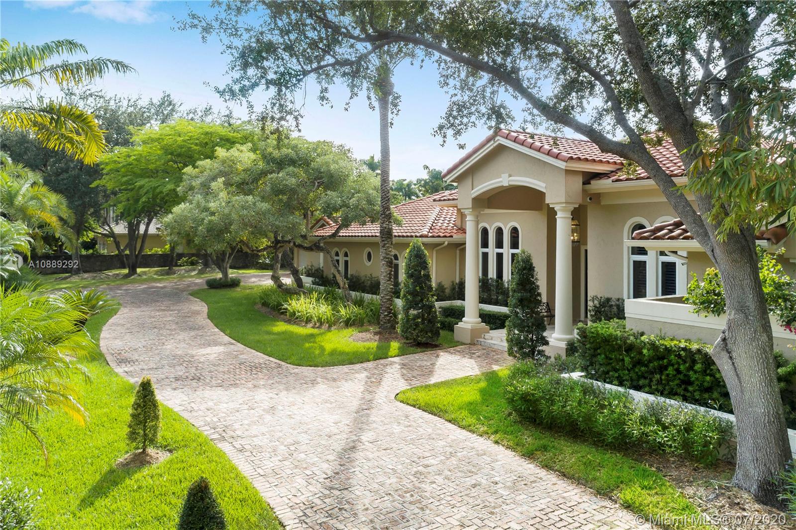 Live an inspired lifestyle in this one-story home nestled on almost 2 acres on a quiet North Pinecrest cul-de-sac. Tall iron gates, old Chicago brick driveway, 6 ft. high magnificent coral rock walls and park-like grounds create privacy and security. 14’ ceilings, tall doors and windows, and a great flexible floorplan gives you countless design choices. In addition to the family room and office, there is a 510 SF newly renovated entertainment room perfect for a playroom, home theater and more. The master suite has a 440 SF closet, shoe closet and 440 SF of flex space for another closet, gym or storage. Full basketball/sport court with LED lighting. Large saline pool. 6-car garage. Impact glass. Lots more! A must see.