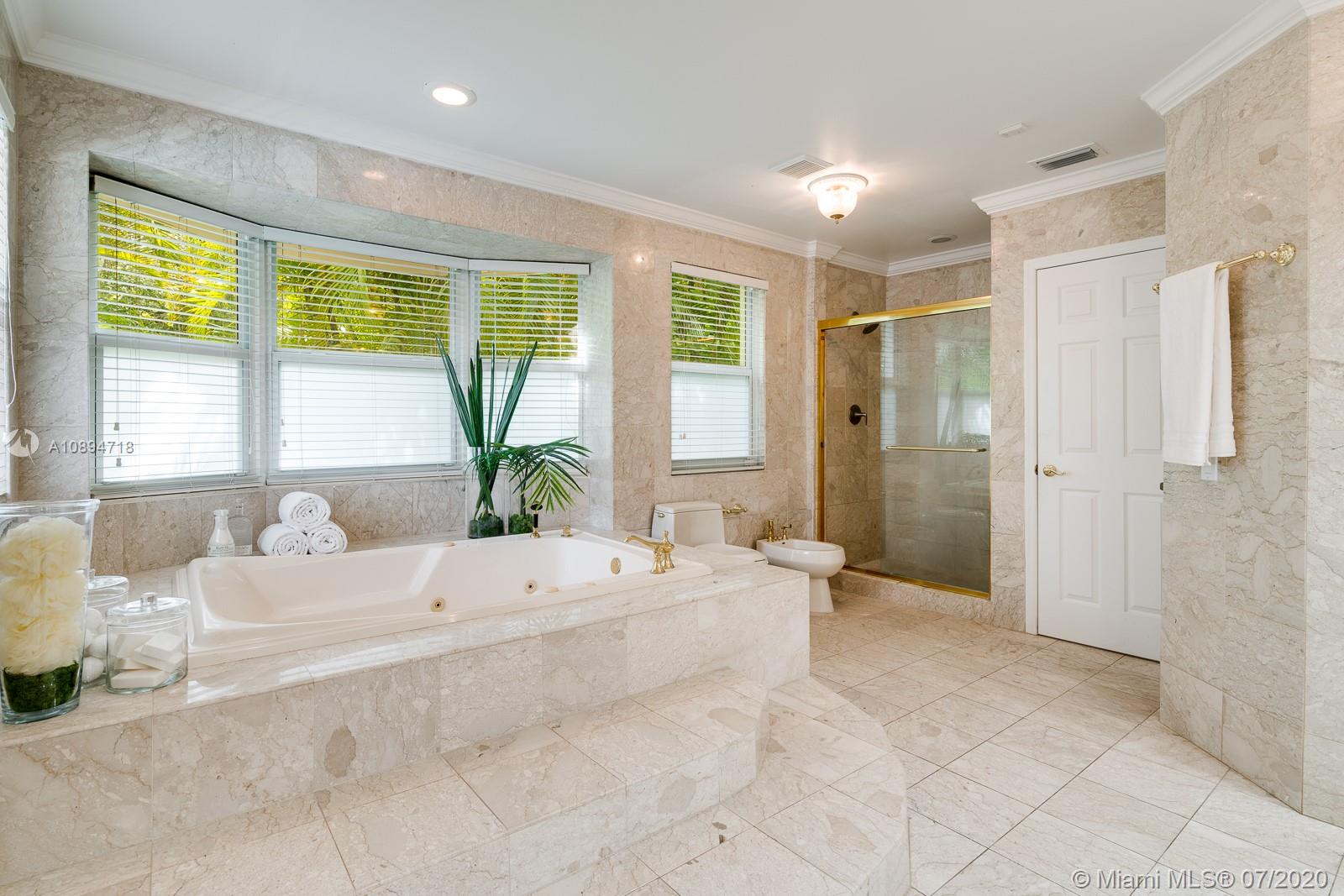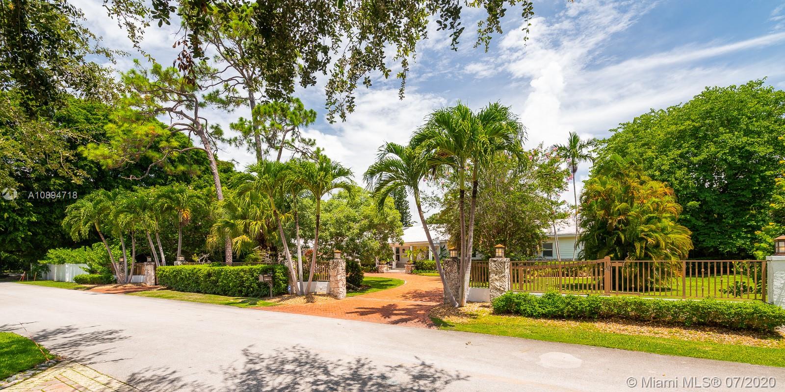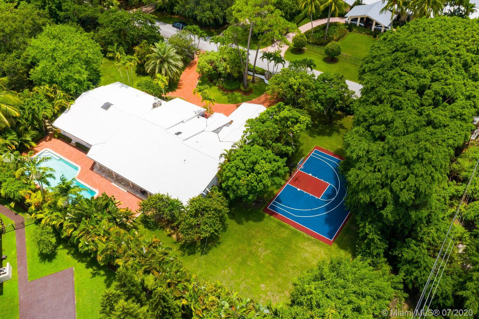 Incredible North Pinecrest location is the setting for this storybook home! A gorgeous, gated, & spacious 4 bed/5 bath + office residence, sits on a 50,000+ sf lot w/mature, lush landscaping providing both beauty & privacy. There are multiple living spaces as well as casual & formal dining areas making entertaining a breeze. The primary bedroom has 2 walk-in closets & a luxe bath. All bedrooms are ample & one is a separate, private suite—ideal for guests or extended family. The list of amenities goes on: a 5-year-old roof, impact doors & windows, wood floors, wet bar, basketball court, covered patio, pool & a 2 car garage with lots of storage. Located in the Pinecrest Elementary district, this property sits high and is in Flood Zone X (flood insurance not mandatory). A Very Special Home.
