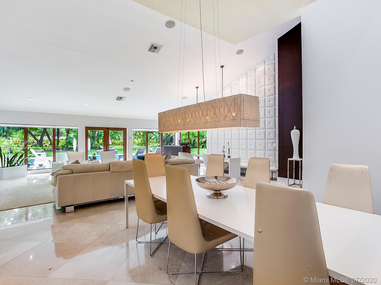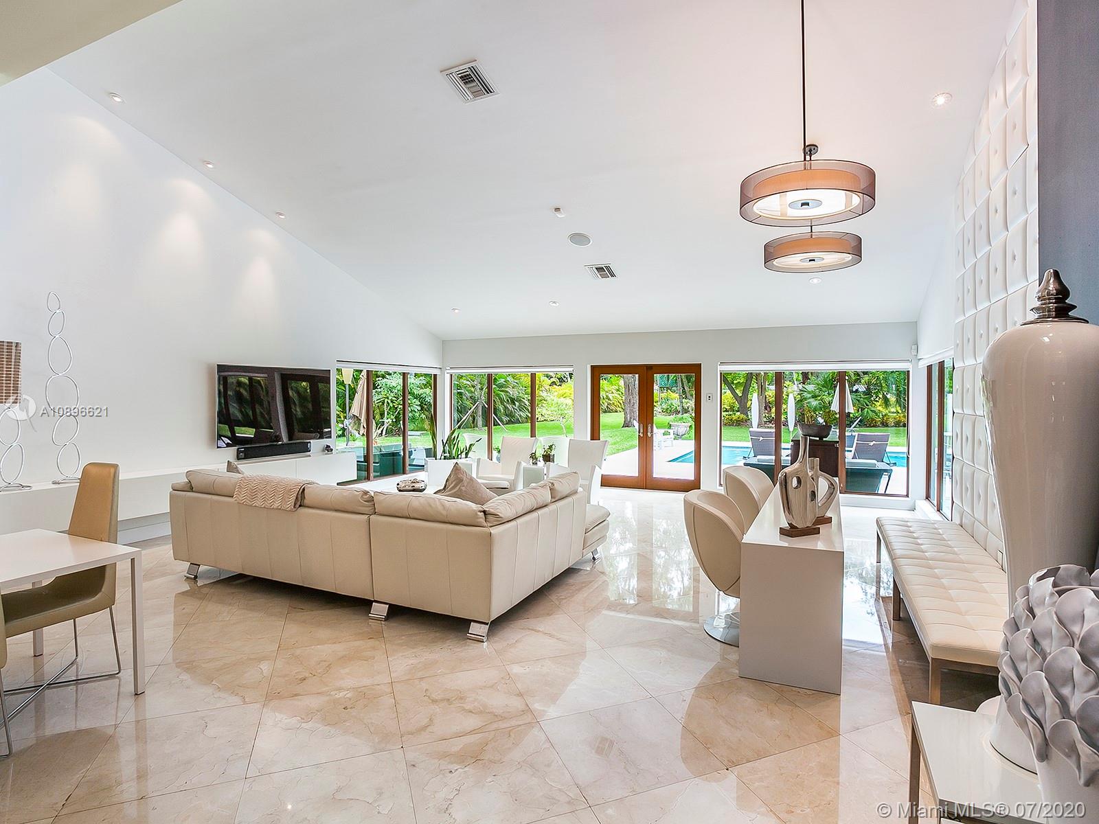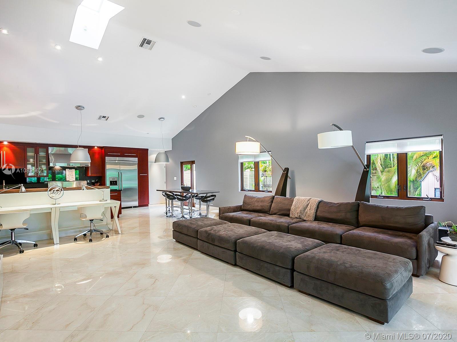 Welcome home to a fabulous floor plan w/ grand double door entrance & a chic open-concept, with a lot of natural light due to over 15' vaulted ceilings & 3 skylights throughout. Completely renovated in 2013, every detail of this flawless home was carefully selected by a professional interior designer. Walking distance to Palmetto Elementary, Middle, and High School. This gated home features 4 big BR +service room/6.5 baths, walk-in-closets, crema marfil italian marble, wood floors in the bedrooms, impact windows/doors, roof redone (2013), laundry room, pool, a chef's kitchen w/Thermador and Jenn-Air appliances, a state of the art music system throughout, alarm system on screens & much more. Stunning fixtures and a custom-built bar included, magnificent spaces for family gatherings!