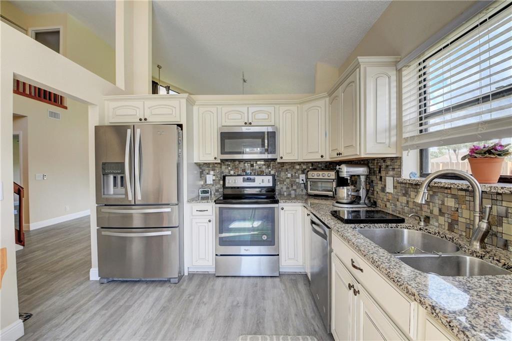Beautiful Corner lot 4 bedroom 3 full bath home directly across the street from the community pool. Remodeled kitchen with high end french door refrigerator, 2yr old stainless appliances, granite counter tops & eat-in area. NEW waterproof flooring downstairs & wood floors upstairs. High Vaulted ceilings with extra windows bring amazing natural light. Master bedroom is conveniently on the ground floor with 2 closets. Master bathroom includes roman tub & separate walk in shower. Large closets in all bedrooms. New exterior paint & hurricane shutters. Huge fenced backyard with double side gate opening towards community pool. Alexa smart home technology throughout including Nest thermostat w 2yr old A/C. Close to shopping, restaurants, parks & A rated schools. Low HOA dues & pet friendly