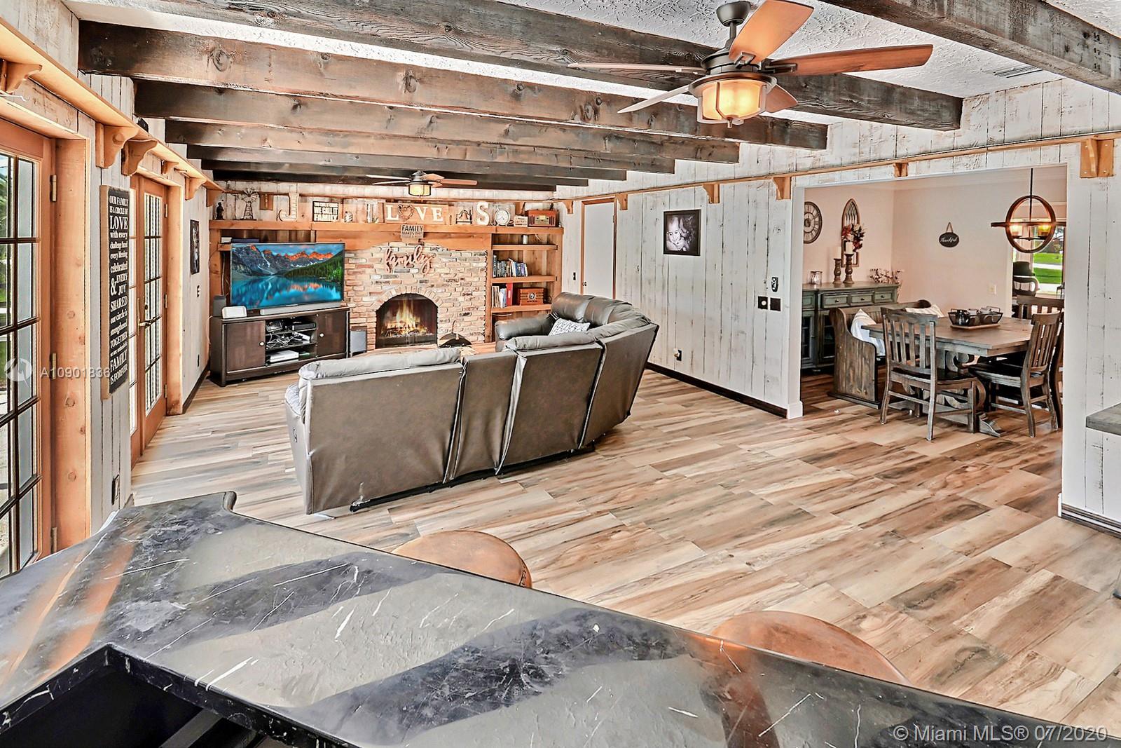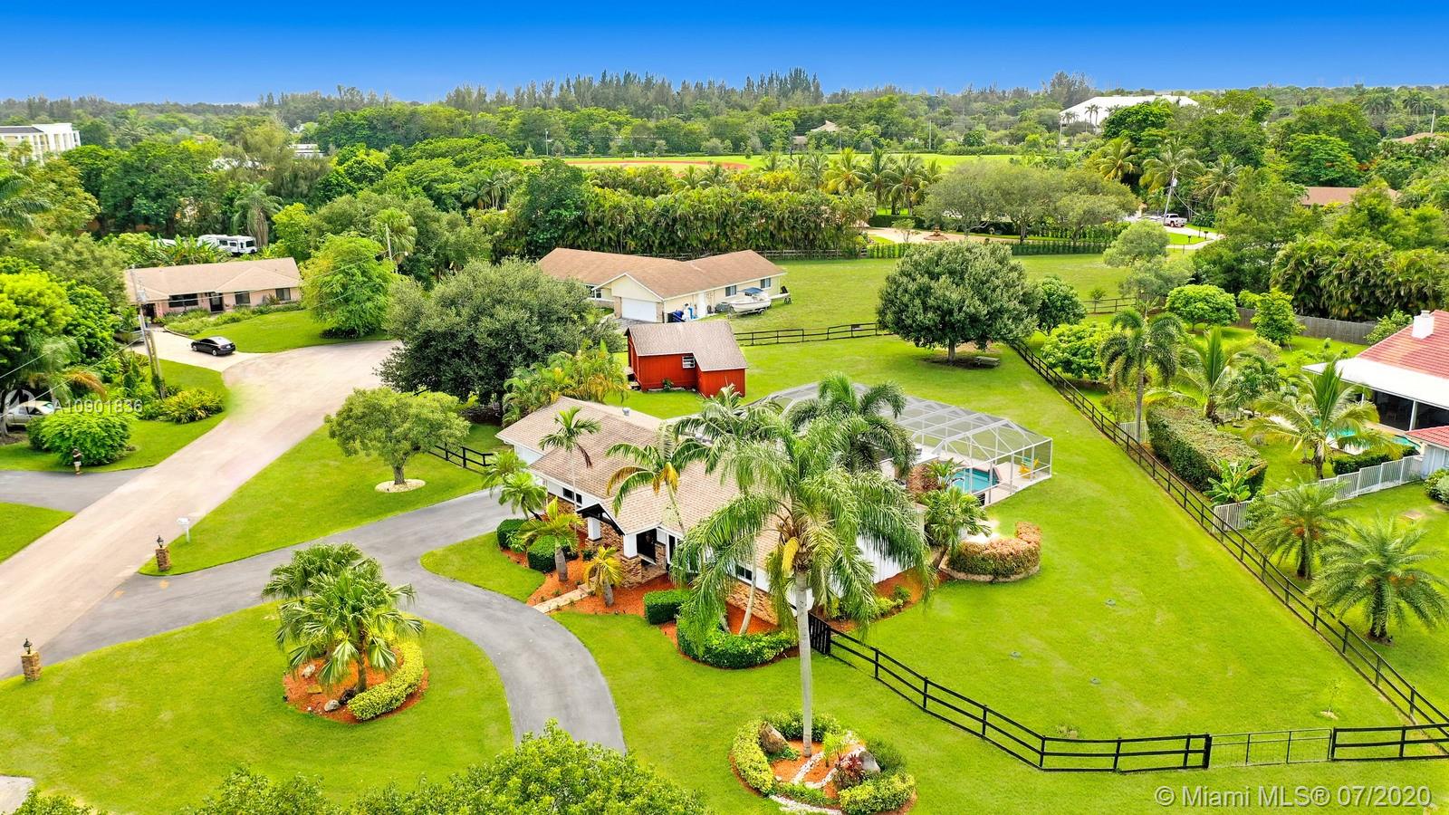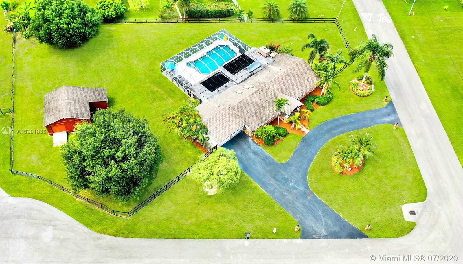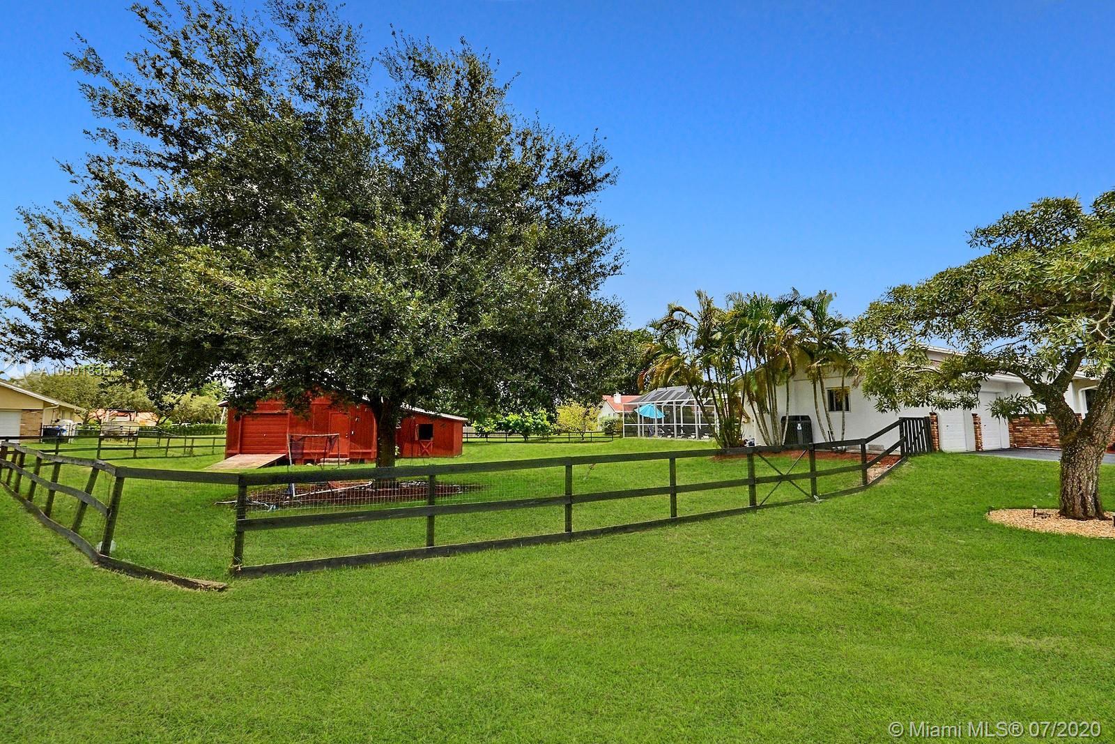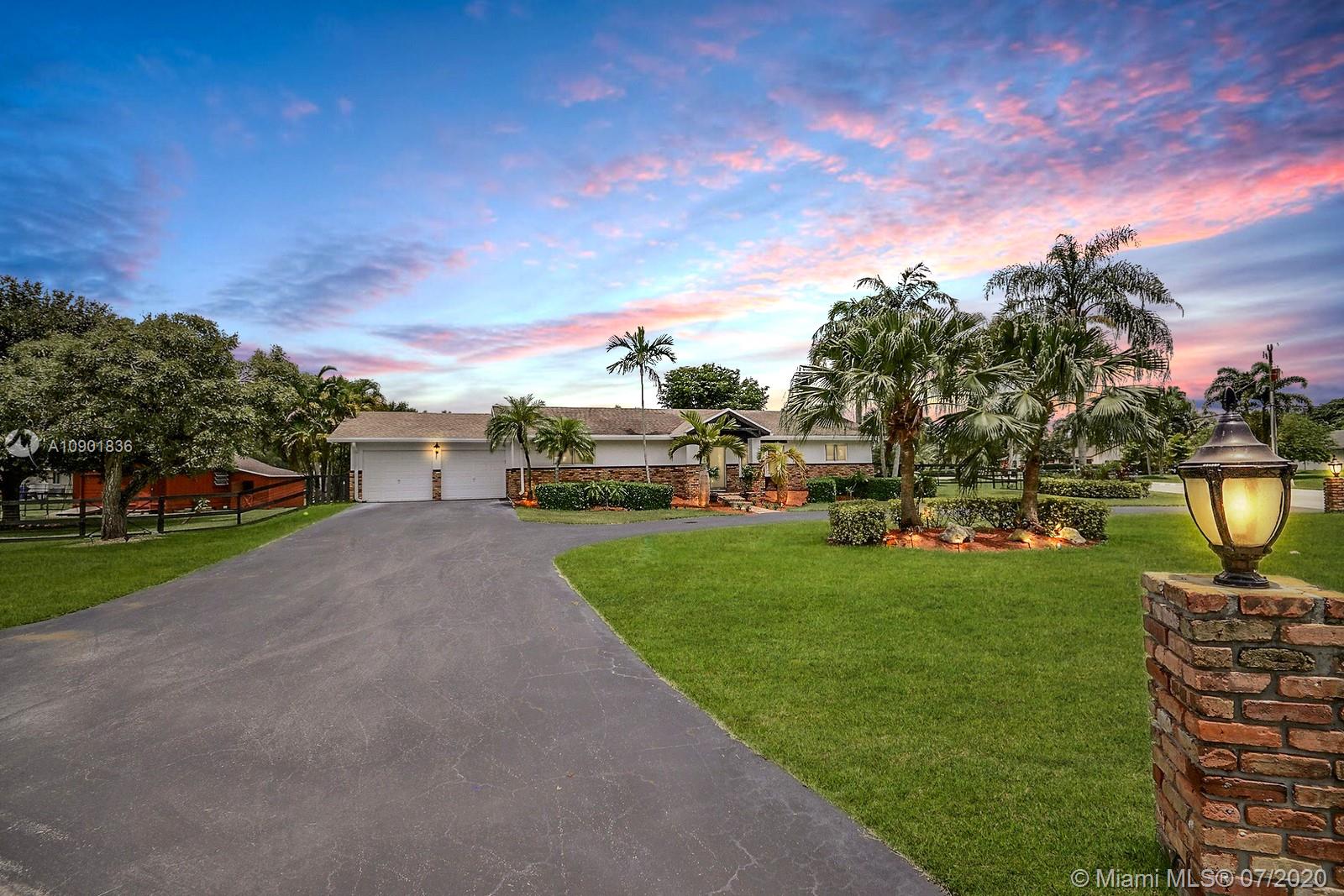 WELCOME TO THIS SPECTACULAR HOME IN THE SOUGHT-AFTER EQUESTRIAN-FRIENDLY COUNTRY ESTATES COMMUNITY OF SOUTHWEST RANCHES. HOME FEATURES A WELCOMING FRONT ENTRY WITH BAY WINDOW, MODERN WOODLIKE PLANK FLOORING, CROWN MOLDING RECESS LIGHTING & CEILING FANS. STUNNING EAT-IN KITCHEN IS ILLUMINATED BY NATURAL LIGHT FROM 2 SKYLIGHTS W WOOD CABINETS, GRANITE TOPS, STAINLESS APPLIANCES INCLUDING WARMING DRAWER & DOUBLE WALL OVER. GORGEOUS WOOD-BEAMED FAMILY ROOM WITH ROMANTIC FIREPLACE OPENS TO THE COVERED PATIO & LARGE SCREENED-IN HEATED POOL & SPA W SOLAR PANELS. SPACIOUS MASTER BED W ENSUITE MASTER BATH. LARGE FULLY FENCED YARD W 500 SQ FT BARN (APPROXIMATELY) W WATER & POWER (AND ITS OWN ELECTRICAL BOX), SHED, ALL SITUATED ON A 34,000 SQ FT CORNER LOT W 2 CAR GARAGE & CIRCULAR DRIVEWAY. NO HOA.