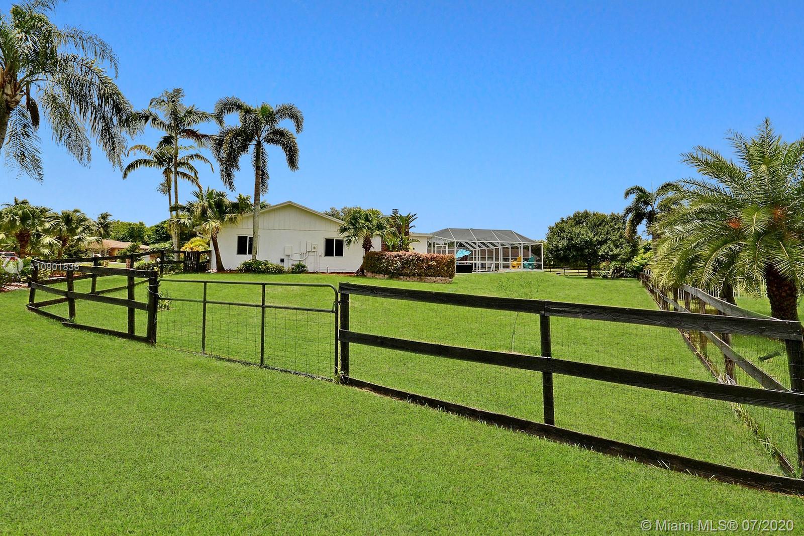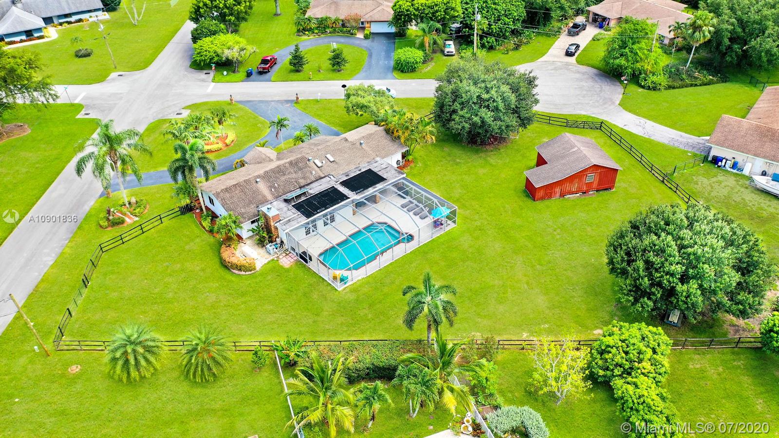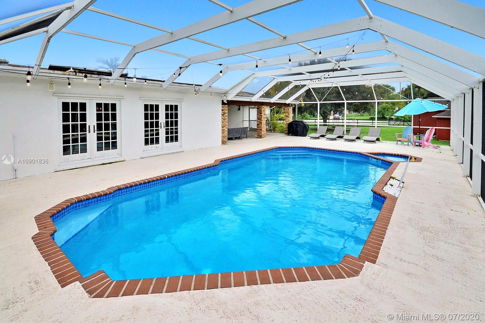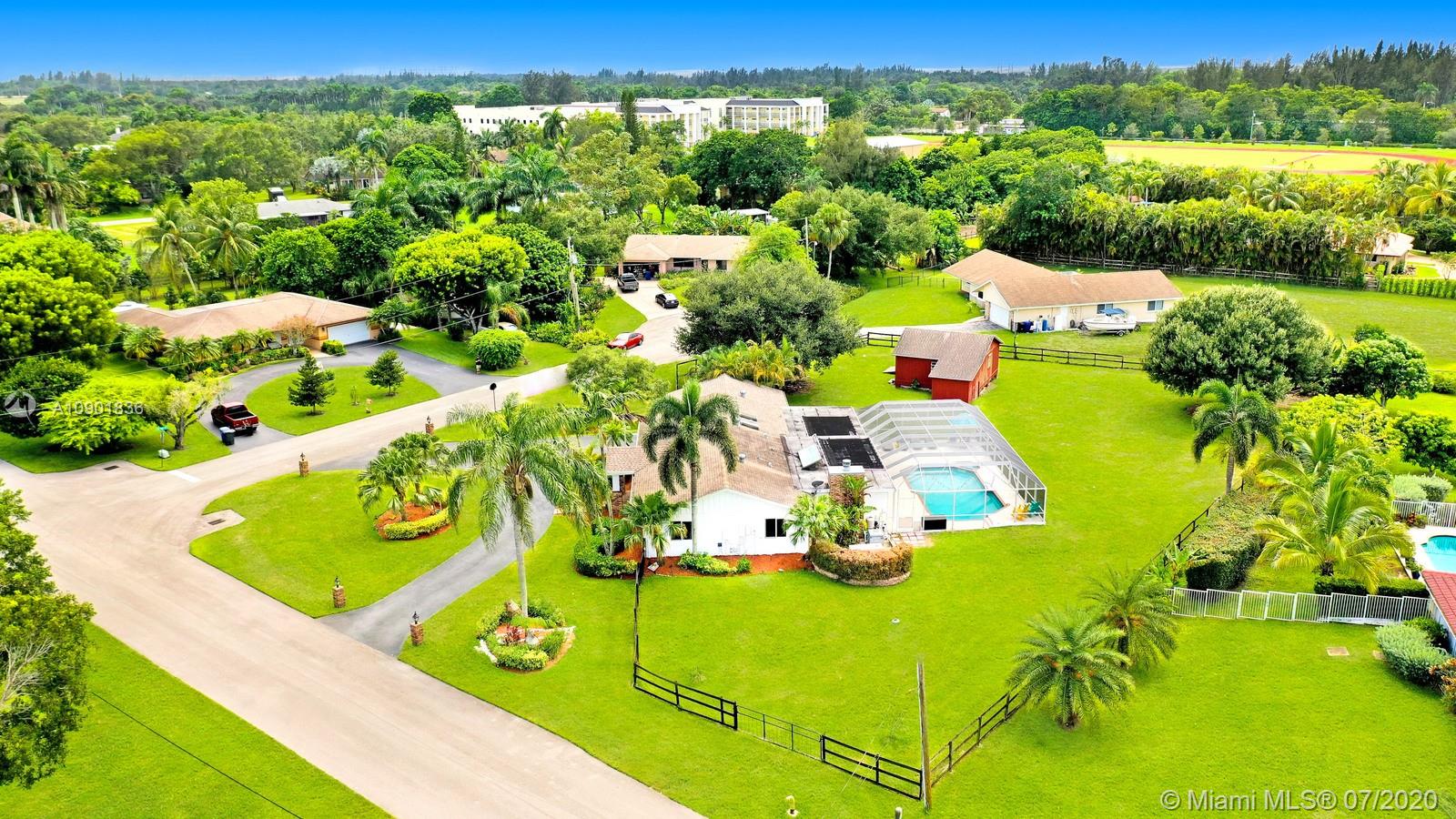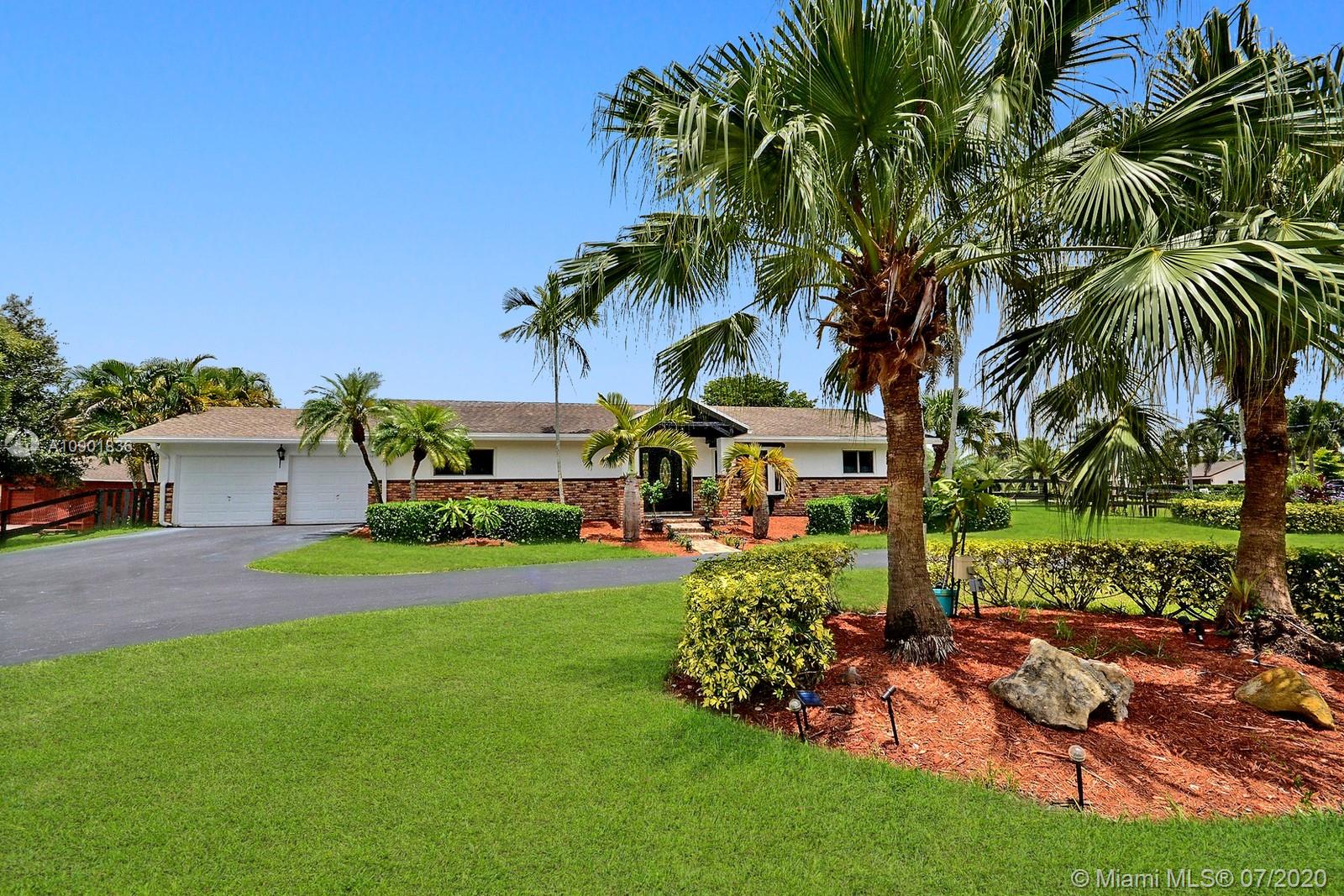 WELCOME TO THIS SPECTACULAR HOME IN THE SOUGHT-AFTER EQUESTRIAN-FRIENDLY COUNTRY ESTATES COMMUNITY OF SOUTHWEST RANCHES. HOME FEATURES A WELCOMING FRONT ENTRY WITH BAY WINDOW, MODERN WOODLIKE PLANK FLOORING, CROWN MOLDING RECESS LIGHTING & CEILING FANS. STUNNING EAT-IN KITCHEN IS ILLUMINATED BY NATURAL LIGHT FROM 2 SKYLIGHTS W WOOD CABINETS, GRANITE TOPS, STAINLESS APPLIANCES INCLUDING WARMING DRAWER & DOUBLE WALL OVER. GORGEOUS WOOD-BEAMED FAMILY ROOM WITH ROMANTIC FIREPLACE OPENS TO THE COVERED PATIO & LARGE SCREENED-IN HEATED POOL & SPA W SOLAR PANELS. SPACIOUS MASTER BED W ENSUITE MASTER BATH. LARGE FULLY FENCED YARD W 500 SQ FT BARN (APPROXIMATELY) W WATER & POWER (AND ITS OWN ELECTRICAL BOX), SHED, ALL SITUATED ON A 34,000 SQ FT CORNER LOT W 2 CAR GARAGE & CIRCULAR DRIVEWAY. NO HOA.