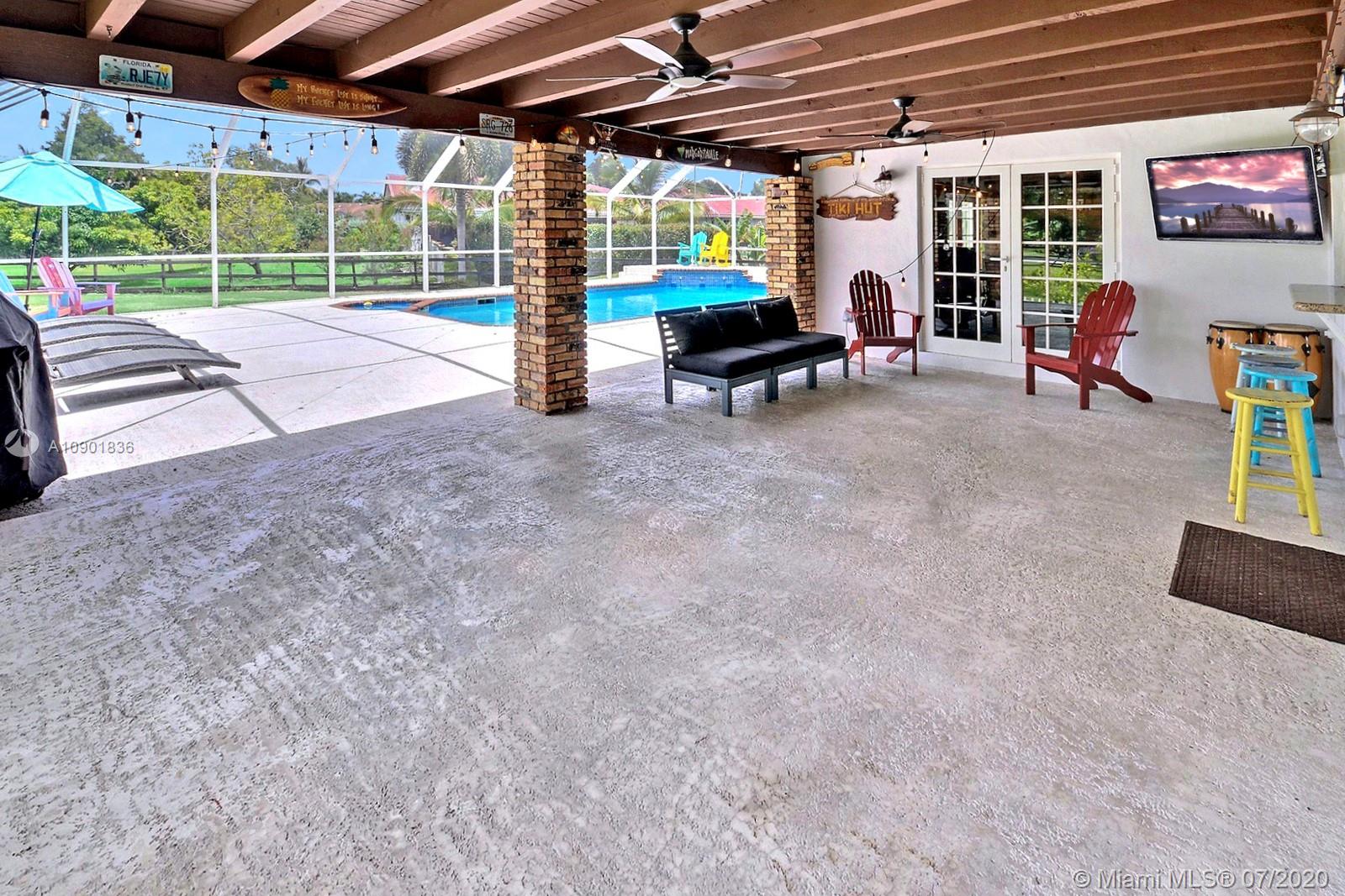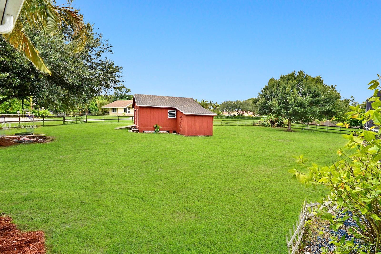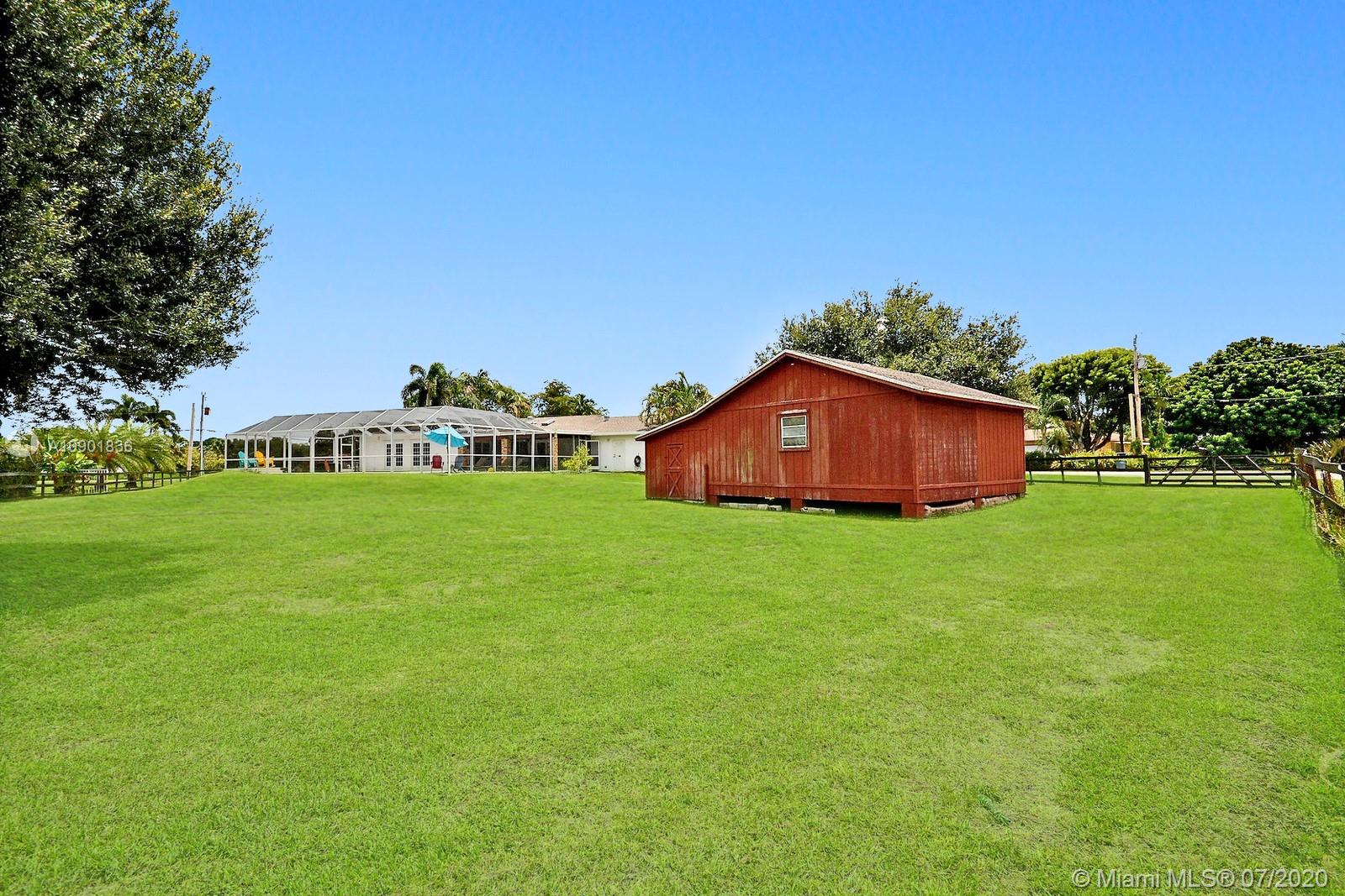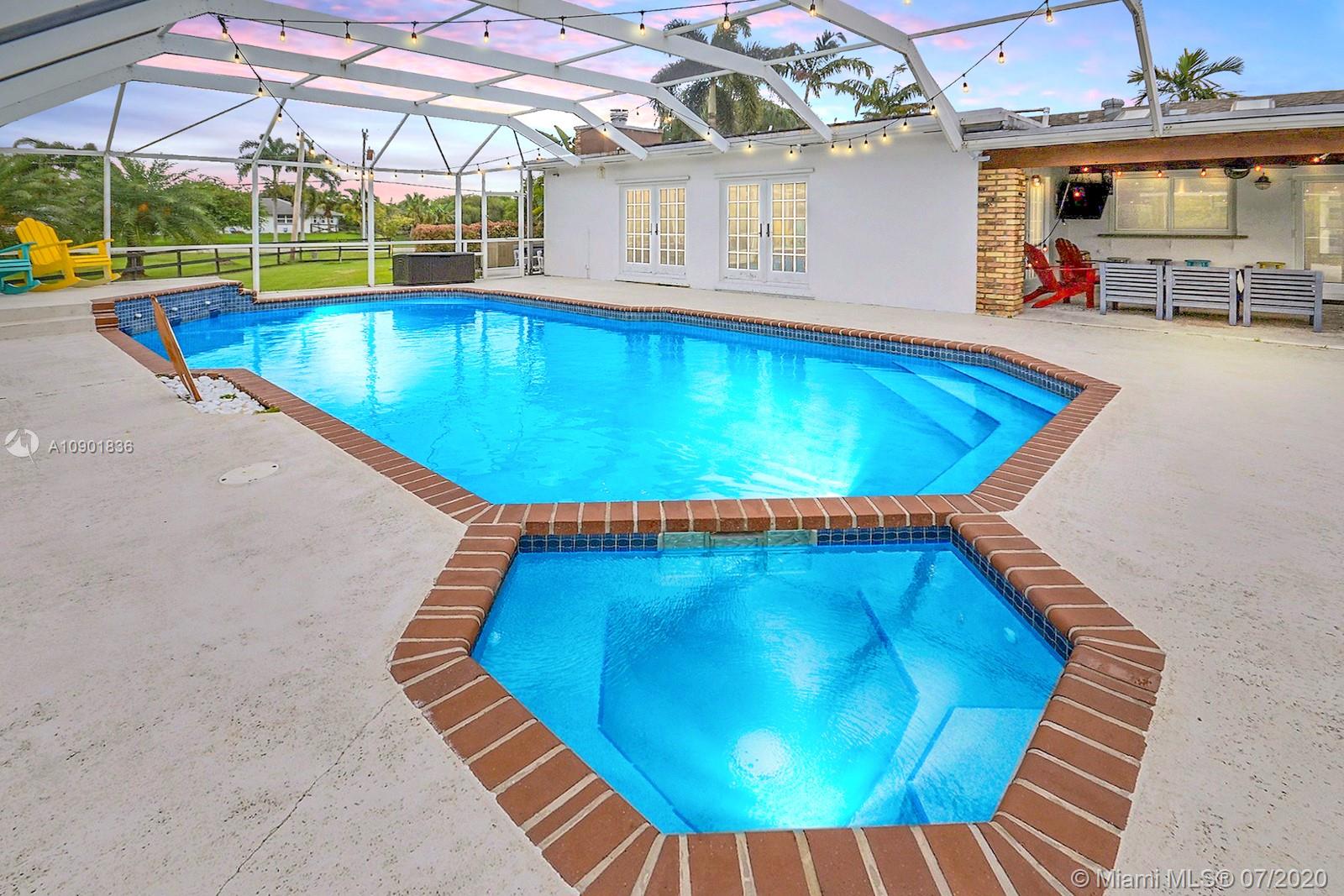 WELCOME TO THIS SPECTACULAR HOME IN THE SOUGHT-AFTER EQUESTRIAN-FRIENDLY COUNTRY ESTATES COMMUNITY OF SOUTHWEST RANCHES. HOME FEATURES A WELCOMING FRONT ENTRY WITH BAY WINDOW, MODERN WOODLIKE PLANK FLOORING, CROWN MOLDING RECESS LIGHTING & CEILING FANS. STUNNING EAT-IN KITCHEN IS ILLUMINATED BY NATURAL LIGHT FROM 2 SKYLIGHTS W WOOD CABINETS, GRANITE TOPS, STAINLESS APPLIANCES INCLUDING WARMING DRAWER & DOUBLE WALL OVER. GORGEOUS WOOD-BEAMED FAMILY ROOM WITH ROMANTIC FIREPLACE OPENS TO THE COVERED PATIO & LARGE SCREENED-IN HEATED POOL & SPA W SOLAR PANELS. SPACIOUS MASTER BED W ENSUITE MASTER BATH. LARGE FULLY FENCED YARD W 500 SQ FT BARN (APPROXIMATELY) W WATER & POWER (AND ITS OWN ELECTRICAL BOX), SHED, ALL SITUATED ON A 34,000 SQ FT CORNER LOT W 2 CAR GARAGE & CIRCULAR DRIVEWAY. NO HOA.