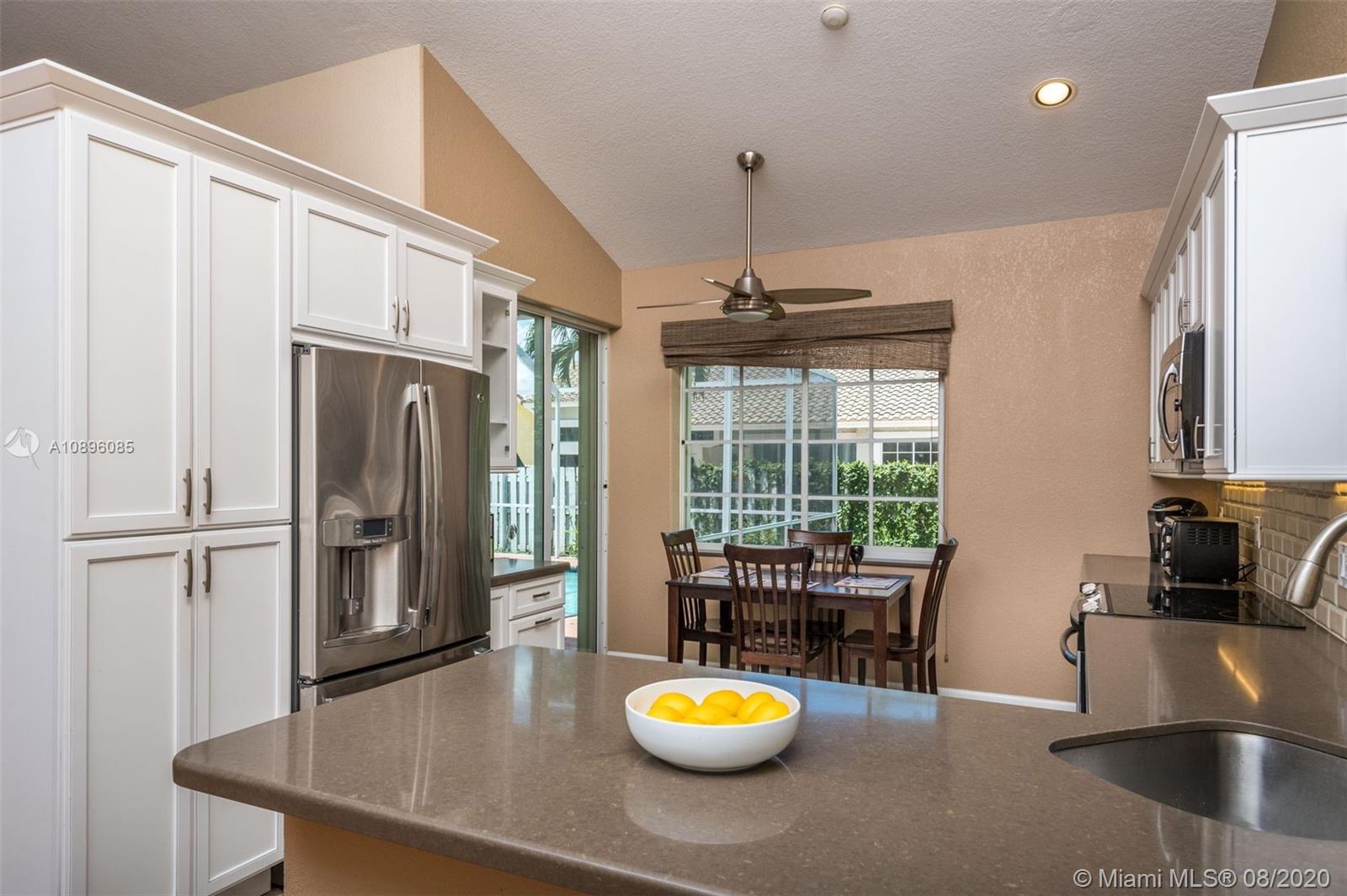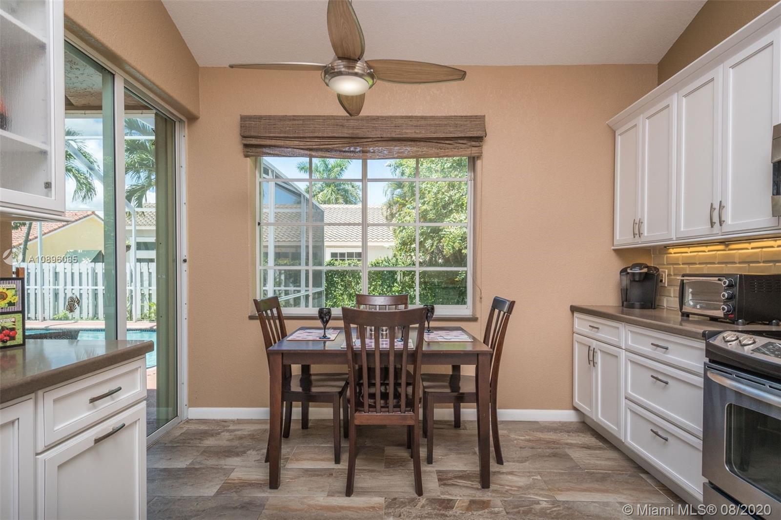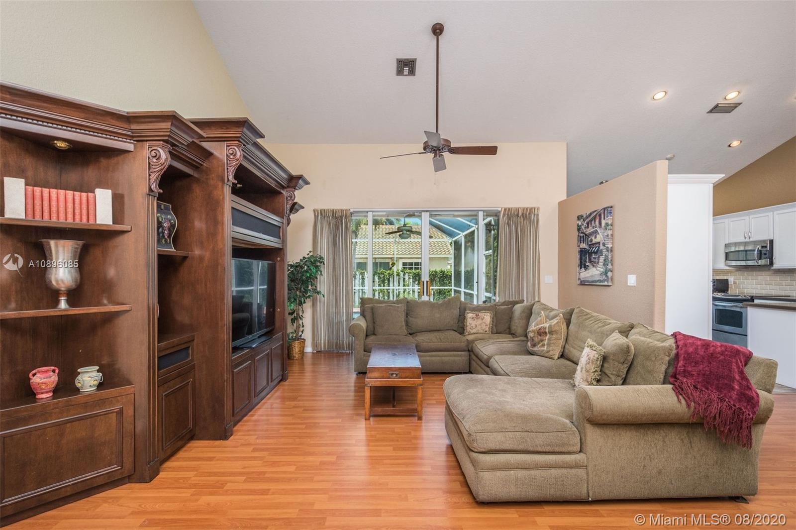 This beautiful 3 bedroom home w/hardwood floors throughout main living area and newly renovated kitchen, is perfect for a family who loves to entertain. With views of the sparkling pool from every vantage point and a screened-in porch, enjoy dining and relaxing with ample outdoor space. The split floor plan has the main bedroom privately situated, complete w/a spacious ensuite bathroom, dual sinks and large closets. An open-air feeling, this home has a combined living and dining room concept. Special features include: Newer roof (2013), brand new gutter system, accordion shutters, hurricane-proof garage door, new sprinkler system, new electric panel and custom-made infant pool fence. Quiet tree-lined neighborhood on cul-de-sac. Gated community and A+ schools. This is the perfect home!