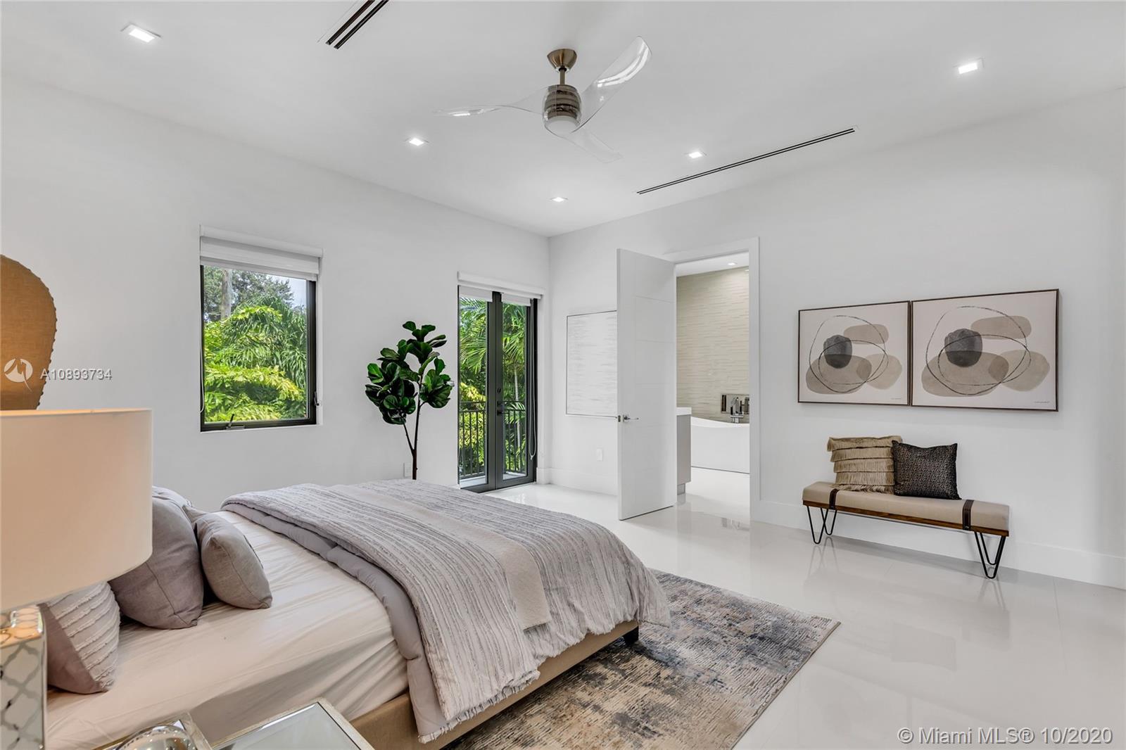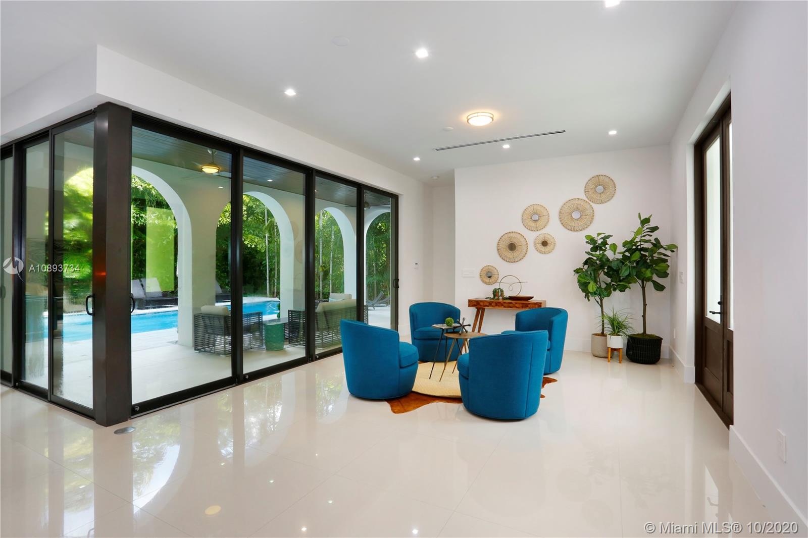 This spectacular brand-new construction home in South Gables is nothing short of amazing. The entryway leads to a spacious open floor plan living area & huge wall-to-wall 9ft stackable sliding glass impact doors w/ stunning pool views. The gourmet kitchen is made up of Subzero & Bosch appliances, waterfall quartz countertops, a giant walk-in pantry, & custom Spaniard cabinetry. The light cove above the family room sets the ambiance for this perfect seating area. Every room is given its own private bathroom & walk-in closet. The master bedroom offers an enormous walk-in dressing room closet & the gorgeous master bathroom with its freestanding tub & separate shower. The backyard has a covered patio terrace & low maint. due to the fashionable Shellock Pavers flooring & artificial turf area.