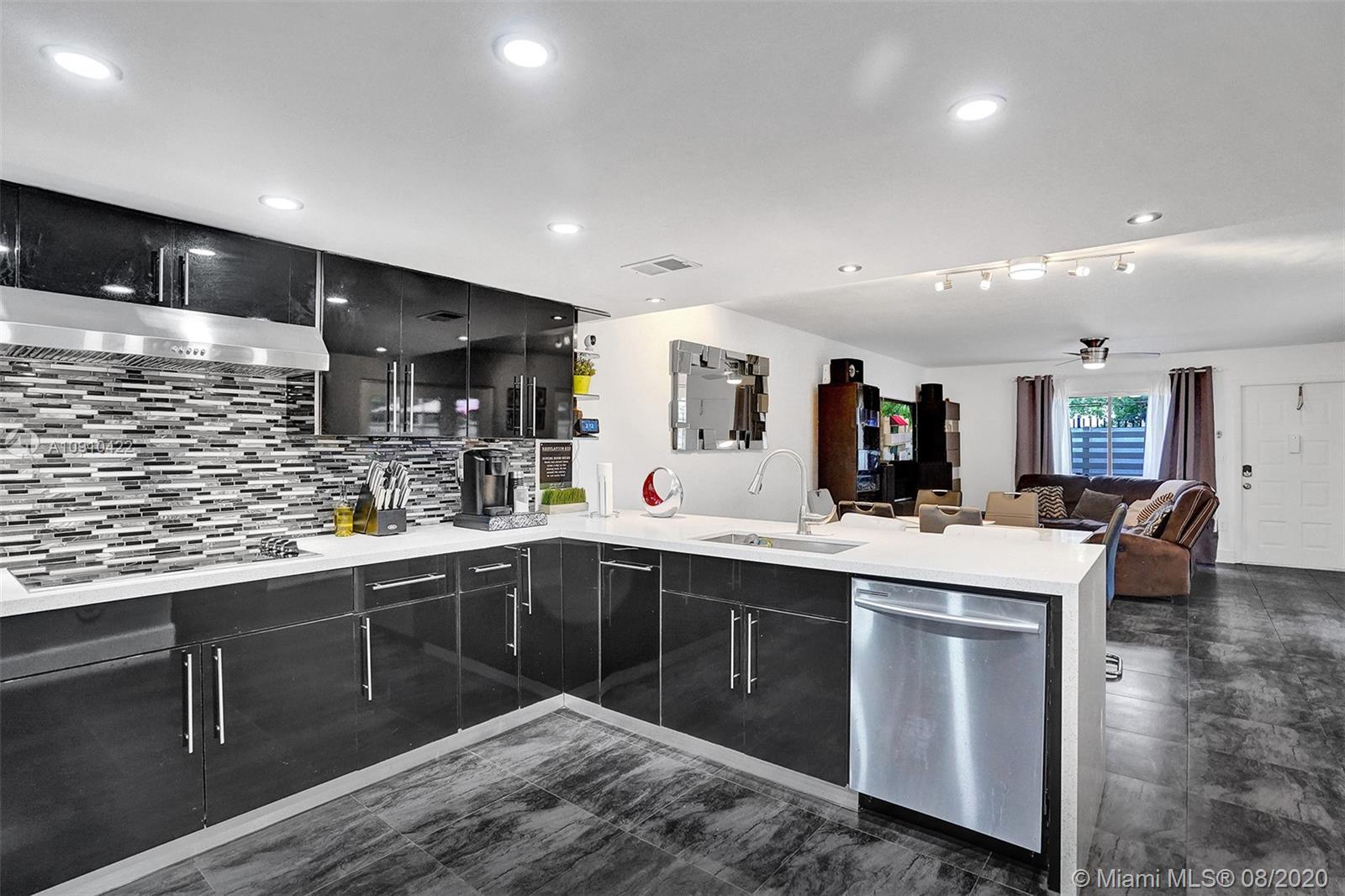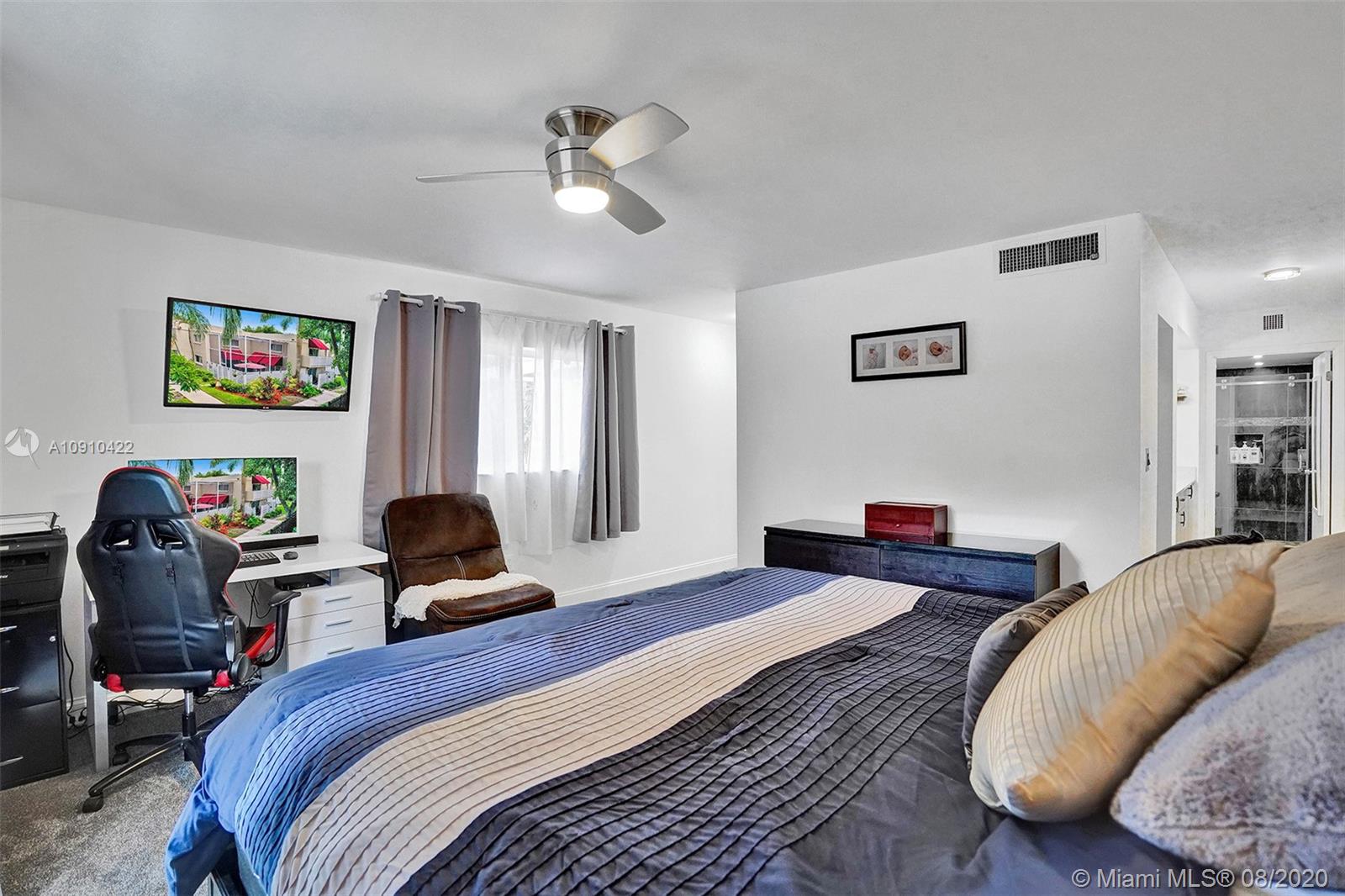Beautifully updated 3/2.5 in Arbor Courts. The kitchen was completely opened and finished with a white Quartz waterfall counter top with contrasting cabinets and ceramic tiles throughout, adjustable LED lights with 3 colors, and Samsung appliances. Security includes a Ring door bell and a smart lock on the front door controlled through your phone. New glass railing on the stairs, brand new carpet on the steps and in both bedrooms upstairs, newer washer and dryer and all 3 bathrooms were updated, with a Quartz double vanity in the master.