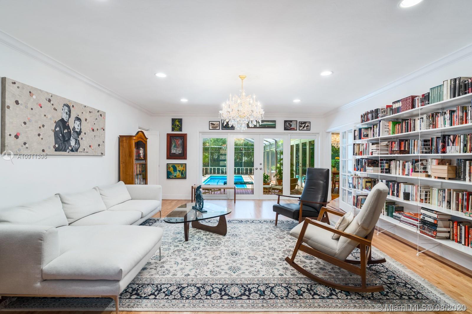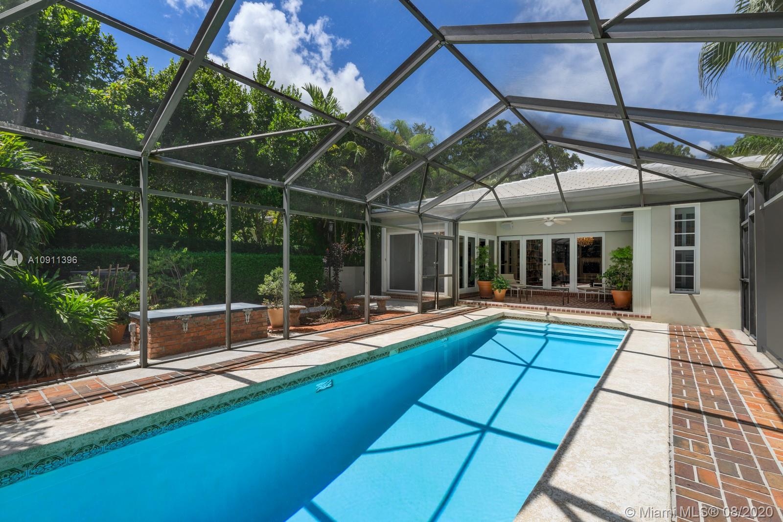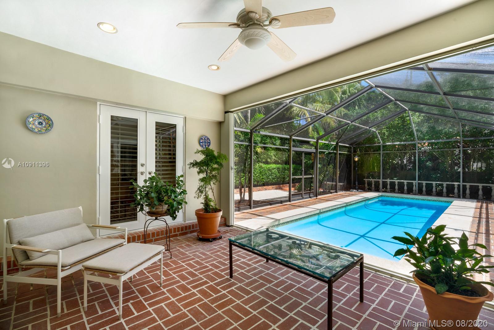 South of France inspired Jewel box home, turn-key in central Gables, a short walk to restaurant/galleries/shops/cinema/Biltmore/Venetian Pool/golf. One story original details, fully and lovingly restored & updated. Brick driveway and iron gate courtyard lead to foyer and spacious living room. Statuary marble and elegant black wood kitchen features top of the line appliances. Sunny breakfast/Dining Room. Covered patio, sparkling pool and private garden. 3rd room currently used as office/media but can easily add closet. New: IMPACT, bathrooms, wood floors throughout, Sub-Zero refrigerator, LG washer/dryer, Miele dishwasher. 2015/2016 roof/ac/gutters/electric and garage door. Appraiser sketch Living Area is 1,834 sf and Total Area is 2,381 sf. Five chandeliers are excluded.