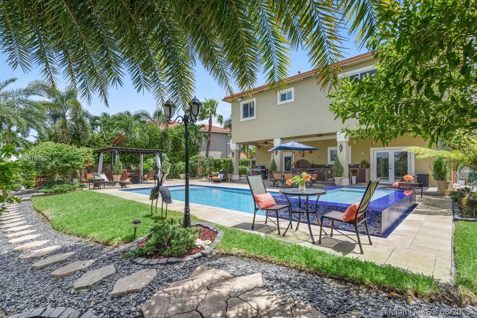 WISHING FOR AN OPULENT LIFESTYLE, THIS HOME IS FOR YOU! Newer home (7 years old) located on a navigable waterfront overlooking a preserve. This pristine 4beds/3baths residence welcomes you to a 20 foot high sumptuous foyer entrance. High end Italian travertine flooring inside and throughout the pool deck. First floor features a formal living area & dining room, wet bar, cabana bath, kitchen and breakfast area, all opening to a private desirable backyard featuring: a mature exotic tropical garden, an outdoor kitchen, a pergola and salt water pool w/10 p spa overflowing. Luxurious 2nd floor features the master suite, 3 bedrooms, a bathroom and convenient laundry area. High ceilings on both levels. The high ceiling 600 sqft garage w/tall organizers is fully a/c. More to discover, come & see