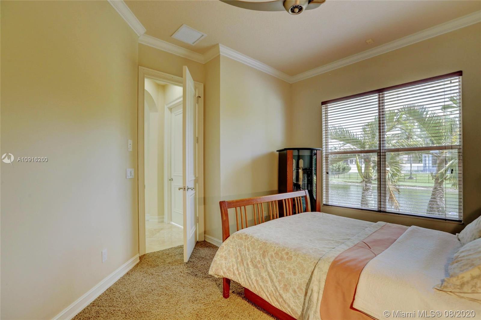 Immaculately maintained one-story home w/4 bed /3 bath+office, circular driveway, split floor plan, large Master's suite w/ sitting area, two walk-in closets, 15 ft ceiling, crown molding.*Amazing open lake view w/fountain, built-in barbecue perfect for entertaining, heated pool and spa and beautifully landscaped. 24” Travertine flooring in main areas & baths, hardwood floors in Master* Spacious open kitchen w/high-end wood cabinetry, built-in refrigerator, stainless steel appliances, granite counter tops, center island, central vacuum, custom built closets. *2 a/c units replaced in 2018, recently painted exterior/interior, recently refinished floors. Exclusive Clubhouse & Spa, a resort style pool, playground, fitness center, basket/volleyball, several tennis courts, 24/7 security.