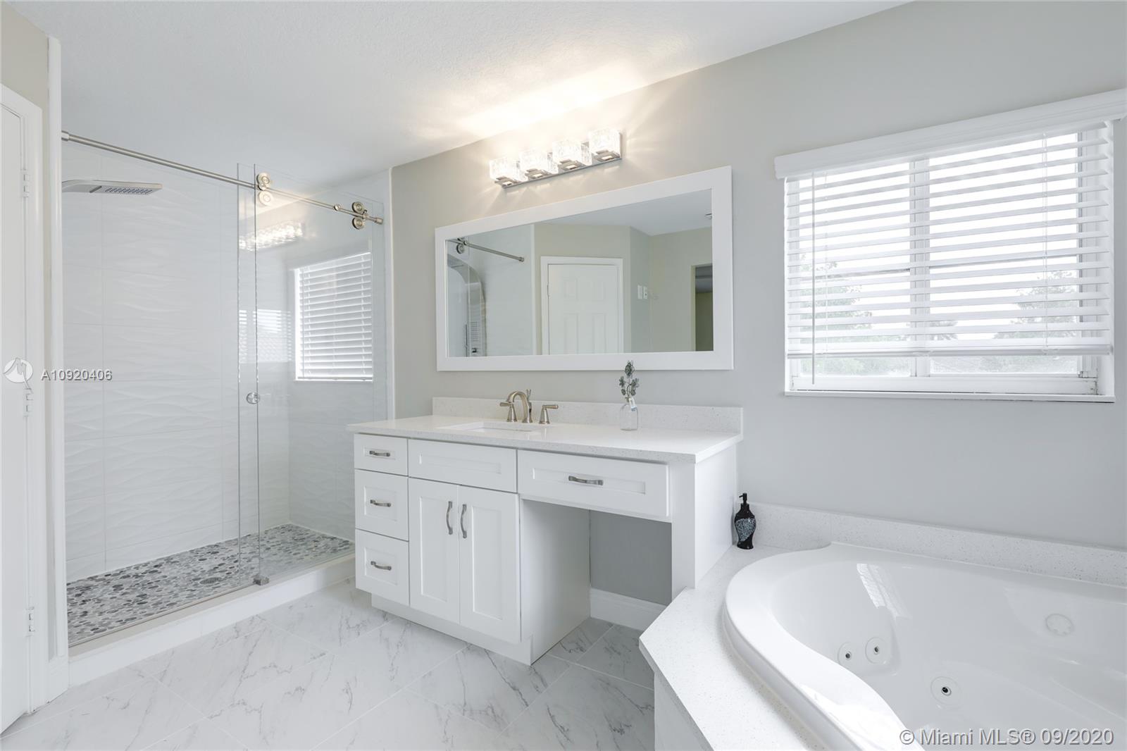 Beautifully remodeled gem boasts 5 bedrooms and 4 baths with all the features you would want in a dream home. Walk in to towering ceilings and beautiful all wood staircase and you'll immediately notice the tons of natural light poring into every room. The yard is massive for this area and is tastefully landscaped with gardens and shade trees. Remodeled kitchen with quartz counters and shaker cabinets, remodeled master suite with designer bathroom finishes, new engineered wood floors on the top floor, 2 new AC's ( 3 years old ), all new light fixtures throughout and accordion shutters on all the top floor windows. 1 bedroom and 1 bath on the ground floor and upstairs 1 of the spare bedrooms is an en suite. Top rated Weston schools and top of the line amenities and clubhouse.