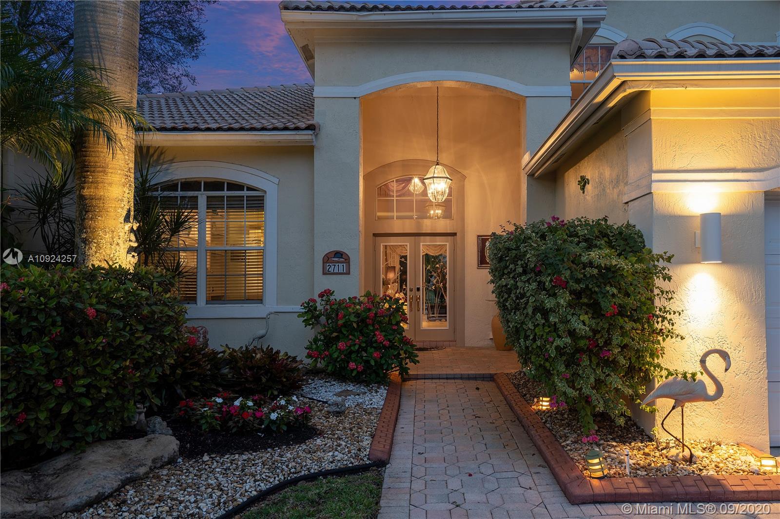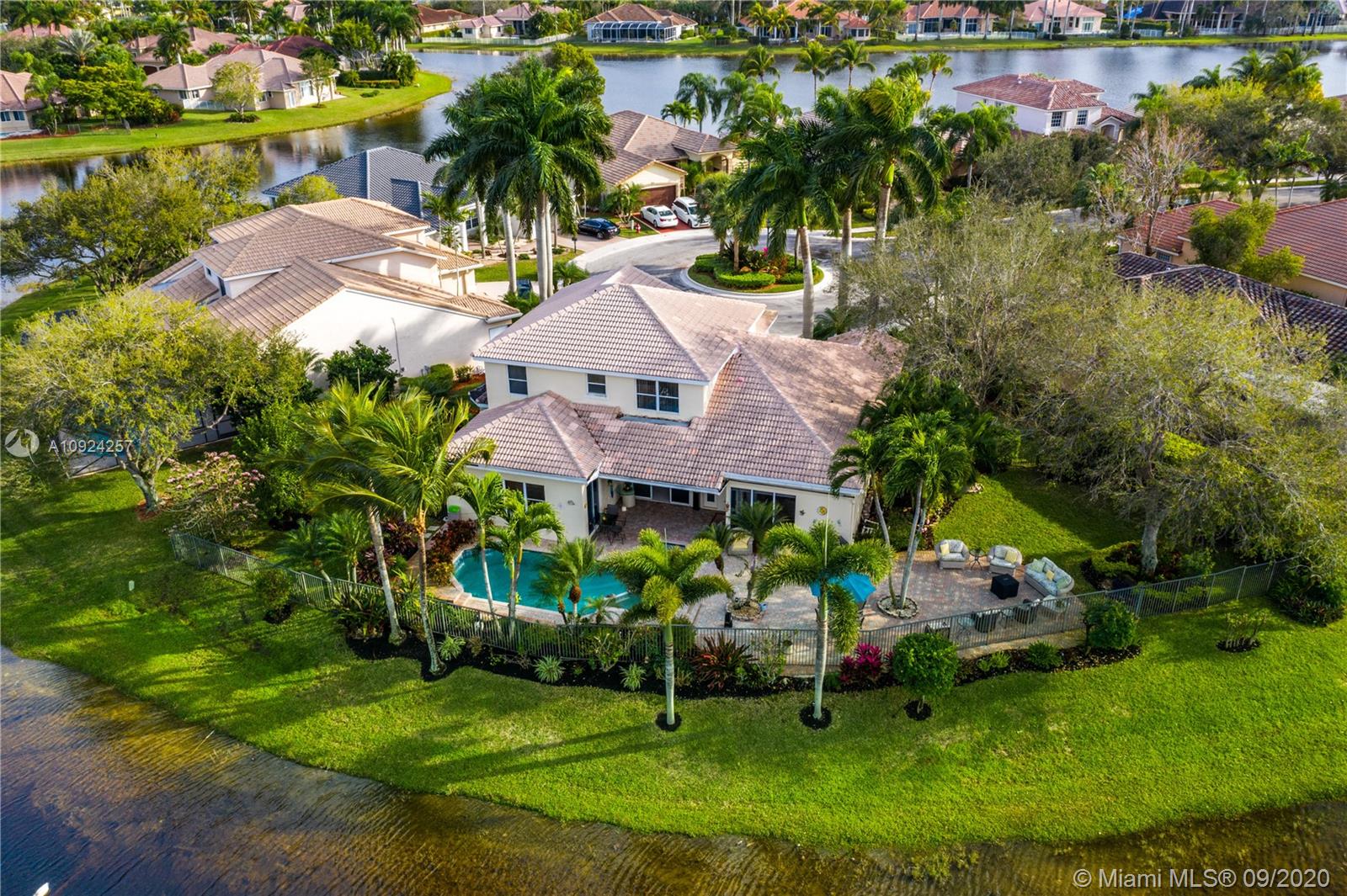 Weston Hills C.C. 16,095 sf pie shaped cul-de-sac lot w/gorgeous lake views 5B/4B 3834 Sq ft home boasts a Lg extended paved patio custom pool waterfalls new led lights, hot tub fenced Perfect for Entertaining! Surround sound system! Grand Master BR 1st Fl w/3 BR upstairs w/5th BR downstairs used as office/den w/custom closets/built-in Lg neutral diagonal Tile throughout, Carpet in BR. Spacious, Huge dine in Gourmet Kitchen w Granite/New Appliances/extra tall cabinetry/wine cooler/Lg island & Bar/Built in Elec. Sweeper/Vacuum System Formal Dining & Living Room WHCC an exclusive family-oriented community in City of Weston w/2 pristine 18-hole championship golf courses, known as Weston Hills Golf and Country Club. "A" rated schools and easy access to the hwy. AC's 5 yrs. Appraised 9/2020.