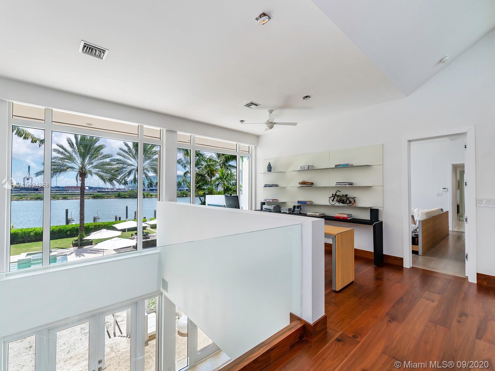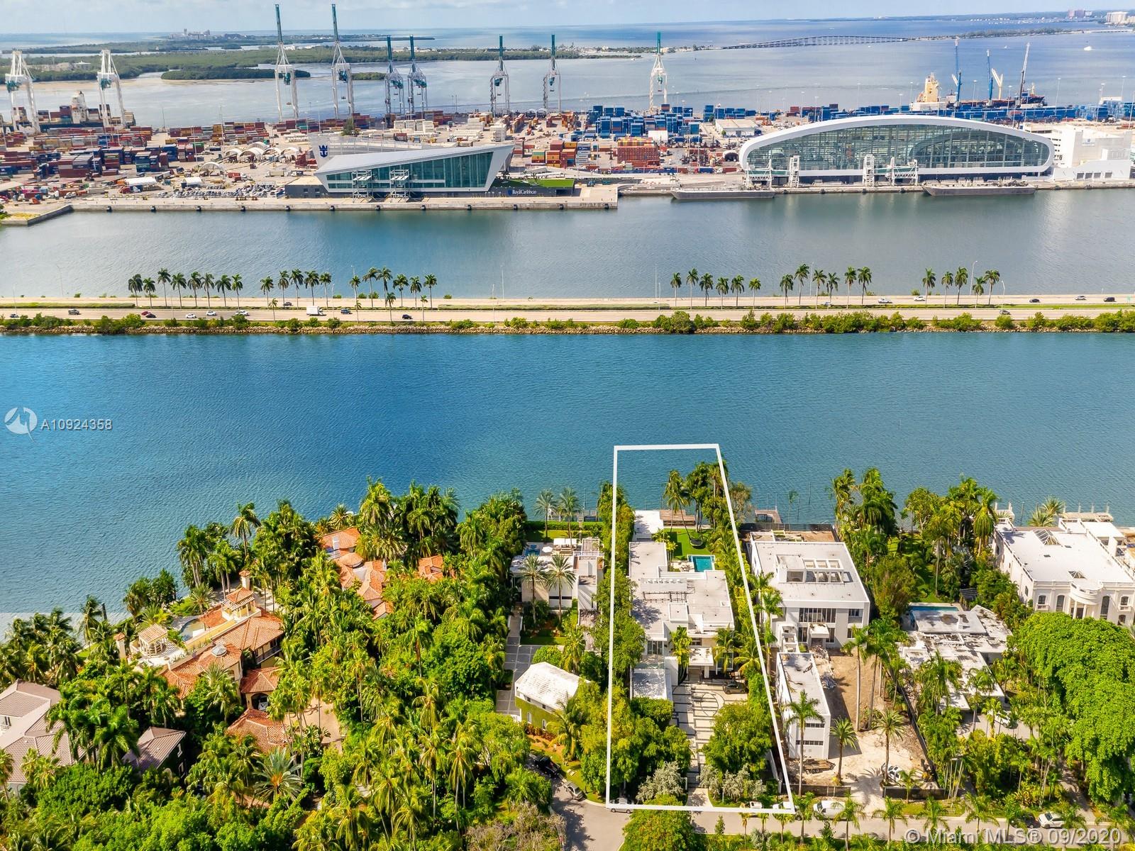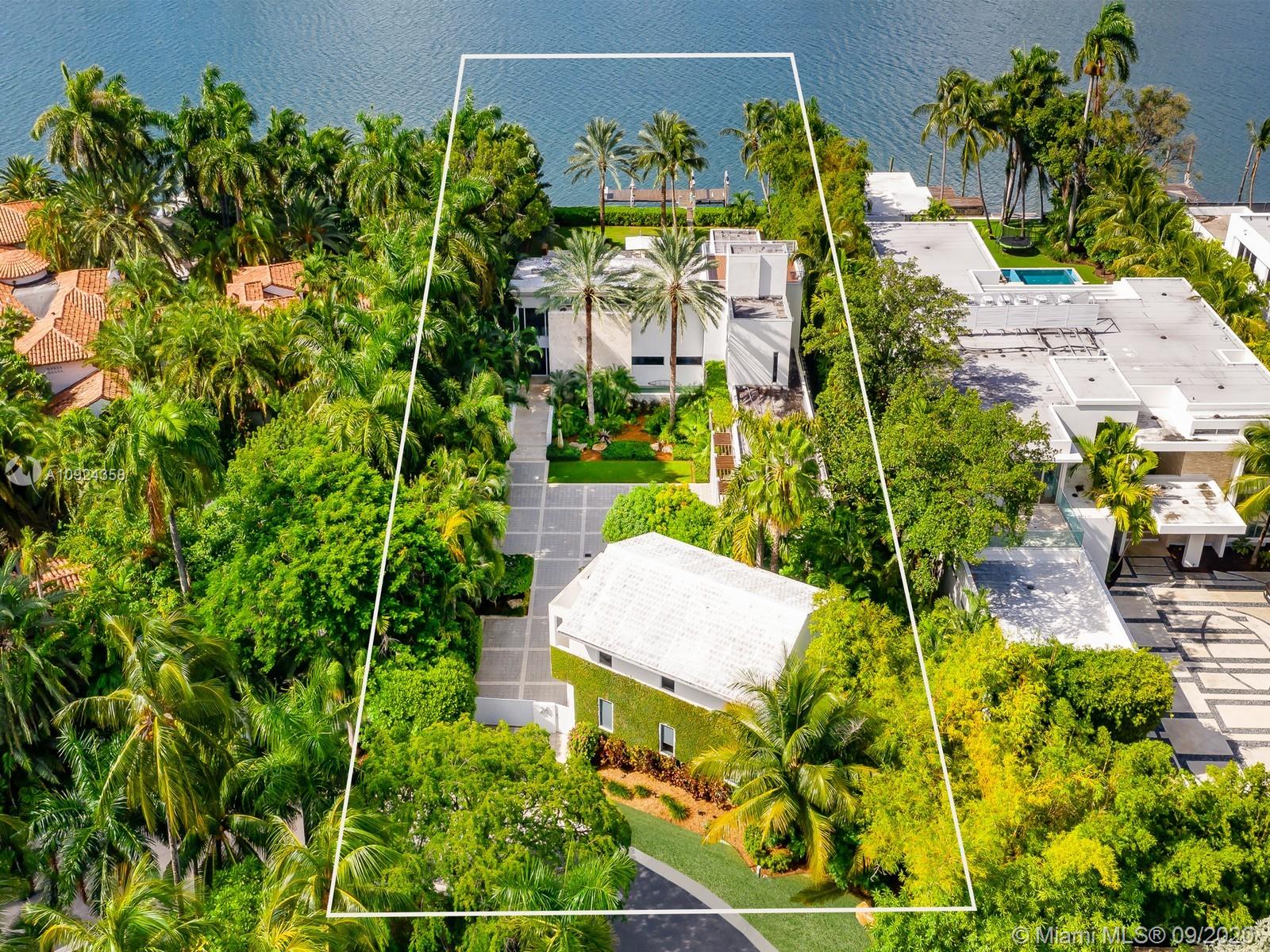 This stunning gated WATERFRONT 2-story MODERN home+guest house on guard-gated Palm Island lies on an expansive 27,500 SF LOT w/100’of waterfront which overlooks Biscayne bay&the Miami skyline.Home offers 7 bed+7.5 bath,impact windows throughout,open spaces through the formal living rm&dining rm w/double height ceilings,updtd kitchen w/subzero&wolf appliances,3 beds w/ensuite bths,family room+views of the outside area which features a large edge pool+summer kitchen.Stairs to the master suite,w/private terrace.Separate 2 story guest home features 3 full beds w/ensuite baths as well as an additional room&laundry space.4 car grg+additional parking space inside.Palm Island has new landscape plan&features 24/7security,park,lighted tennis courts&more, the ideal location for a family!