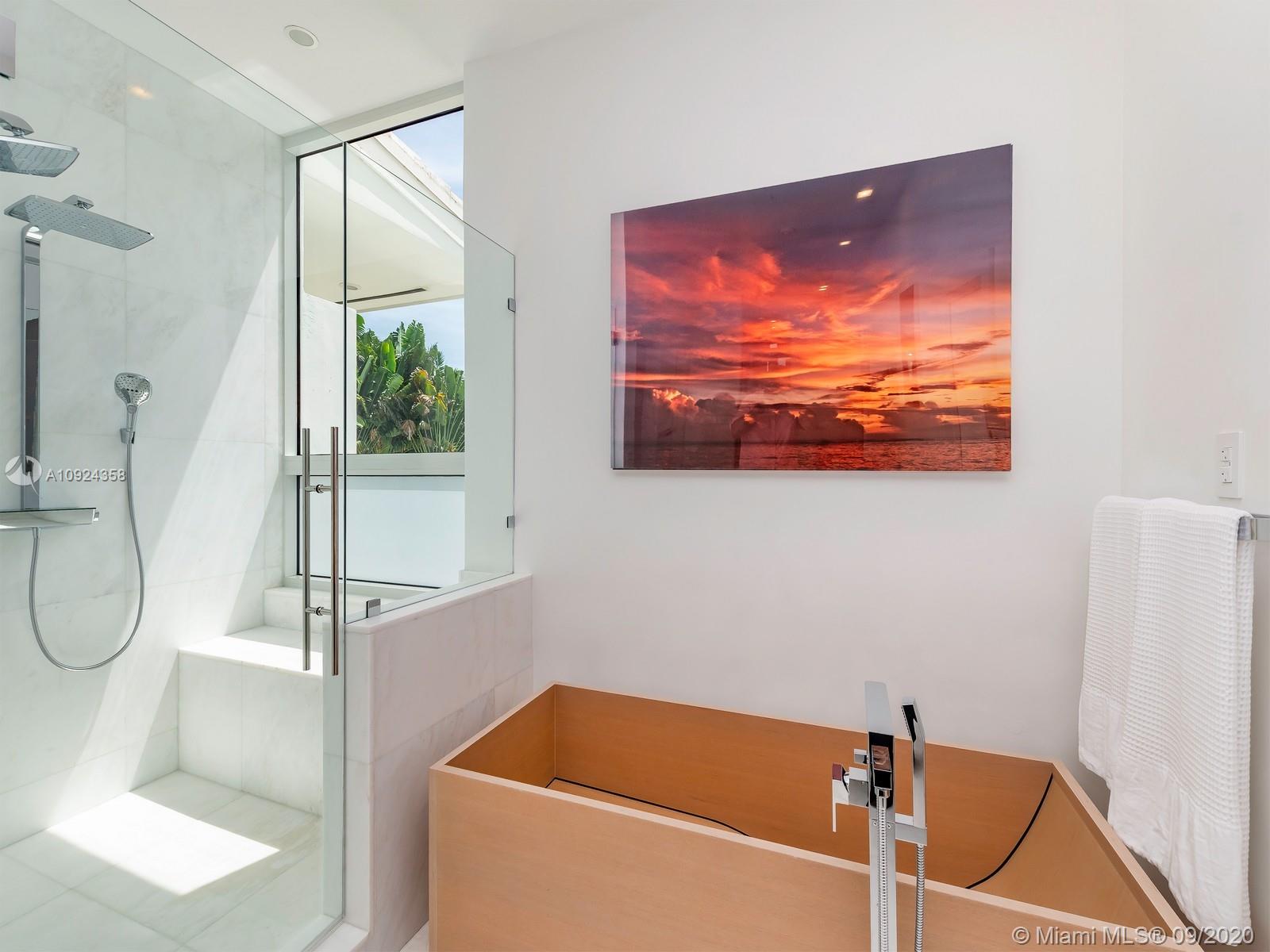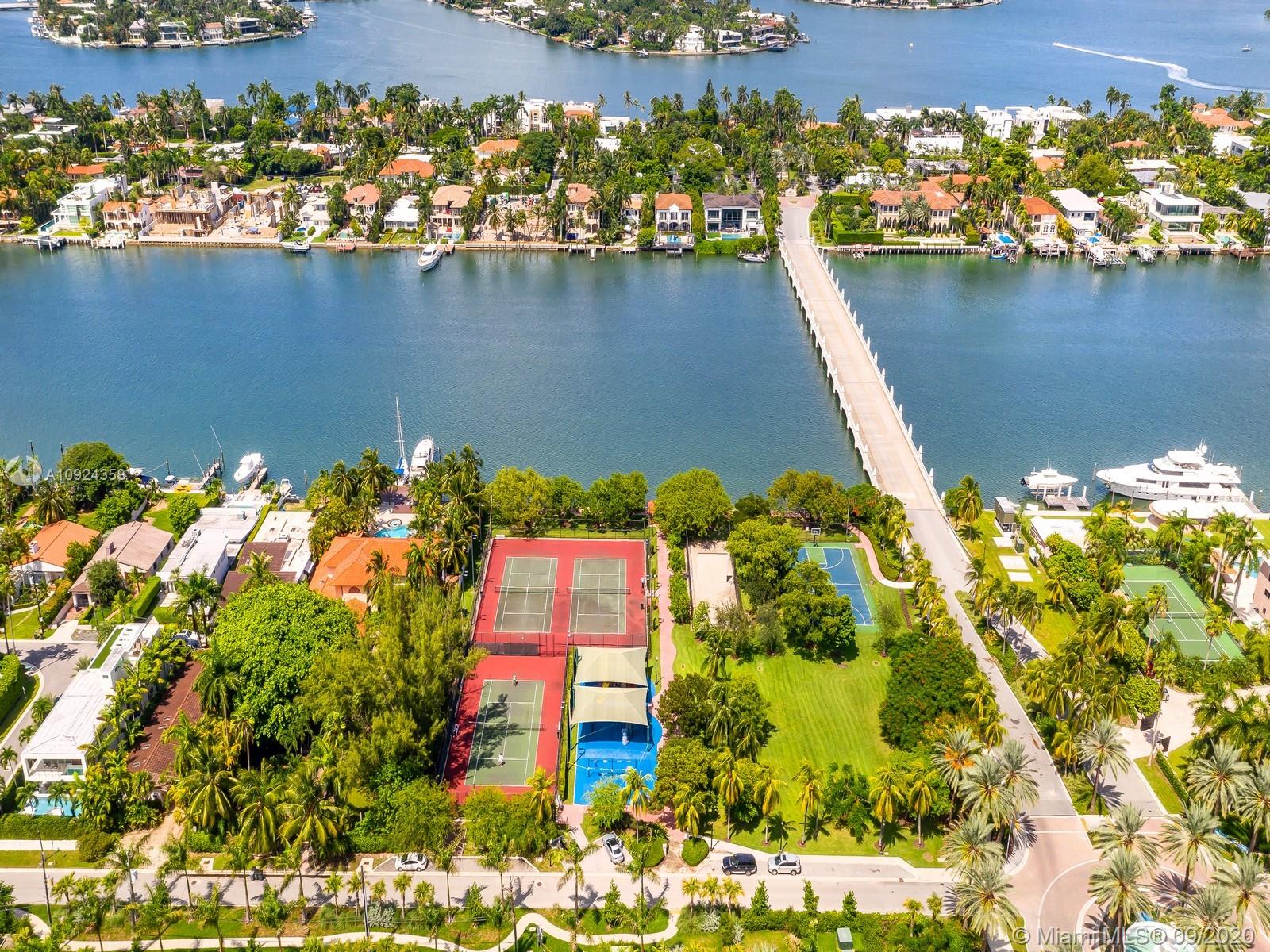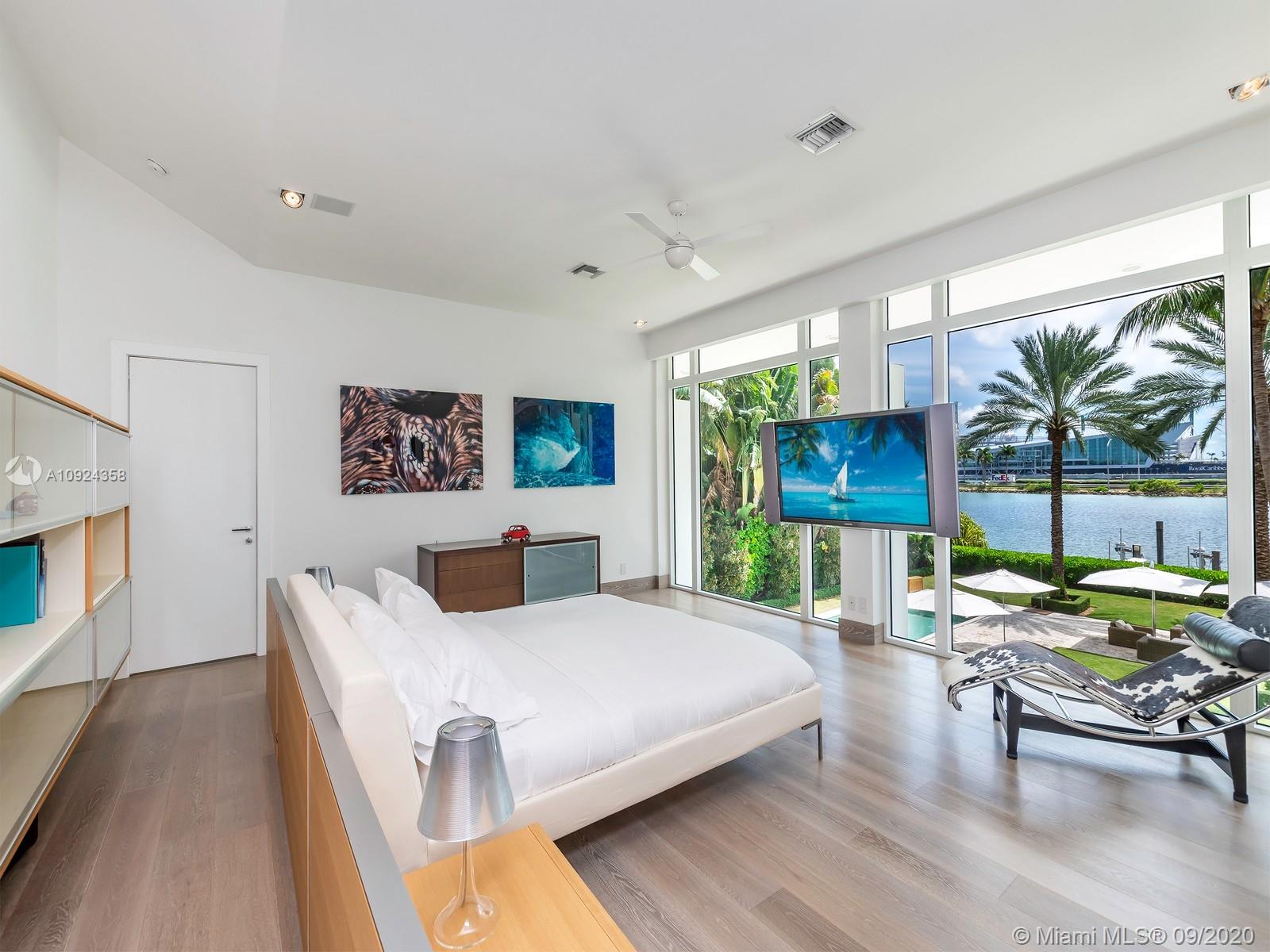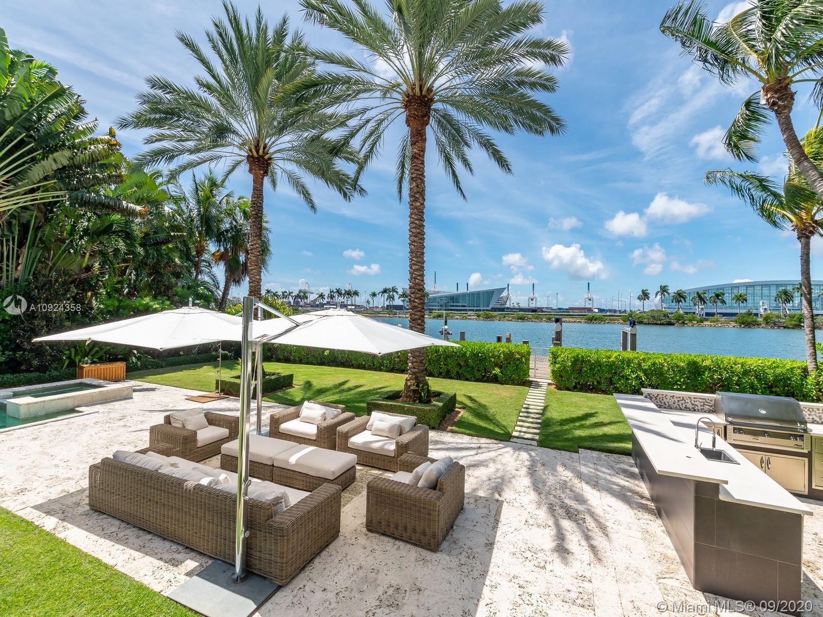 This stunning gated WATERFRONT 2-story MODERN home+guest house on guard-gated Palm Island lies on an expansive 27,500 SF LOT w/100’of waterfront which overlooks Biscayne bay&the Miami skyline.Home offers 7 bed+7.5 bath,impact windows throughout,open spaces through the formal living rm&dining rm w/double height ceilings,updtd kitchen w/subzero&wolf appliances,3 beds w/ensuite bths,family room+views of the outside area which features a large edge pool+summer kitchen.Stairs to the master suite,w/private terrace.Separate 2 story guest home features 3 full beds w/ensuite baths as well as an additional room&laundry space.4 car grg+additional parking space inside.Palm Island has new landscape plan&features 24/7security,park,lighted tennis courts&more, the ideal location for a family!