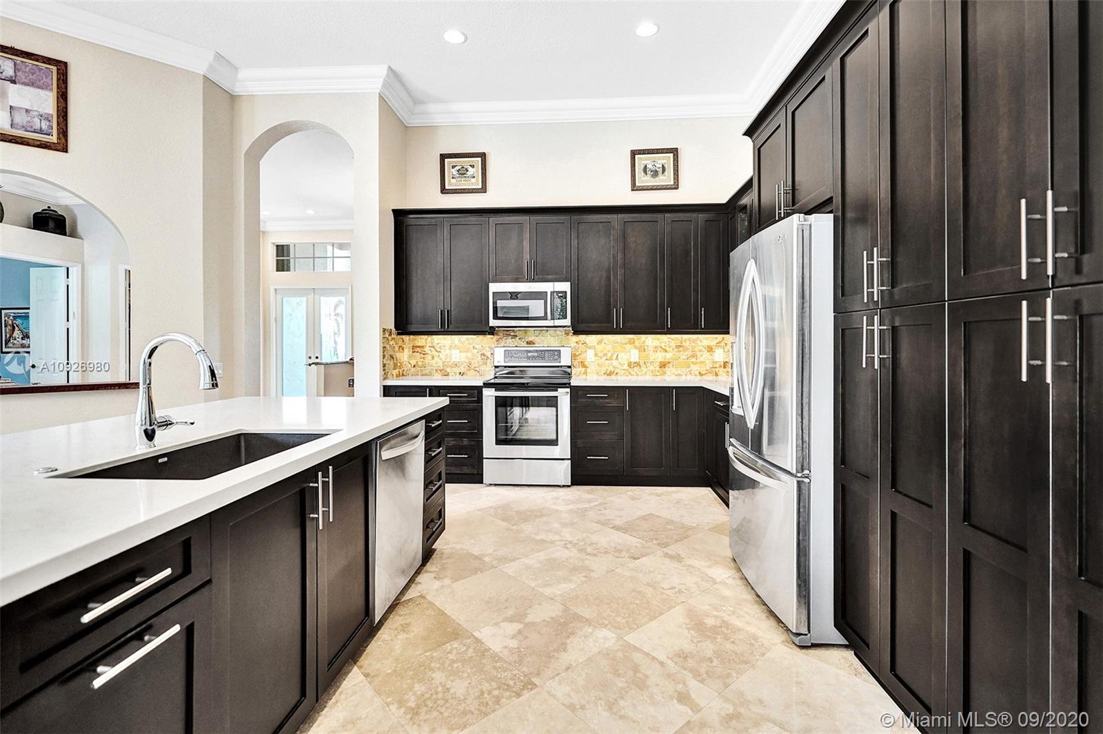 Meticulously maintained and updated five-bedroom, three-bath home in Weston Hills Country Club. The center of the home is punctuated by a completely renovated kitchen with tall wood cabinets, massive eat-in island, silgranit sink, Caesarstone quartz countertops, stainless steel appliances, and onyx backsplash. Open floor plan with sightlines throughout the house. Marble and wood floors, custom closets in every room, built-in surround sound speakers, a large and private backyard for entertaining, Hunter Douglas Duette blinds, epoxy garage floor, and painstaking attention to detail make this house a rare find and a perfect home.