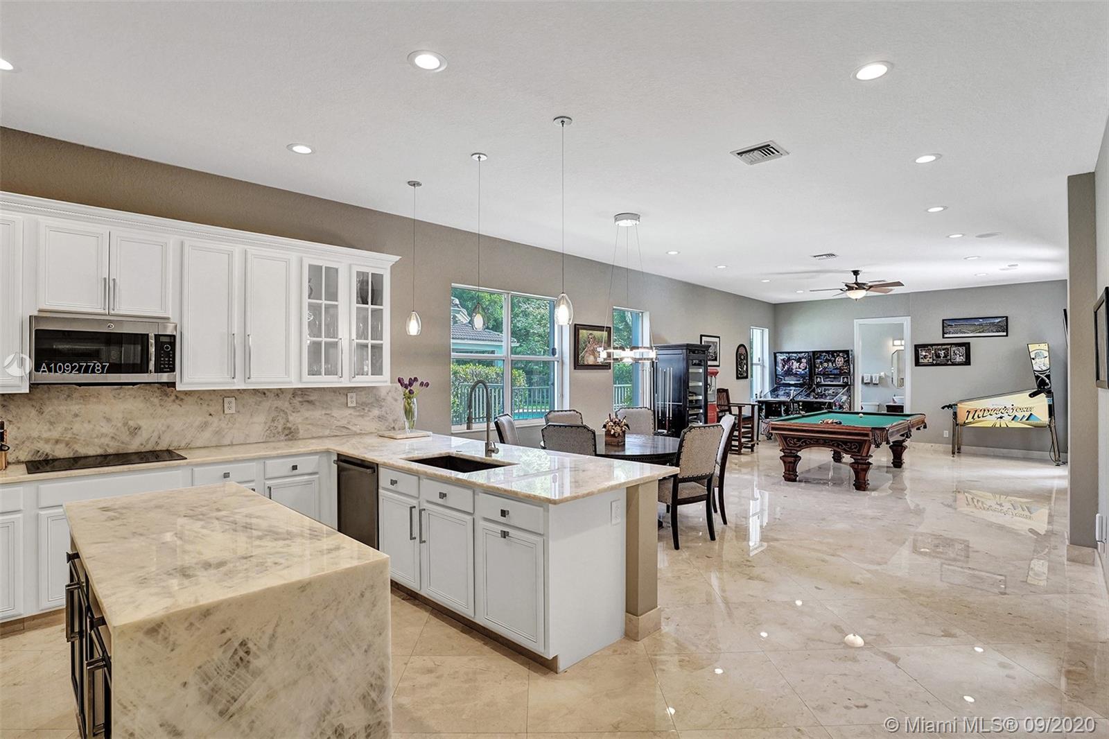 Recently renovated luxury estate home located in The Isles of Weston.Popular Montego model features 6BR/5.5BA office*large loft/game room. Spacious gourmet kitchen with 42" white wood cabinets, center island, new white quartzite counters, backsplash, stainless steel appliances, double wall oven, wine refrigerator, walk-in pantry. Newly re-built heated pool w/ dual fountains, travertine pool deck, and expansive covered patio.Grand owners suite on the first level with a new modern bathroom including a vessel tub, dual sinks, Toto Neorest toilet, custom walk-in closet. New marble flooring on the first level. Plush carpet on the 2nd level.Full accordion protection. 4 car garage. Backs to berm with no neighbors behind for privacy. Walk to the state of the art community center.