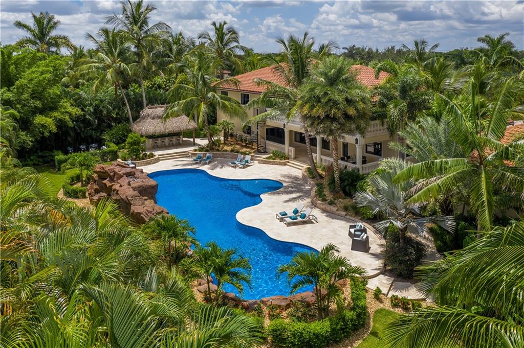 Sunshine Ranches privately-gated 6944SF/6BR/4.5BA sprawling estate. Interior boasts marble and hardwood flooring, granite surfaces, open kitchen, impact glass and more. Owner’s Suite opens to sweeping balcony/outdoor spiral staircase for access to grounds. Outside is a wonderland built with tranquility, health and entertaining in mind. Winding/circular drive leads past a private pond, up to 6-car (air-conditioned) garage. Impeccable grounds showcase lush foliage, landscape lighting and a tiki pavilion suitable for large gatherings. Carved pathways lead to a freeform, saltwater (heated/chilled) pool spanning 75’x40’ with lighted lap lane for the serious swimmer or triathlete, and expansive summer kitchen for the cool down. Truly unbelievable in every way and not to be missed. Show and sell.