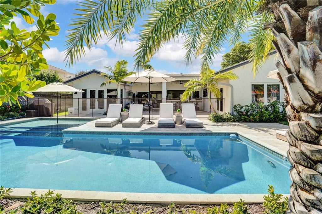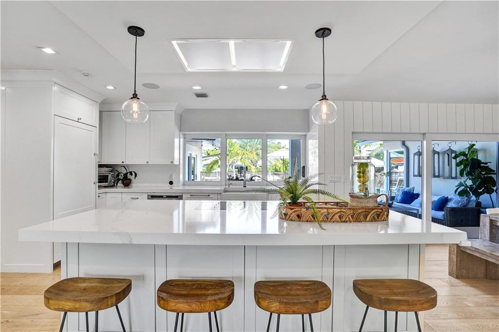 Coastal contemporary with exquisite attention to detail at every turn. COMPLETELY reconstructed in 2017 including: roof, impact windows/doors, NEW raised seawall, NEWLY built pool, kitchen, flooring, bathrooms and more. Light and bright open floorplan. Gourmet kitchen boasts quartz countertops, white shaker cabinetry and Wolf induction stove. Beautiful French White Oak flooring and Shiplap walls throughout. Master suite features custom closets, motorized blackout shades and spa like bath with steam shower and tub. Spacious secondary bedrooms. Backyard oasis with covered space for entertaining, pool, grass area and 85’ waterfront.