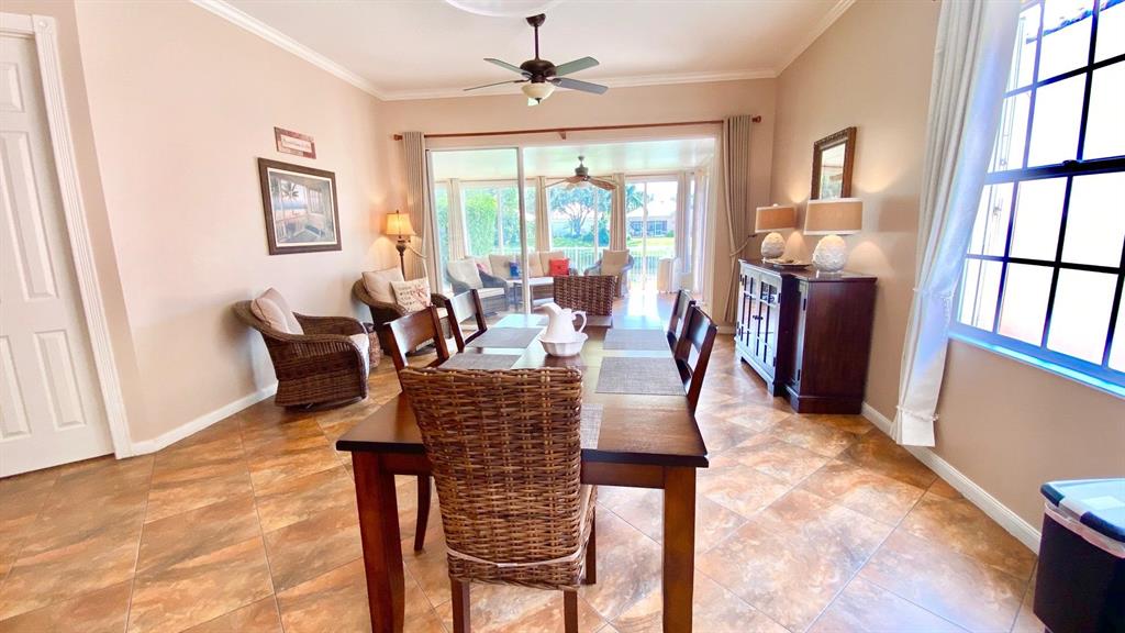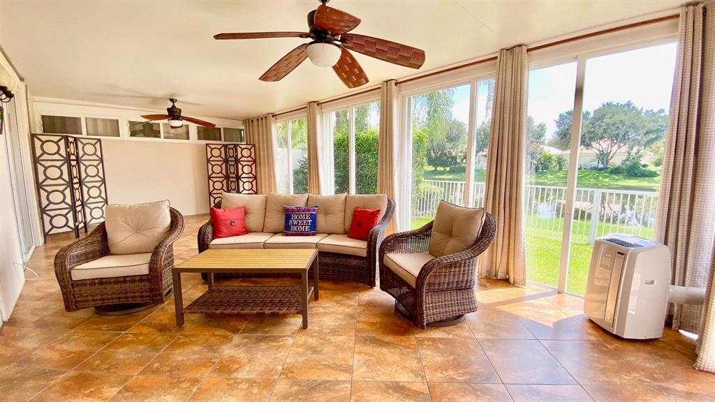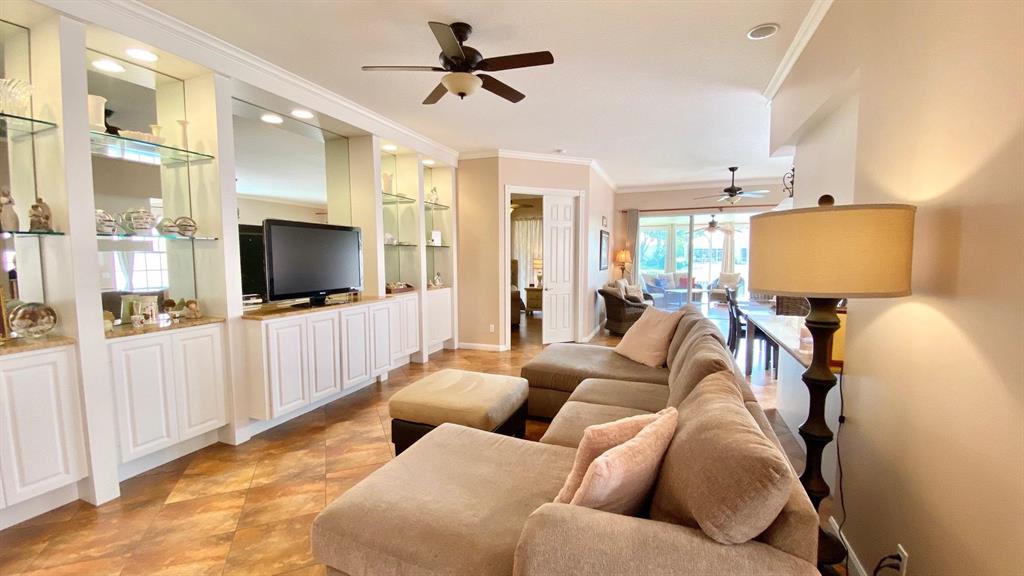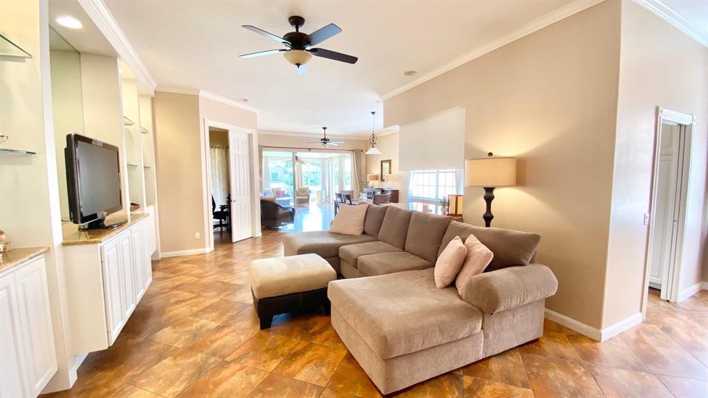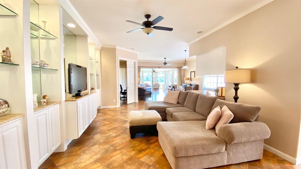 Step into this beautiful ''expanded'' Glenwood and you'll be impressed by the spacious layout where the living room flows to the dining, kitchen and then the wonderful Florida room/lanai which has a multitude of uses, morning coffee room/art studio/yoga retreat! This home has been lovingly cared for and boasts many upgrades. Custom tile flooring throughout, crown molding, granite counters (kitchen/bathrooms/laundry), built in entertainment center, updated a/c and appliances and more! There are brick pavers creating a courtyard on the side of the property which offers plenty of outdoor decorating options plus a grassy backyard, completely fenced in with a serene water view down the long lake leading towards Town Center.