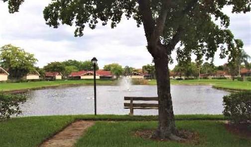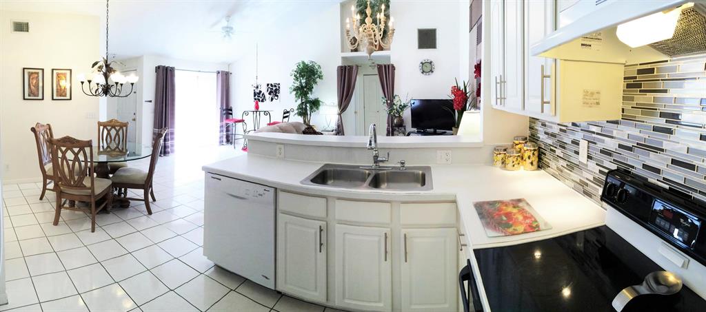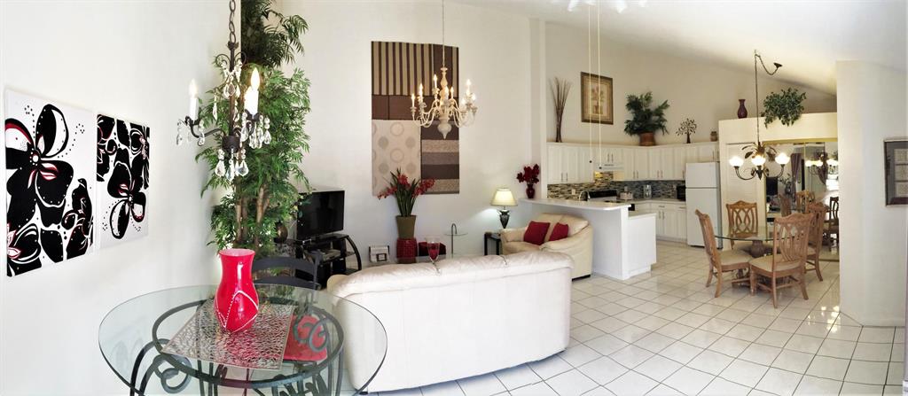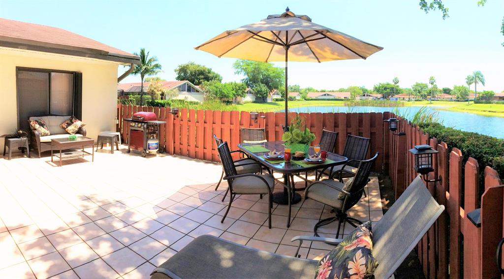 Nicely updated & airy + cathedral ceiling, A-1 condition 2 bedroom 2 bath corner villa/townhouse, with very private 24' water frontage fenced terrace, all tile, quartz and marble counter tops, modern kitchen cabinetry, W/D, 3 sliding doors, A/C 2014, W/H 2019. Close to 1-95 and downtown WPB. Assigned parking, low HOA's,