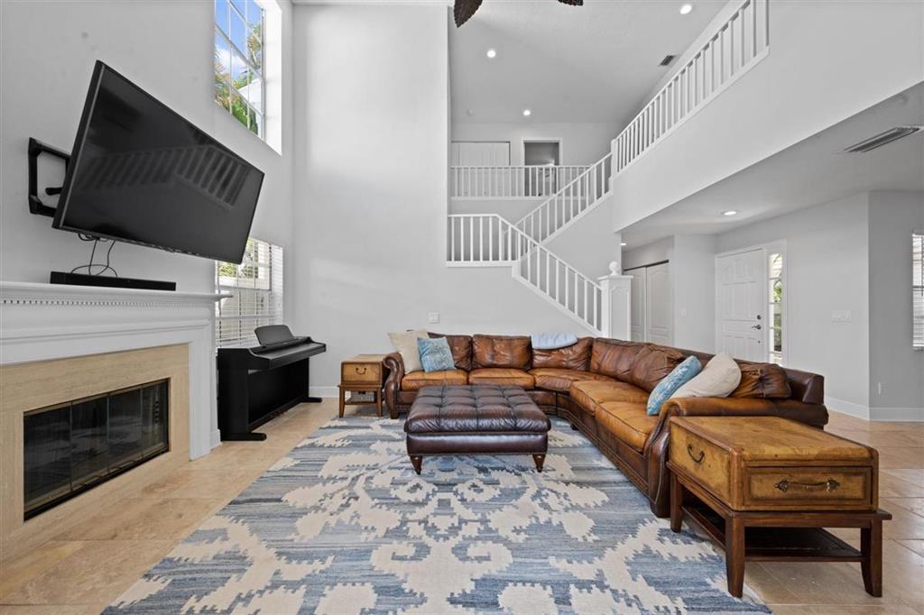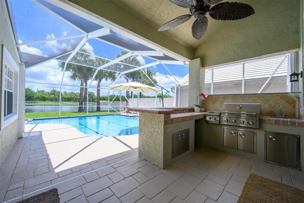 Stunning LAKEFRONT home in Breakers West in West Palm Beach. Large screened patio with lovely pool overlooks scenic lake. Updated within last 4 years, this beautiful home features NEWER ROOF (2017), living room with high ceilings, fireplace along with stone flooring throughout main living areas. Chef's kitchen with white shaker style cabinets & stainless steel appliances opens for sunny family room. French Doors from the kitchen open to the built-in summer kitchen and bar area for convenient outdoor grilling. With spacious living areas on main floor and all the bedrooms upstairs, this floor plan provides privacy and seclusion for the bedrooms from the common areas downstairs. Master Suite is a peaceful retreat with its vaulted ceilings, 2 large closets & spa-like Master Bath