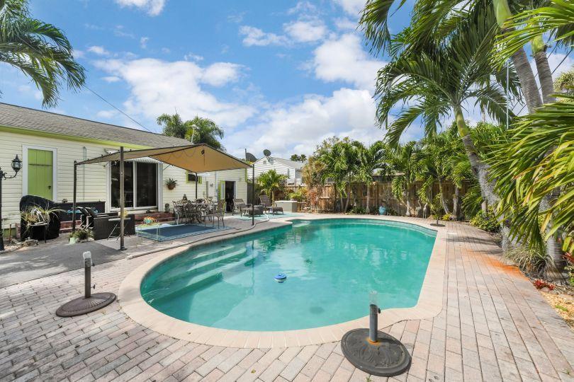 Charming pool home in West Palm Beach just minutes from the Intracoastal, I-95, the airport and gorgeous area beaches. As you approach you will notice the lush landscaping, attached garage and welcoming, screened-in porch. Come inside and be greeted by spacious living areas with gorgeous flooring throughout along with an inviting, eat-in kitchen. Both bedrooms are spacious as well. Step outside and enjoy a lovely patio overlooking the serene pool and very private backyard. This lushly landscaped yard also offers a storage shed.