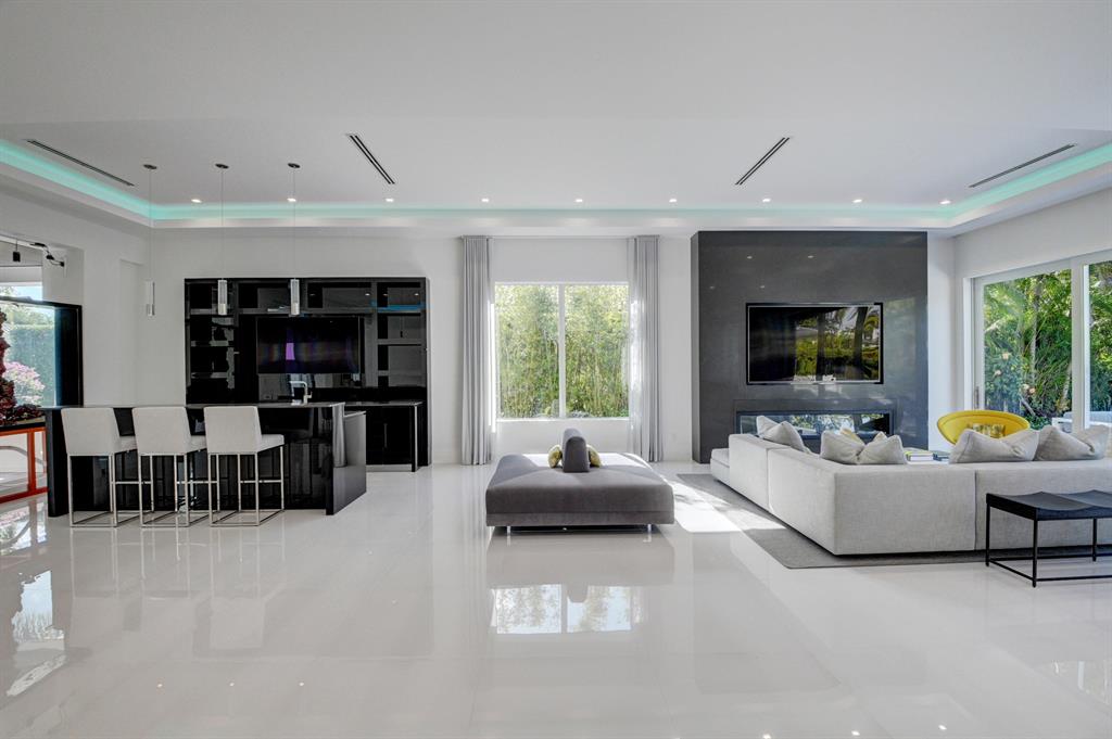 This modern, one-story (NO STEPS), 5 bedroom + office home is completely renovated down to the studs! Custom built with the highest quality finishes and upgrades, the renovation was just completed in January 2020. The home is being offered fully furnished. Master suite has a spacious, separate sitting room and his & her baths, with a steam shower in his bath. All guest bedrooms are ensuite. Gourmet eat-in kitchen with Sub Zero fridge, Miele induction cooktop, convection oven and microwave. Upgrades include Savant smart home automation system, camera surveillance system, electric solar shades, impact glass, custom cabinets, custom lighting, all new flooring, new roof, and more. Outside is a lushly landscaped private backyard with sprawling golf course views.