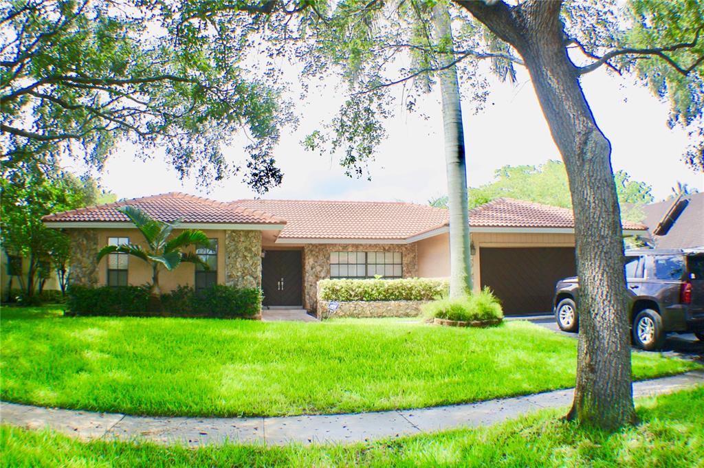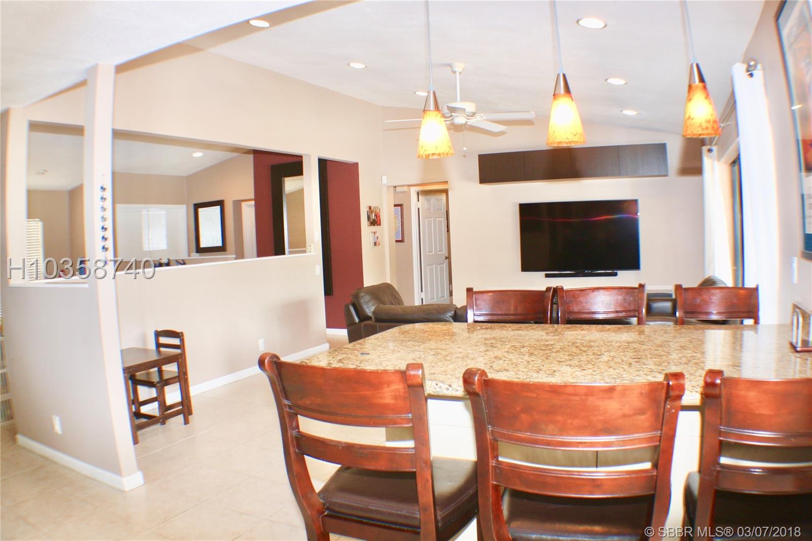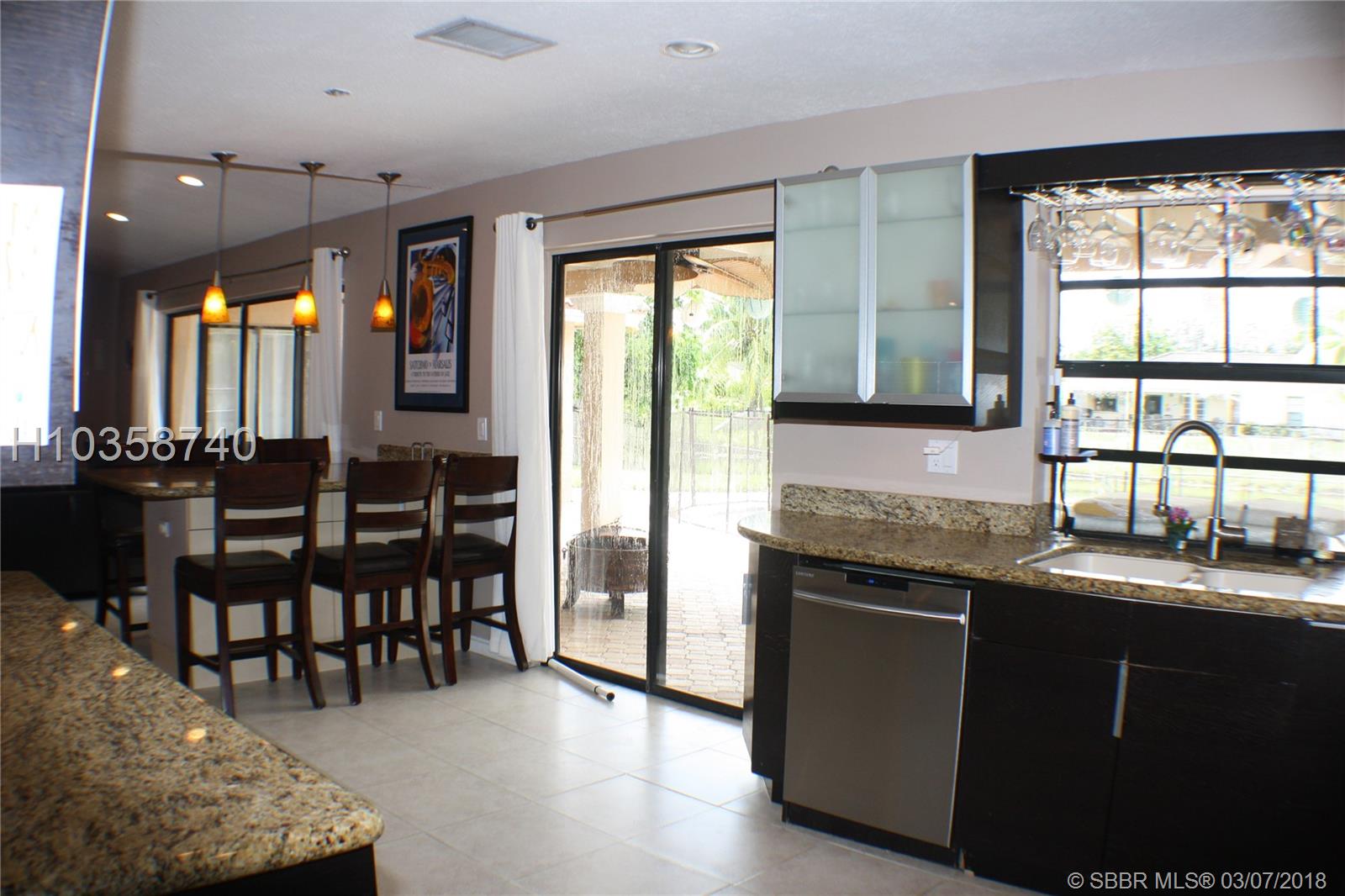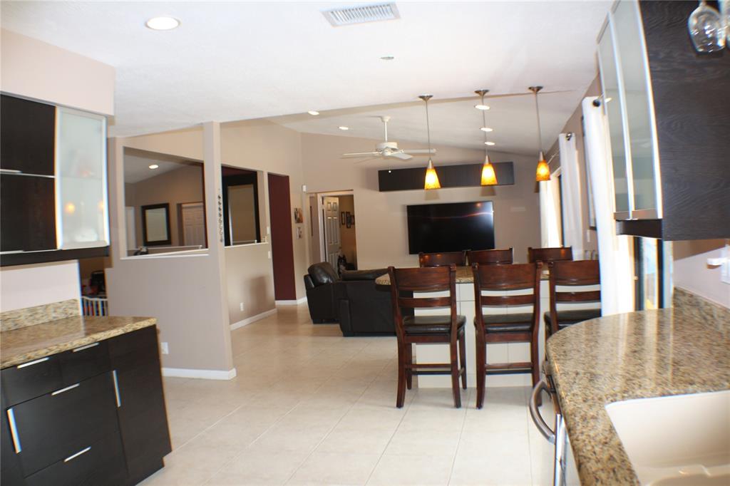 Spectacular open floor plan, vaulted ceilings, tiled flooring throughout living and kitchen, wood laminate in bedrooms and laundry room, updated kitchen with granite countertops and stainless steel appliances, modern fixtures in bathrooms. Samsung washer and dryer, and extra refrigerator in garage. Located on nicely landscaped waterfront lot and cul-de-sac street. Barrel tile roof 2009, Pool resurfaced 2016. This is one not to miss! Motivated Seller!