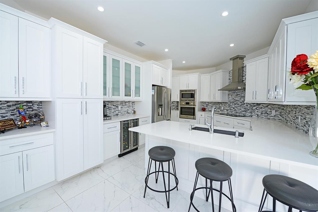 Magnificent renovation. Totally gutted down to the studs. Smooth Ceilings and walls. All white kitchen with Bosch appliances and white quart counters. New custom staircase with steel railings. HIGH end bathrooms. 42 new LED high hat lighting. 2 overly large guest bathrooms with new Jack and Jill Bathroom. 18 inch porcelain tiles throughout. Private back yard with new fencing, resurfaced pool, new pavers and new equipment. Roof @ 6 years old. Shows like a designer model home. Picture Perfect.