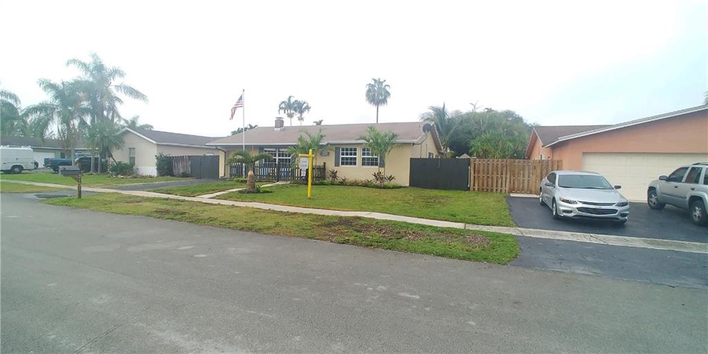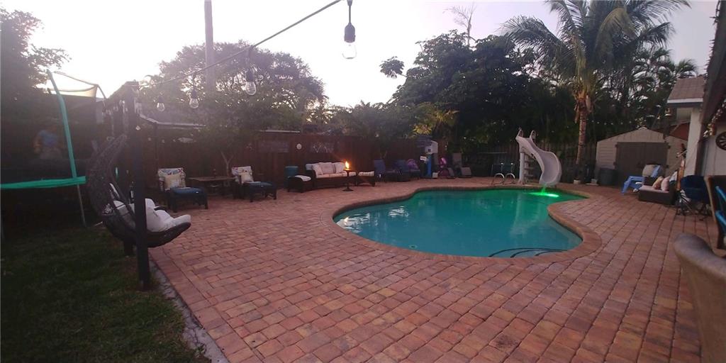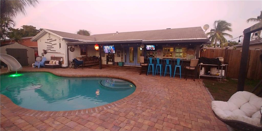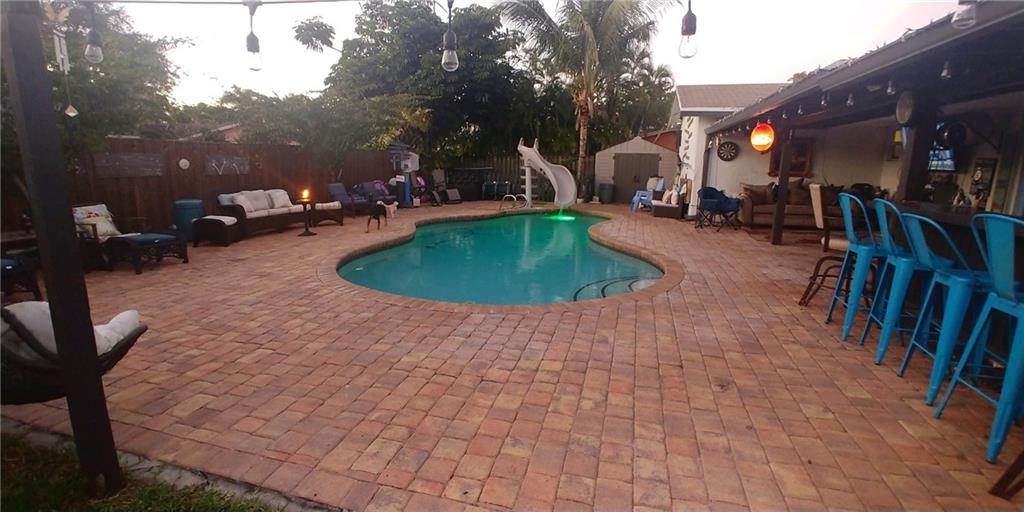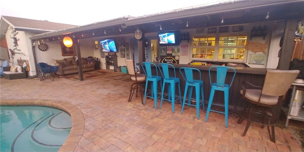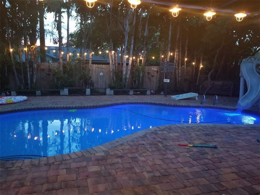 Look no further! This house has it all!! Relax in your serene tropical backyard by the salt water pool and entertain with your own built in bar on the patio. This 4 bedroom 2 bath home features many many upgrades! Beautiful new kitchen with all new stainless steel appliances, functional wood burning fireplace, tile floors throughout, hurricane impact windows, two sheds in back, side yard large enough to store camper or boat, newer a/c, living and family room, Pool completely remodeled less than 3 years ago, kitchen remodeled one year ago. NO HOA
